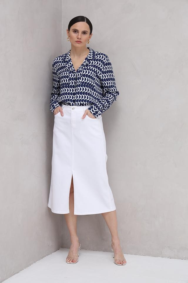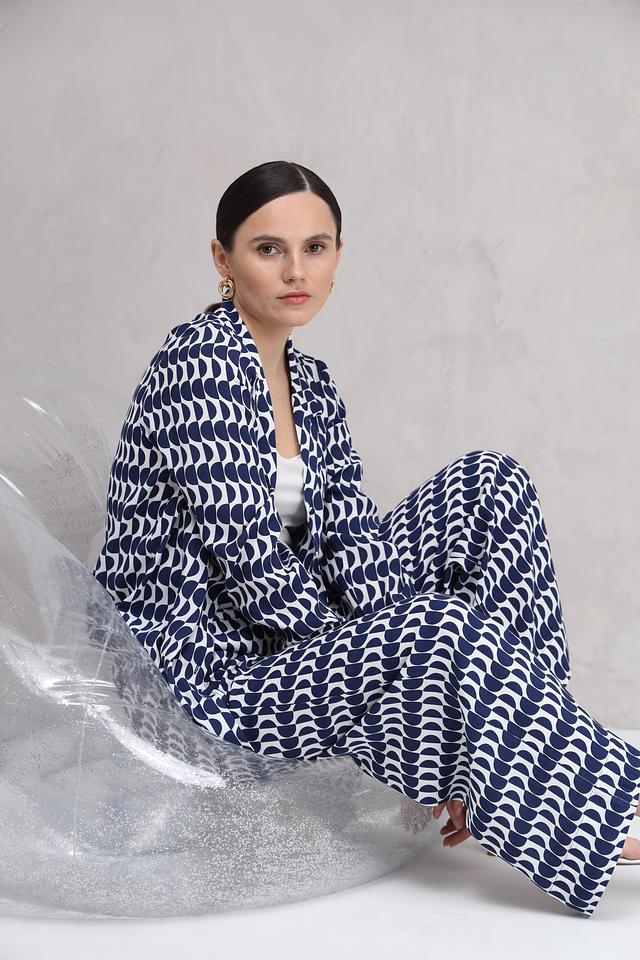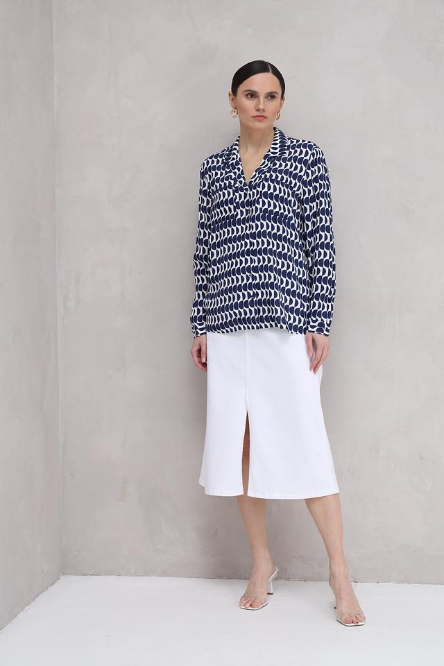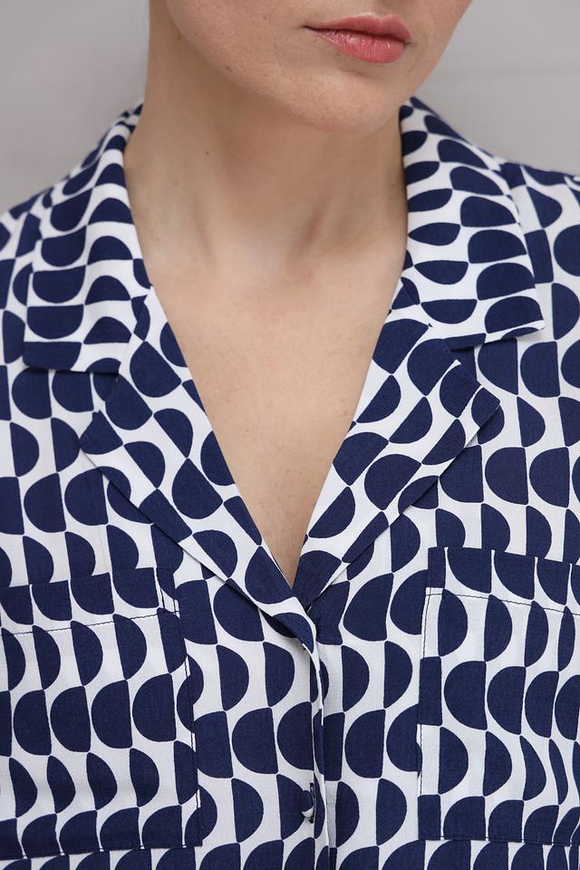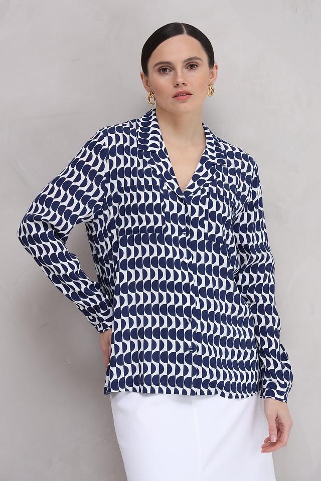 Особенностью данной модели является яркий геометрический принт в синих и белых тонах, который придает блузе оригинальность и выразительность. Классический крой с V-образным вырезом и длинными рукавами делает ее универсальной и подходящей для различных случаев.