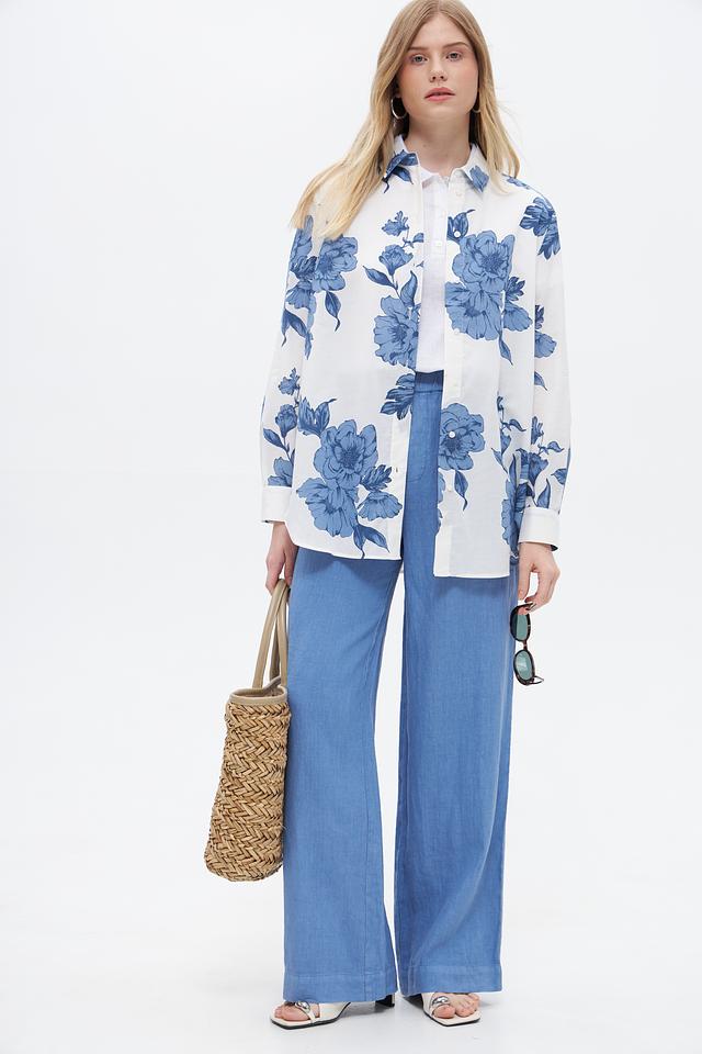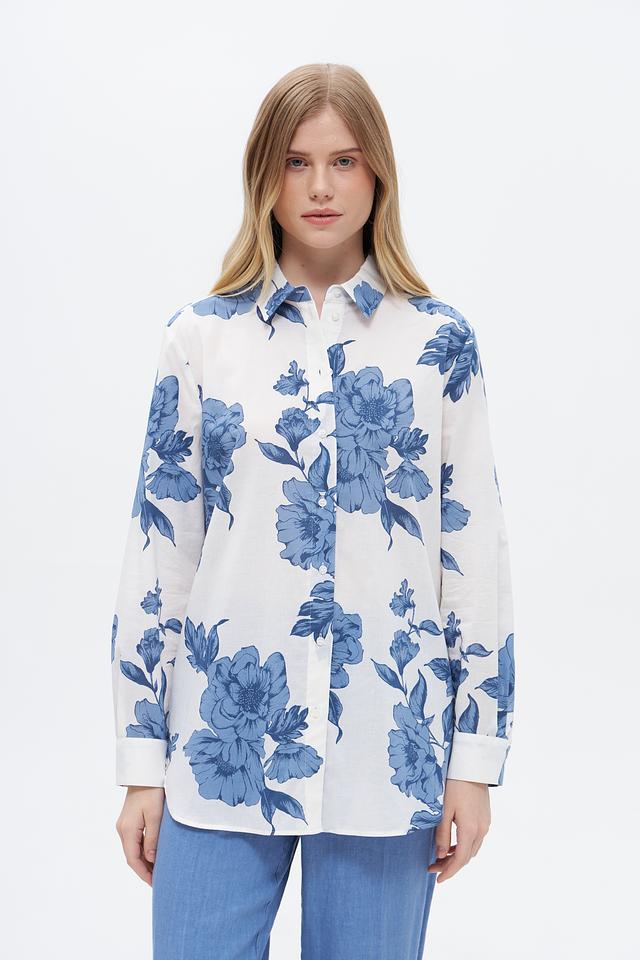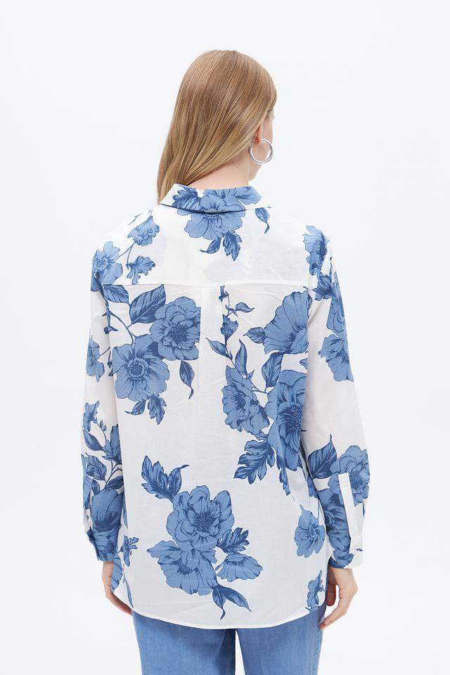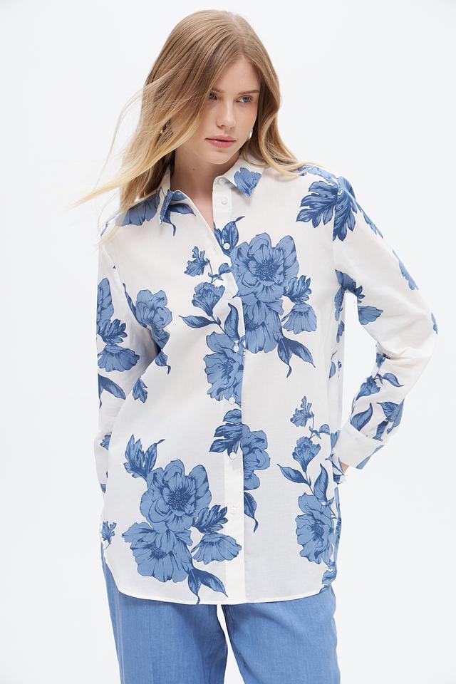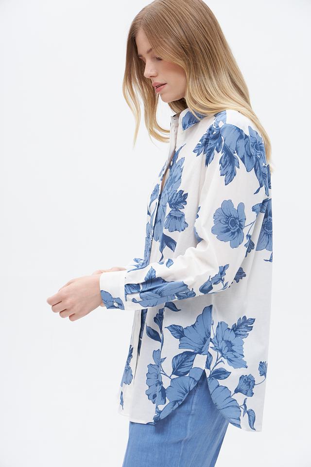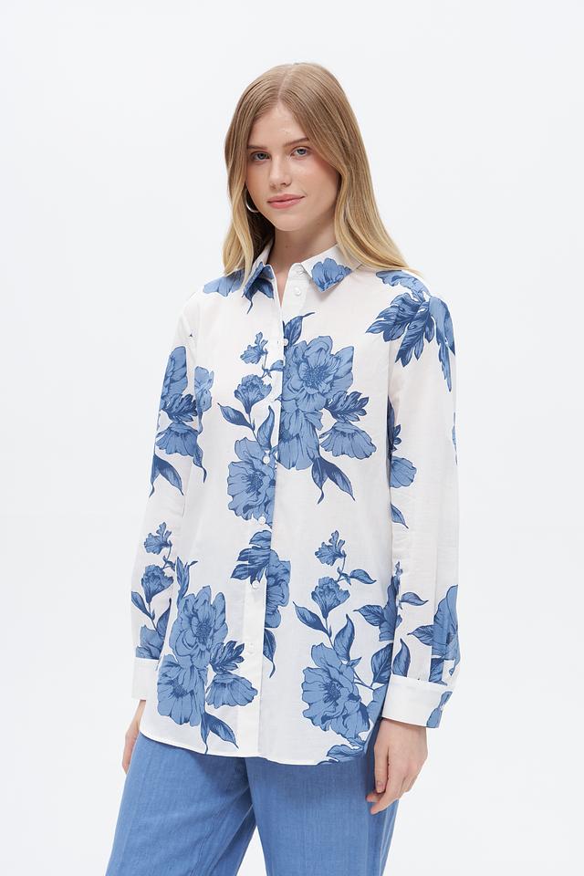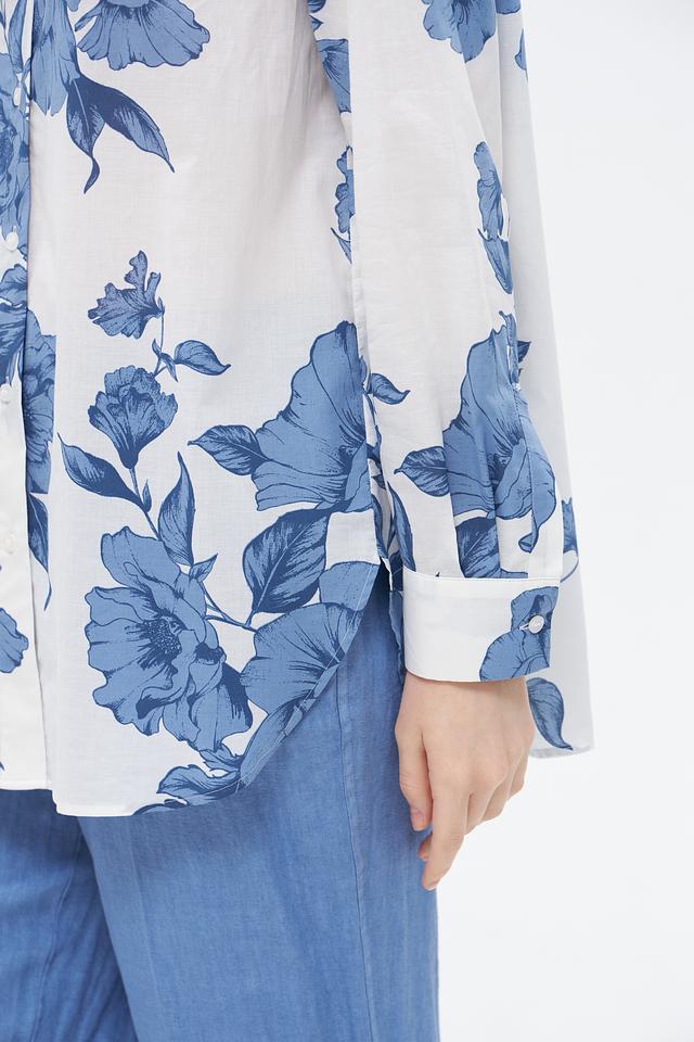Блузка имеет классический крой с длинными рукавами и отложным воротником. Её украшает яркий цветочный принт в голубых тонах на белом фоне, который придаёт ей свежий и женственный вид.
