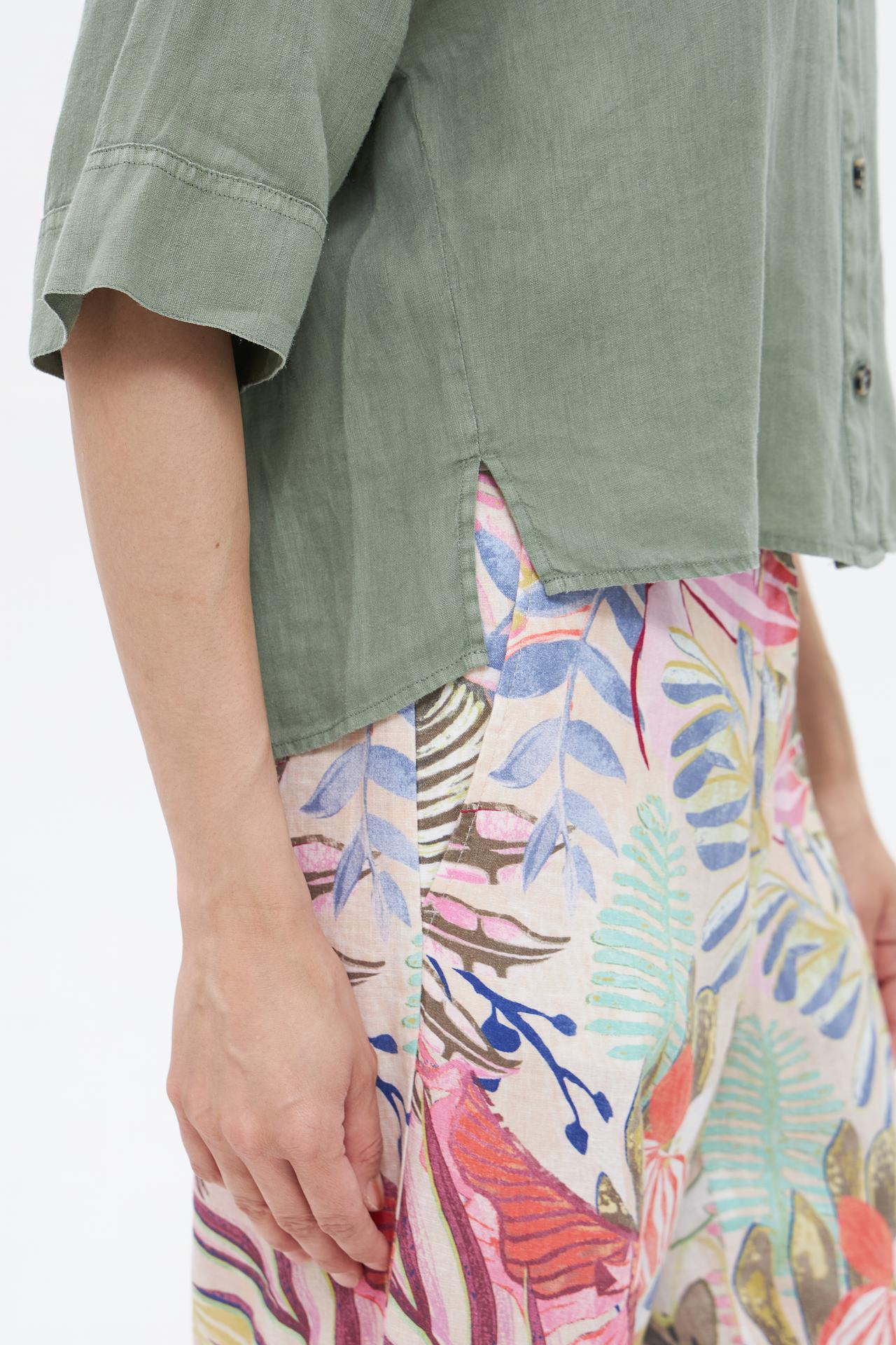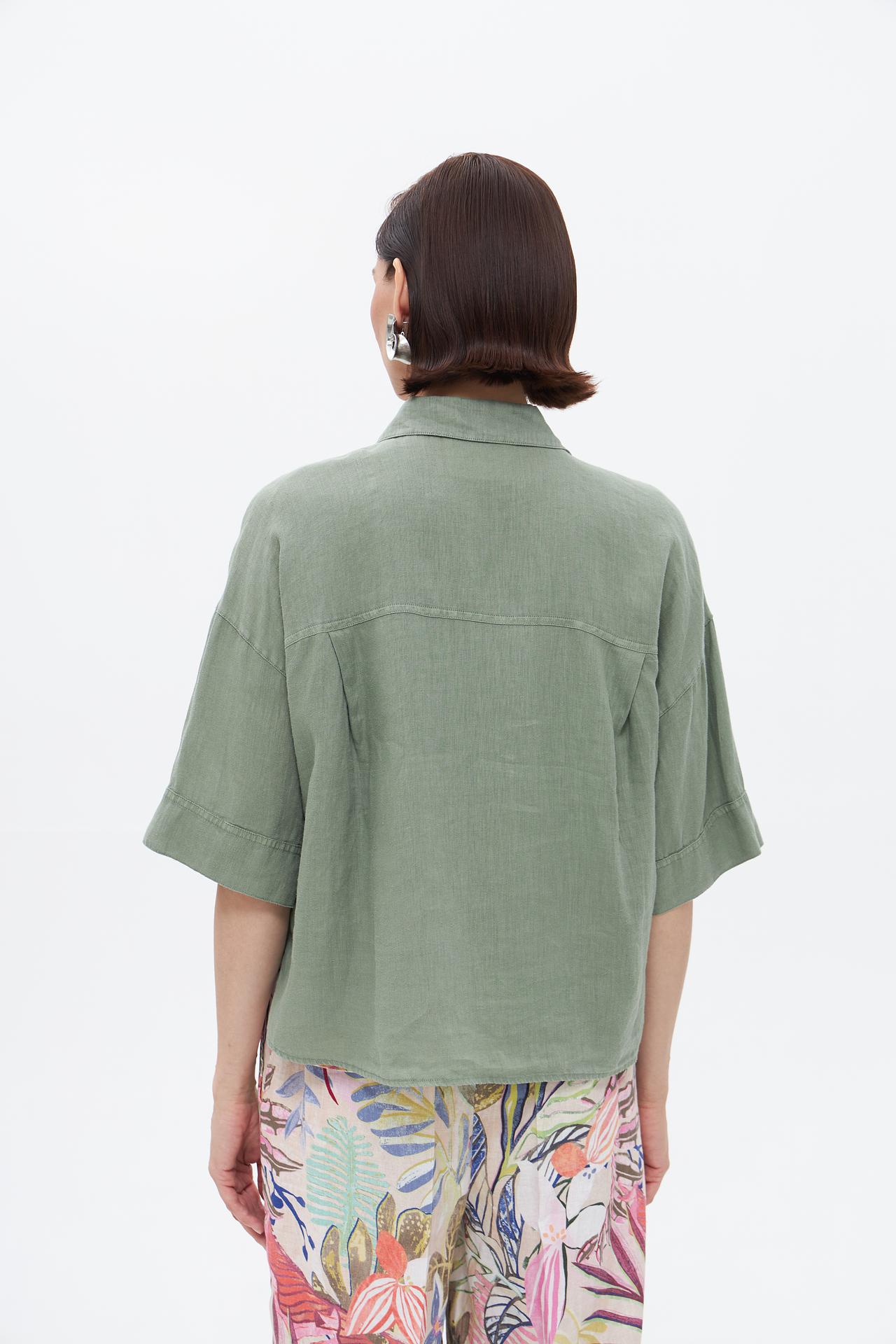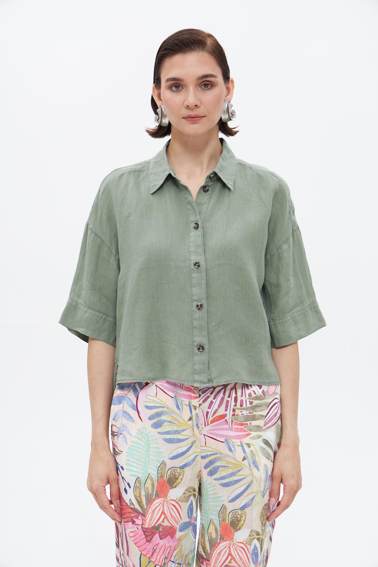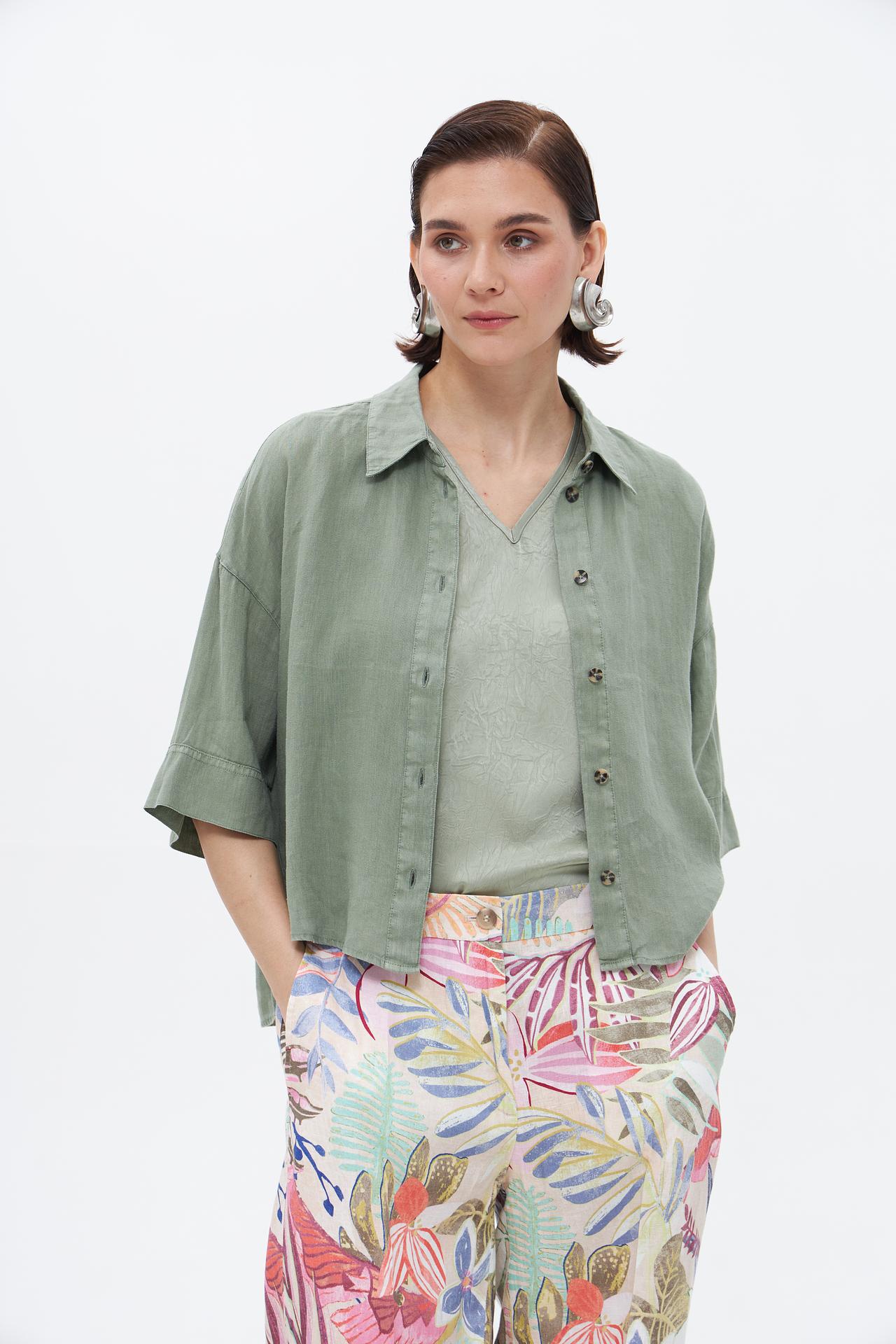 Блуза Oui лен, рубашечный крой, оливковый цвет