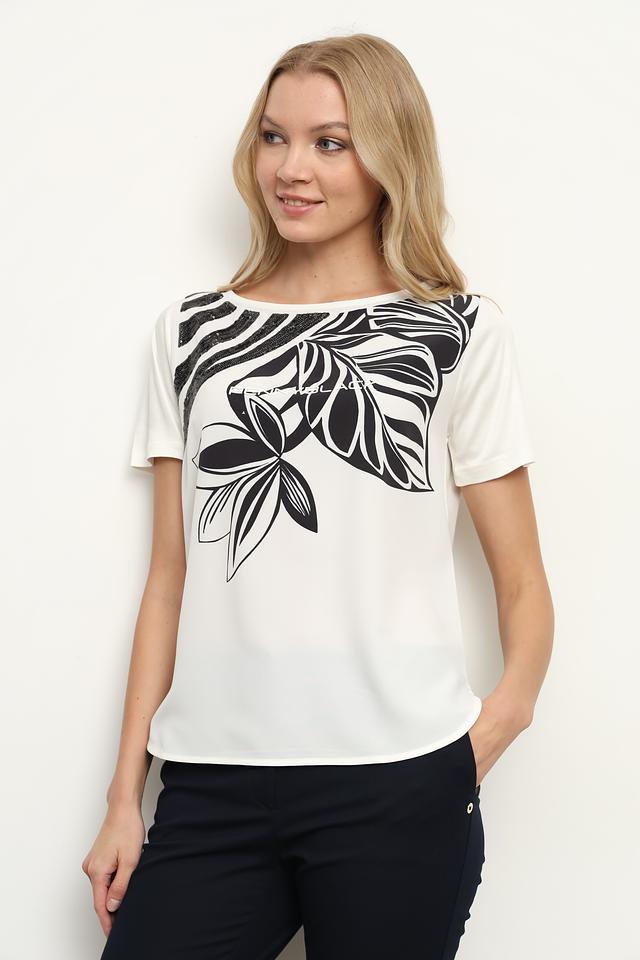 Эта блуза от Penny Black выполнена в белом цвете и украшена эффектным чёрно-белым принтом с изображением тропических листьев и цветов. Модель имеет короткие рукава и свободный крой, что обеспечивает комфорт и свободу движений.
