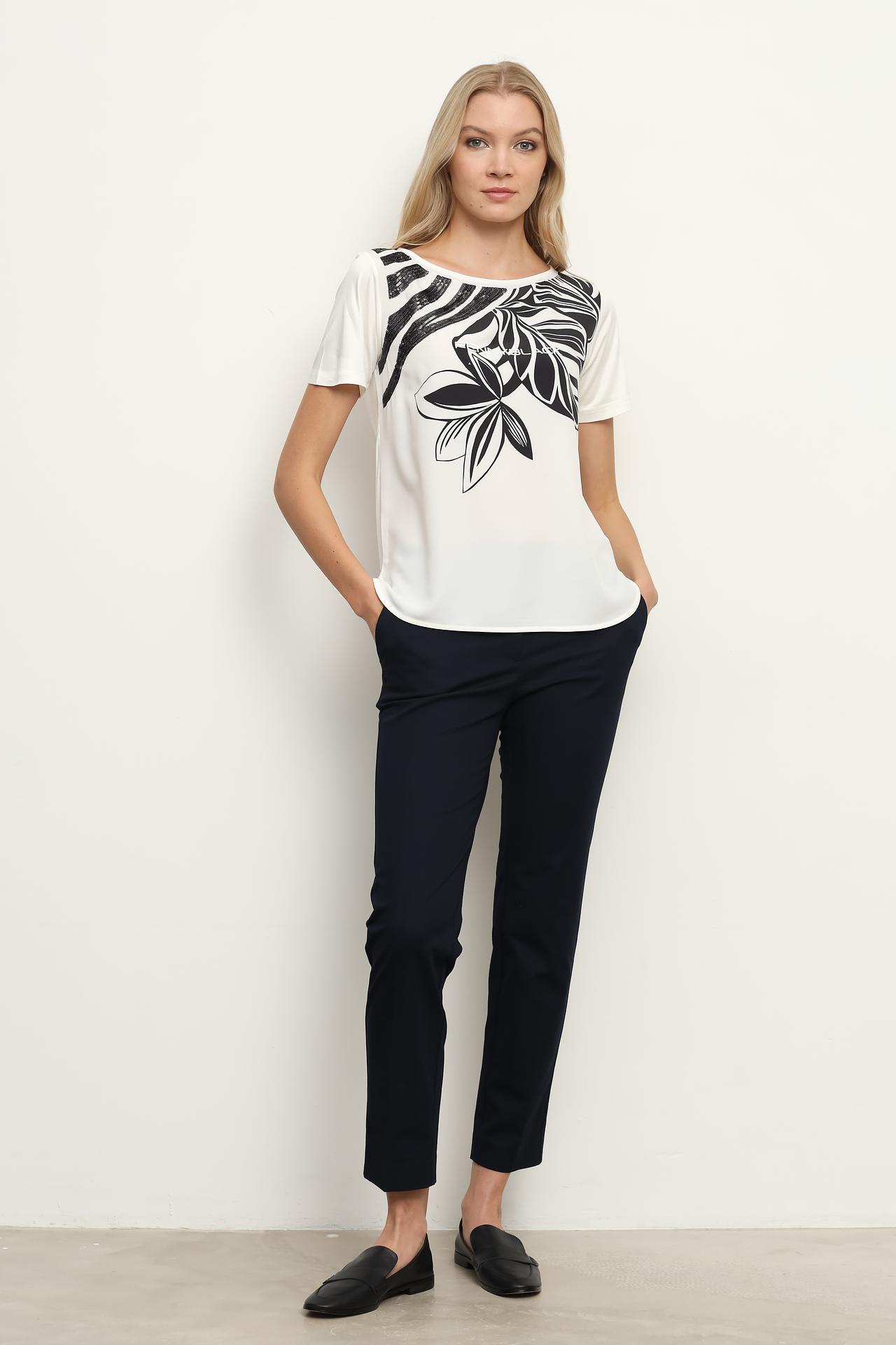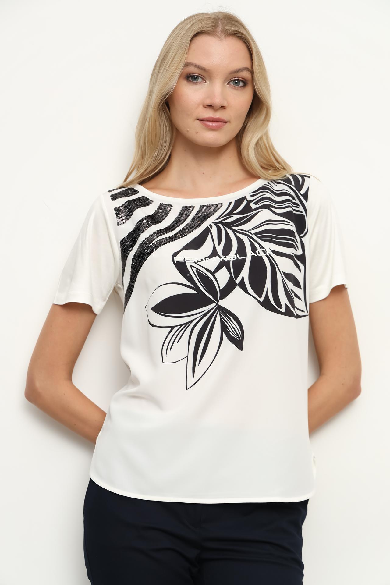 Элегантная блуза из легкой вискозы – идеальное решение для создания стильного и комфортного образа. Блузка молочного цвета украшена эффектным черно-белым принтом и деликатными пайетками, добавляющими изысканности. Эта блуза прекрасно подойдет как для повседневного гардероба, так и для особых случаев. Универсальный крой и приятная к телу ткань обеспечат удобство в течение всего дня.