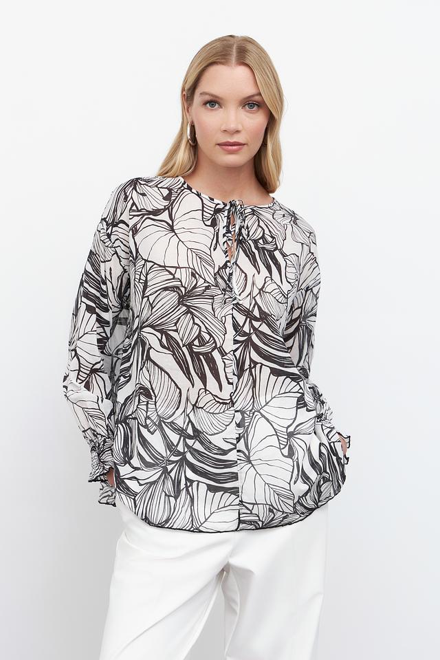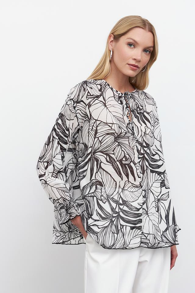 Блуза Pezzo чёрно-белого цвета с оригинальным принтом в виде листьев станет стильным дополнением к вашему гардеробу. Модель выполнена из 100% хлопка, что обеспечивает комфорт в носке. Состав: хлопок 100%