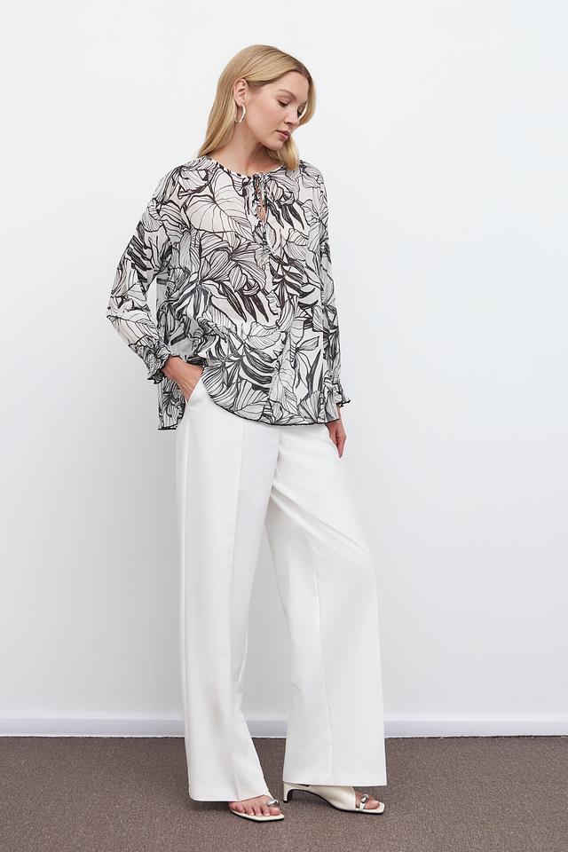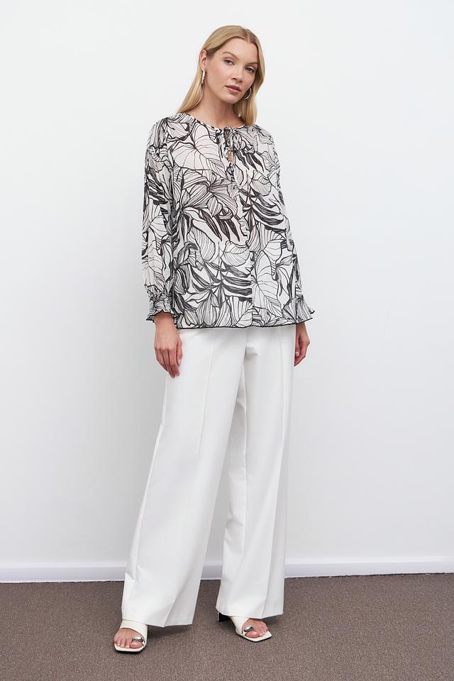 Модель имеет свободный крой, который обеспечивает комфорт и свободу движений. Длинные рукава дополнены манжетами с небольшими оборками, придающими блузе романтичный вид. Вырез горловины оформлен небольшим завязкой, что позволяет регулировать глубину декольте.