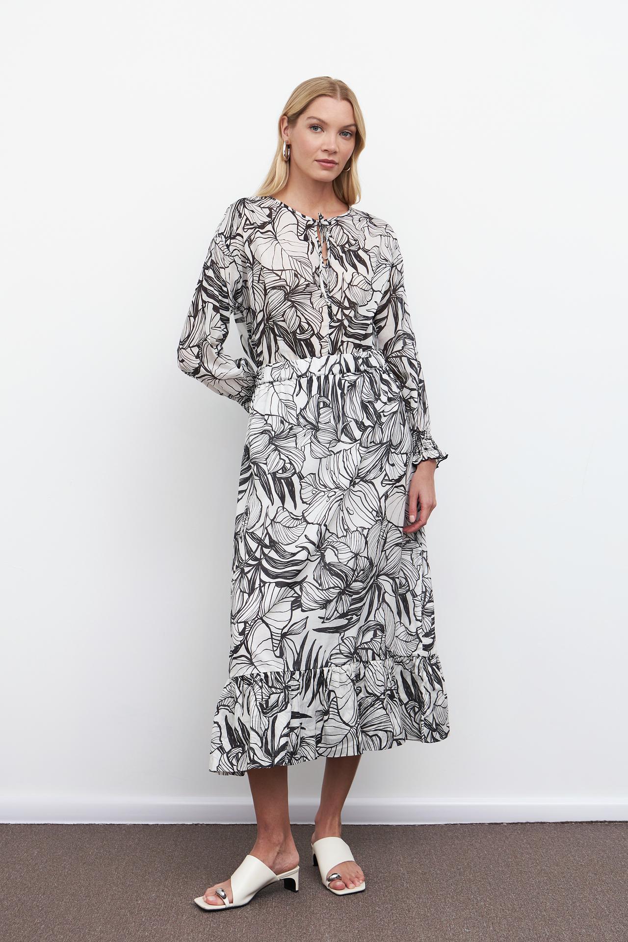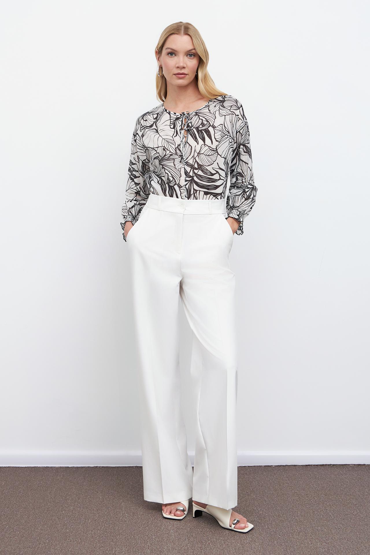 Блузка с длинными рукавами с эластичными манжетами и круглым вырезом горловины на завязках, украшена стильным принтом. Эта блуза добавит изысканности и шарма вашему повседневному или вечернему образу.