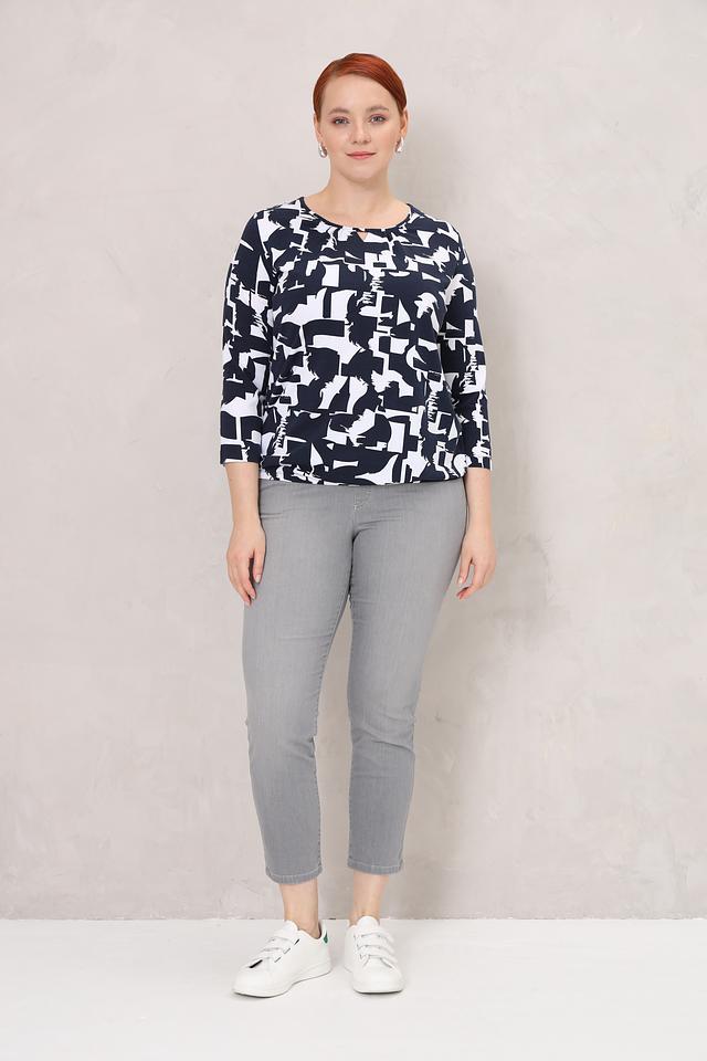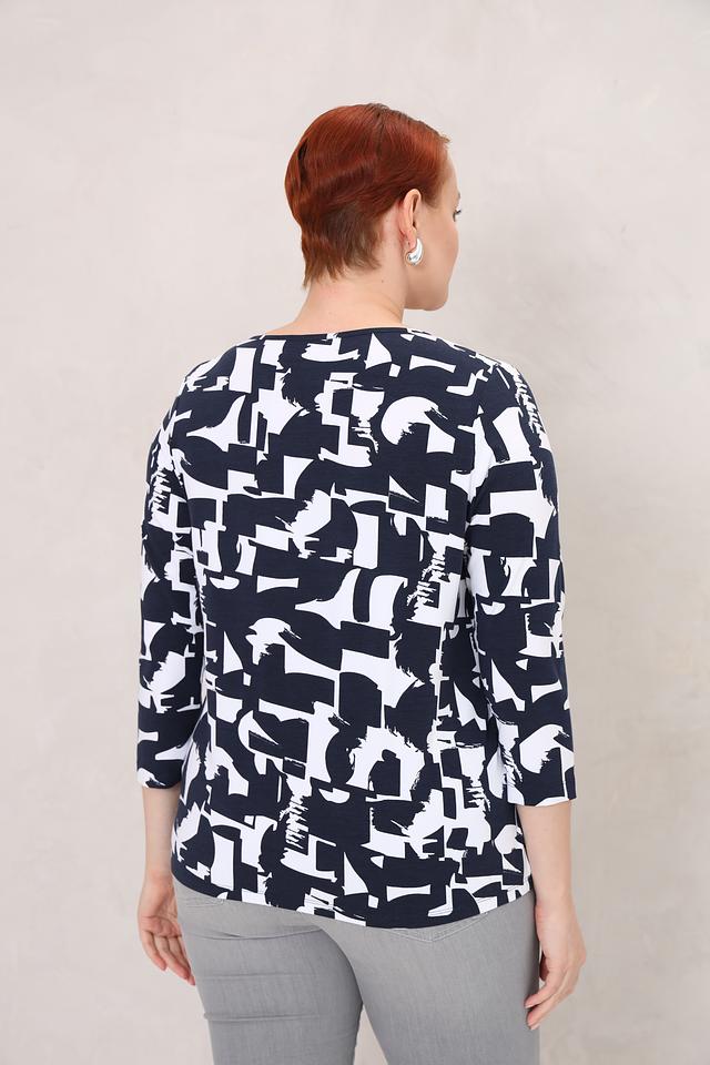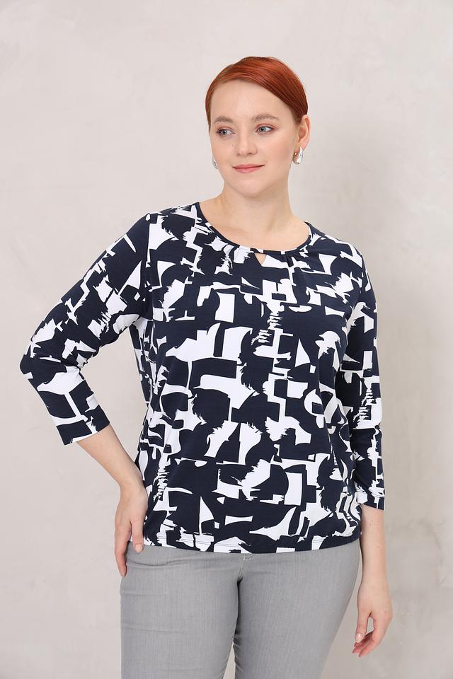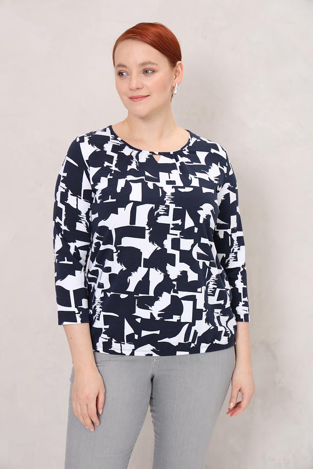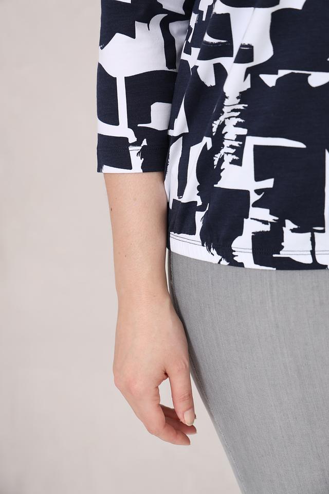 Стильная блуза Rabe collection темно-синего цвета с оригинальным геометрическим принтом. Модель выполнена из мягкой и приятной к телу ткани, обеспечивающей комфорт в носке. Идеально подойдет для создания повседневных образов. Состав: хлопок 47%, модал 47%, эластан 6%