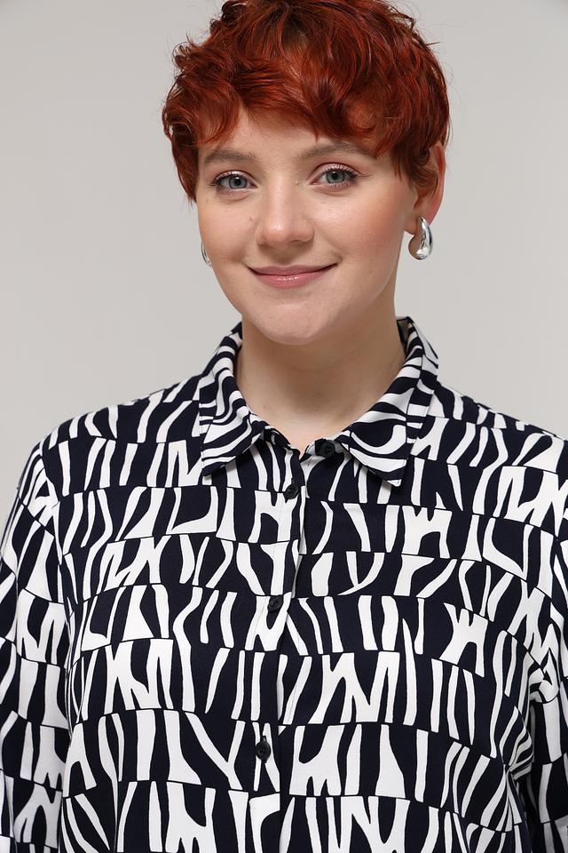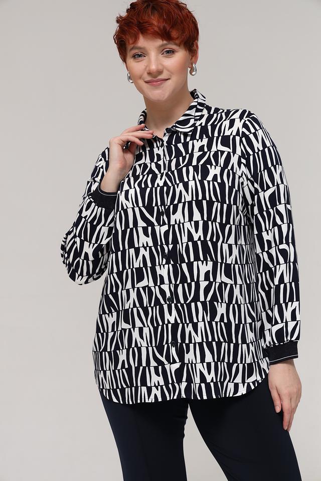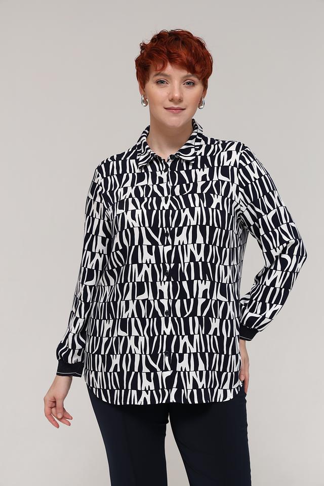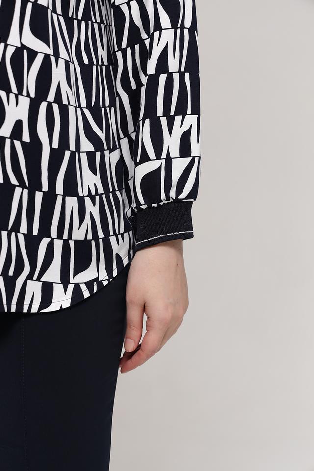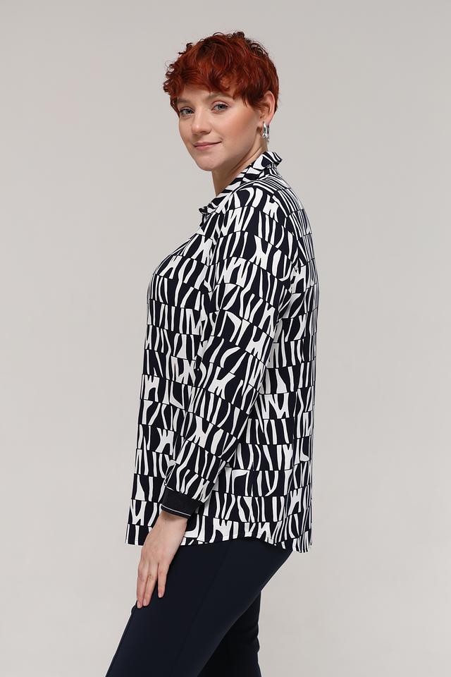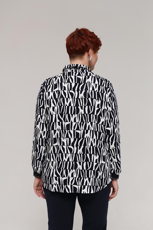 Особенностью данной модели является яркий геометрический принт в чёрно-белой гамме, который привлекает внимание и делает образ запоминающимся. Блузка идеально подходит для создания как повседневных, так и более нарядных образов. Сочетайте её с брюками, юбками или джинсами, чтобы создать свой неповторимый стиль.