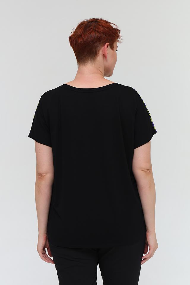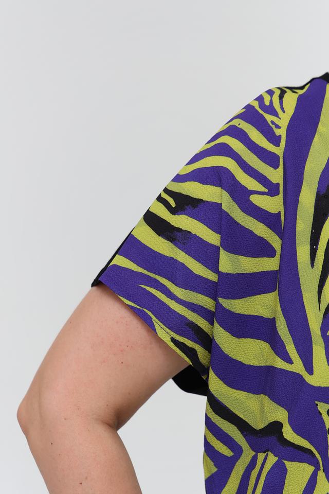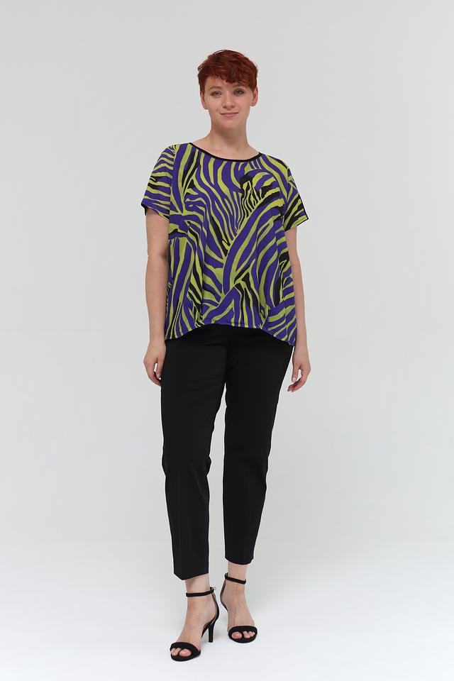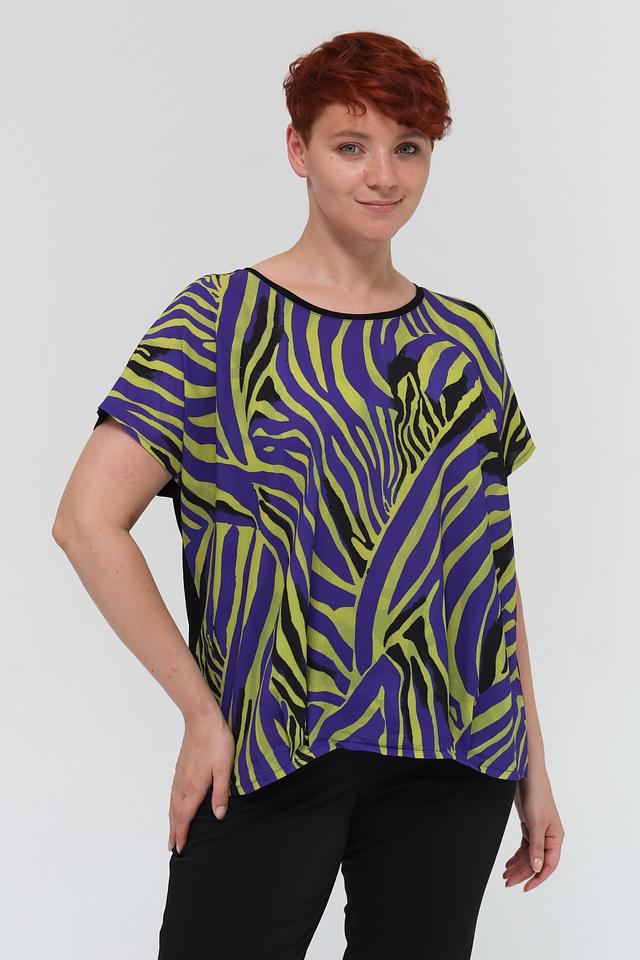Блуза имеет свободный крой, короткие рукава и округлый вырез горловины. Главная особенность модели – эффектный принт в виде зебры, выполненный в сочетании фиолетовых, зелёных и чёрных оттенков. Такой рисунок добавит динамики и оригинальности вашему образу.