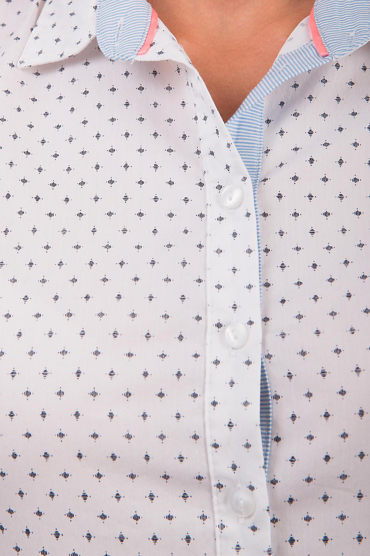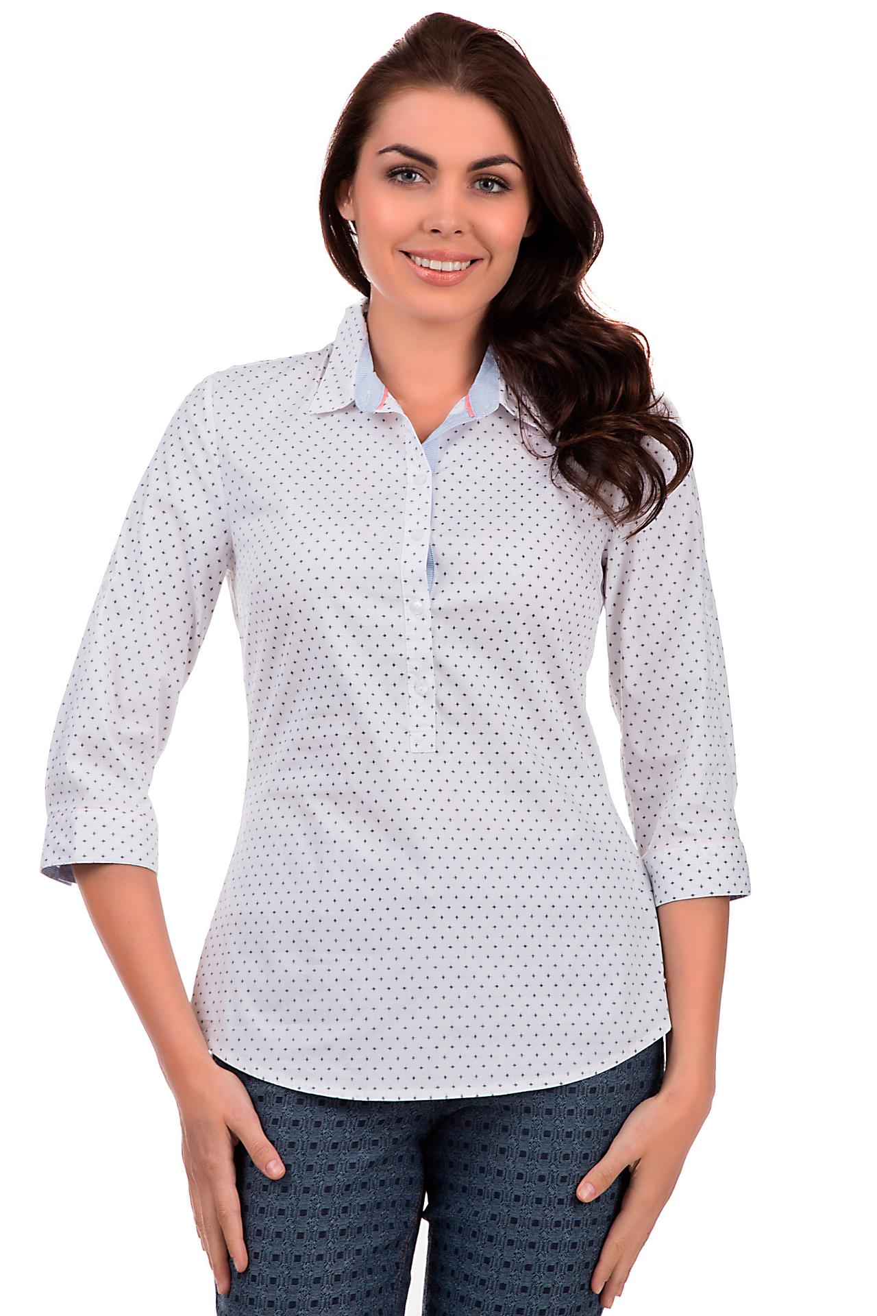 - Дизайн: Привлекательный мелкий горошек на белом фоне. Детализированный воротник с контрастной синей полоской и небольшой декоративной планкой.