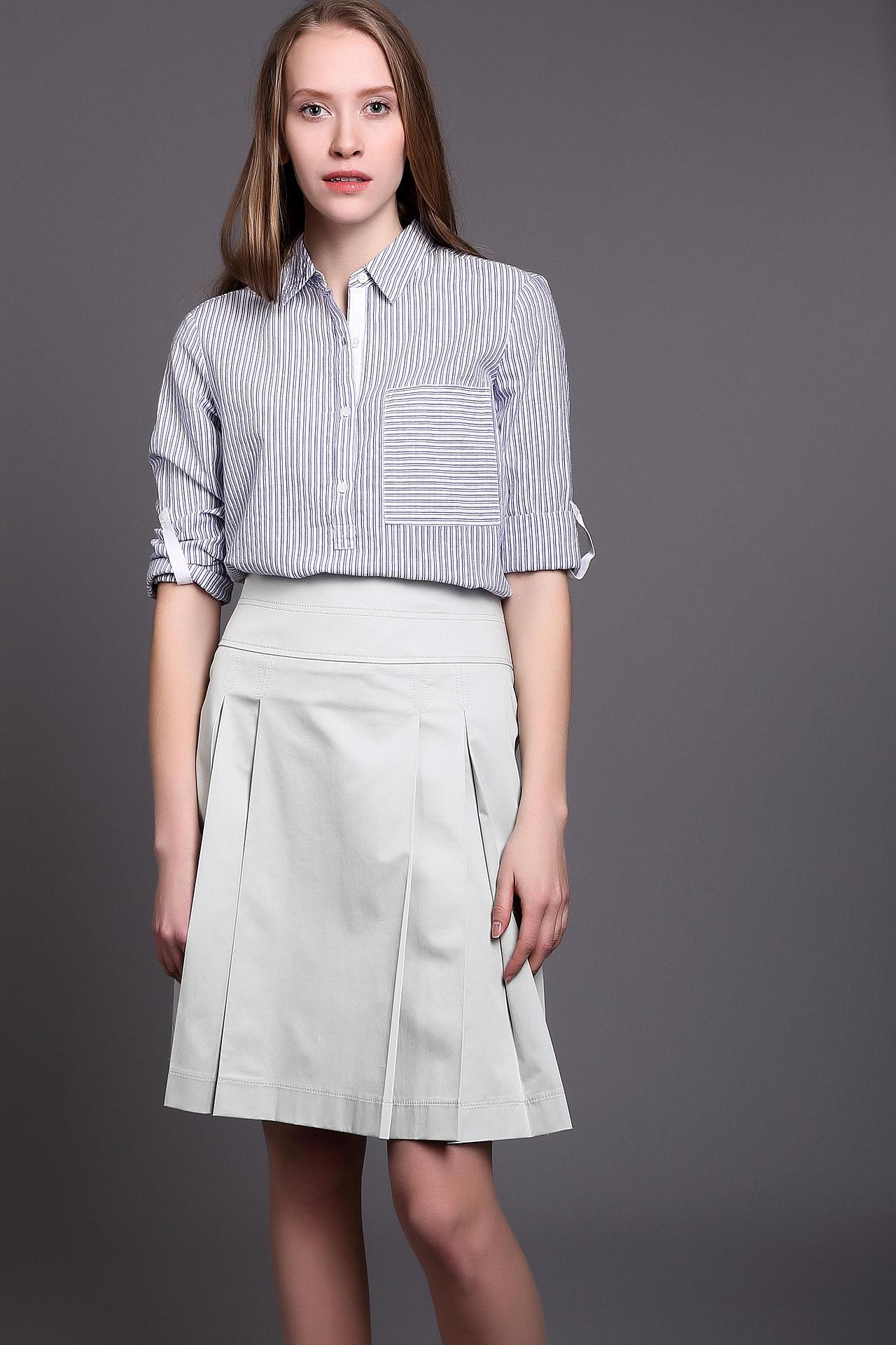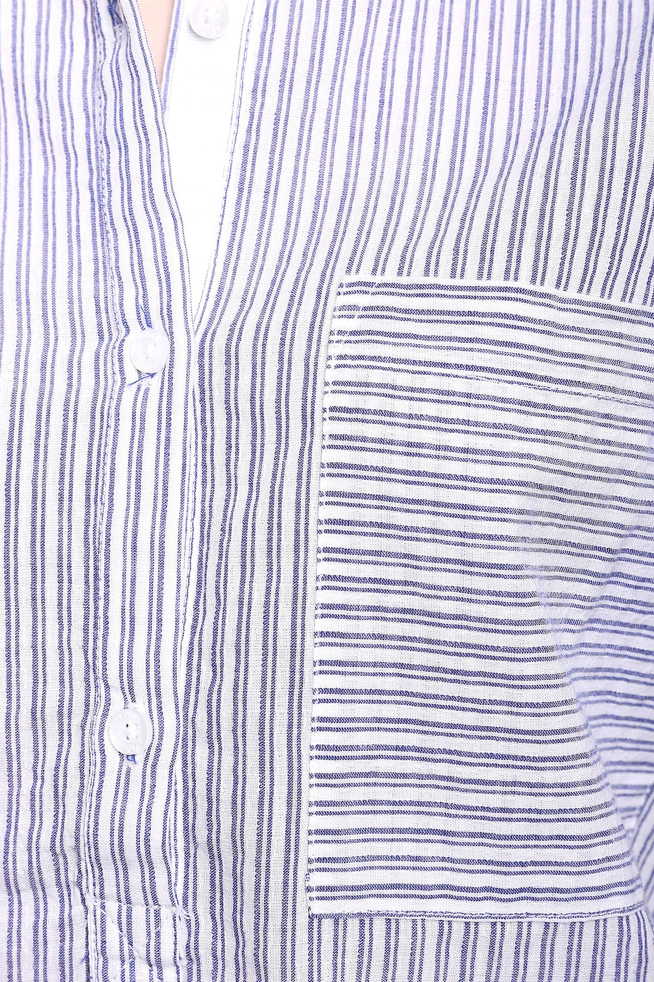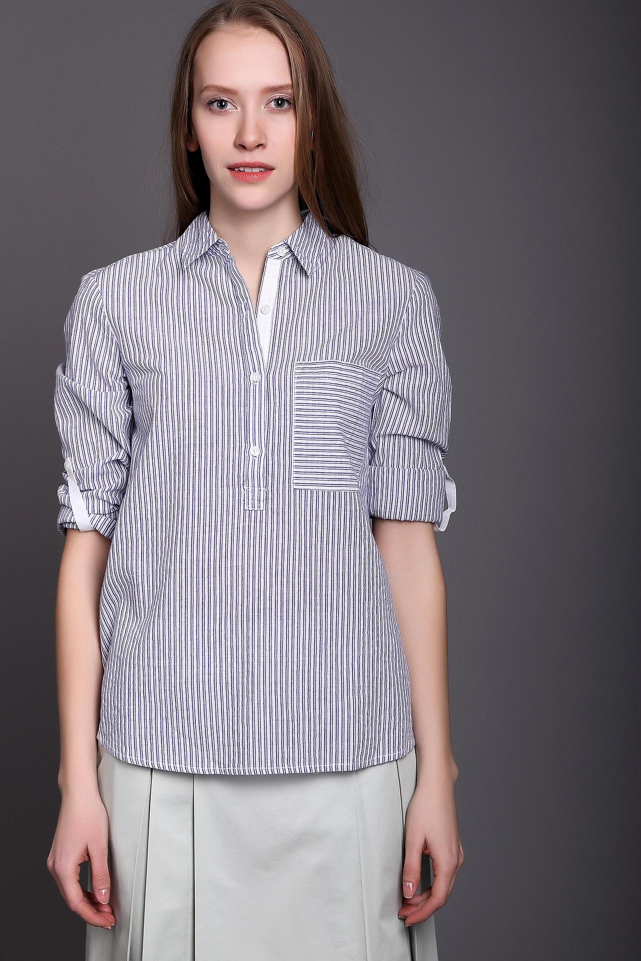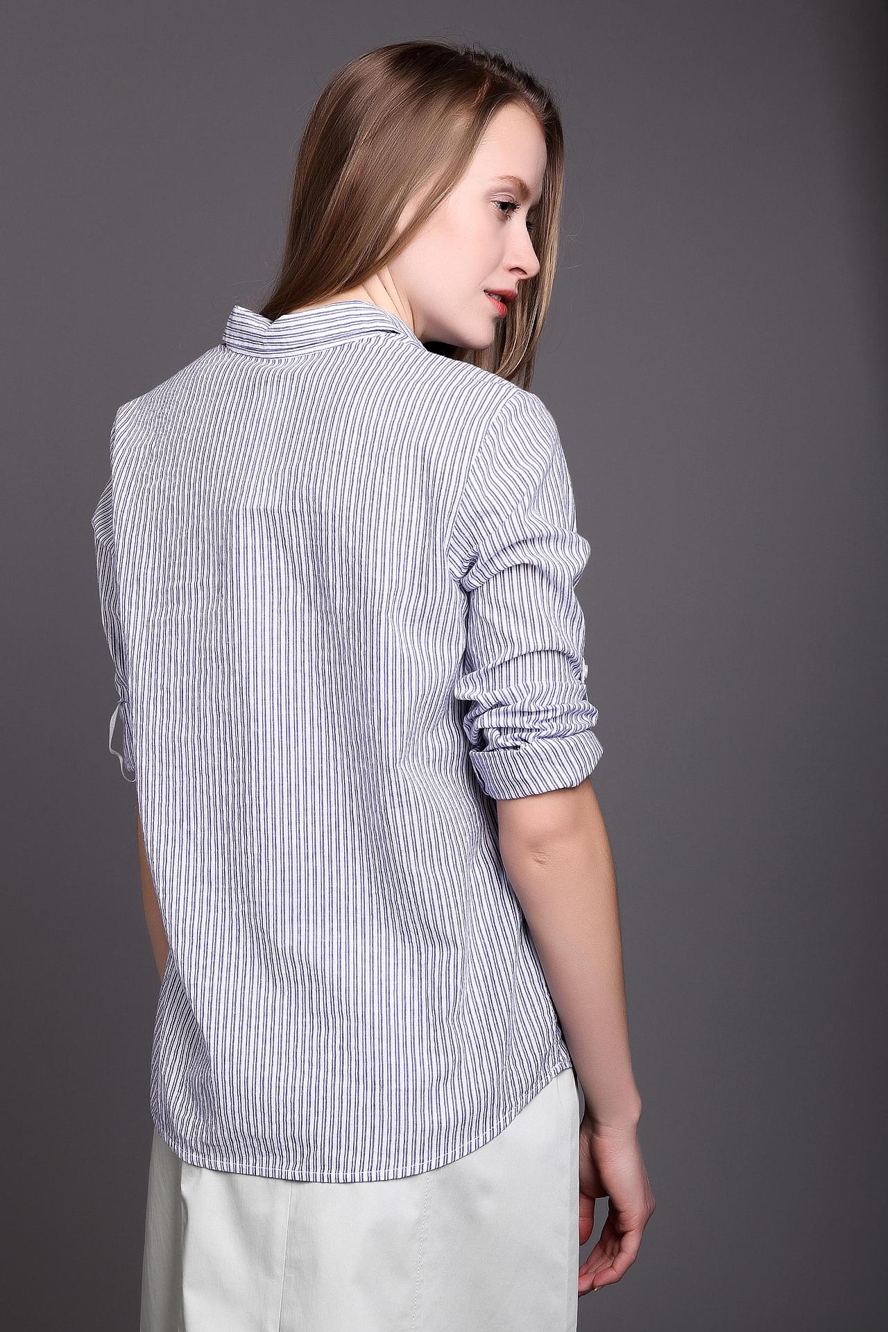 Блуза имеет классический крой с воротником и длинными рукавами, которые можно подвернуть и зафиксировать. Вертикальная полоска визуально стройнит и делает силуэт более утонченным. Качественный хлопок обеспечивает отличную воздухопроницаемость, что делает блузу идеальной для теплых дней.