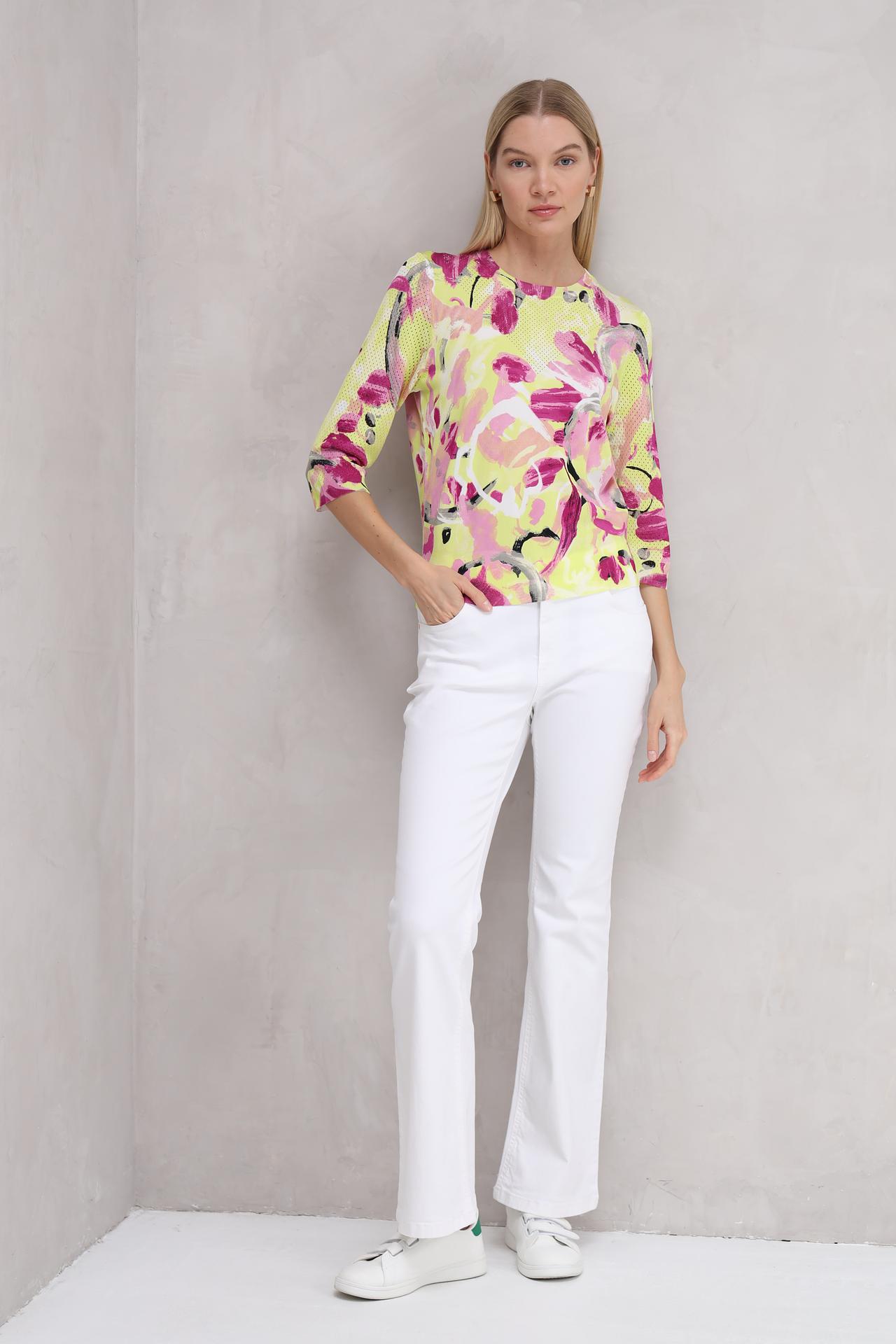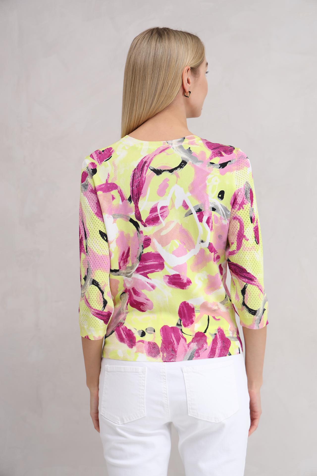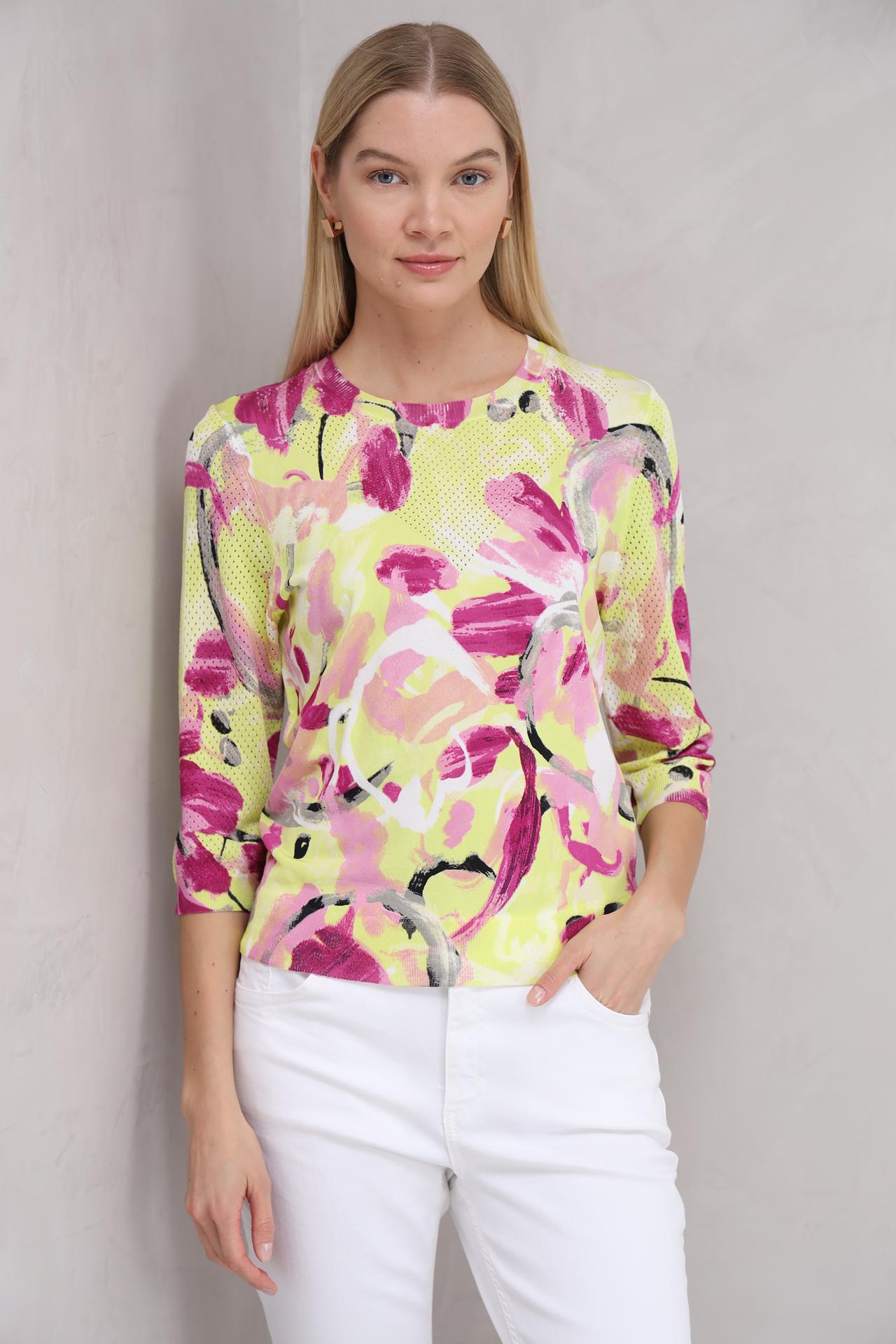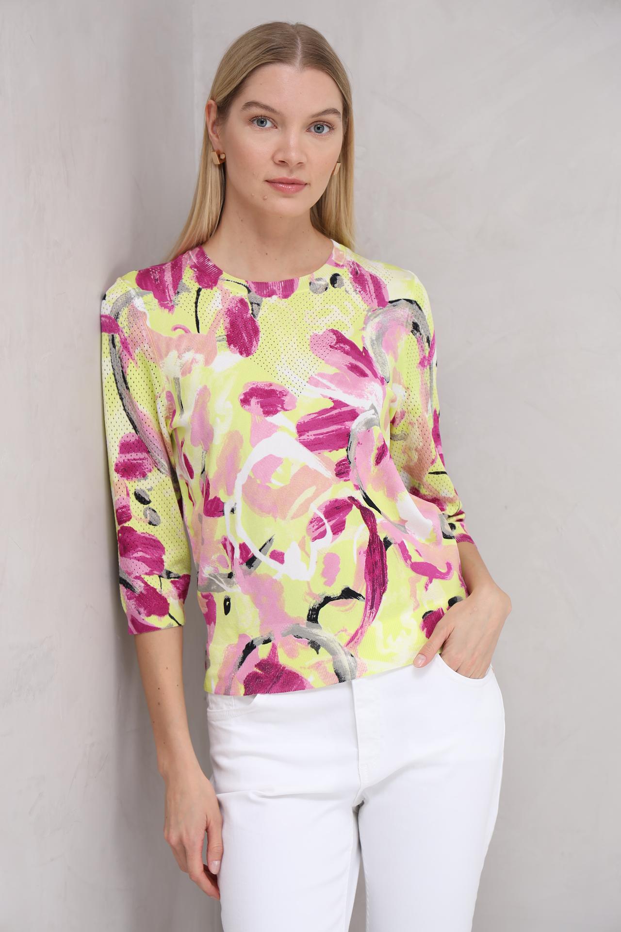 Круглый вырез и рукава 3/4 делают блузу универсальной, а уникальная декоративная перфорация по всей поверхности добавляет ей изысканности и воздушности. Цветочный узор в оттенках фуксии, розового, желтого, белого и черного создает динамичный и освежающий образ. Благодаря дышащему материалу, эта блуза Taifun обеспечивает максимальный комфорт в течение всего дня.