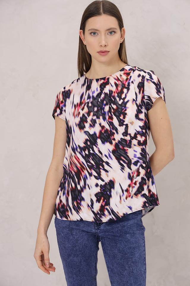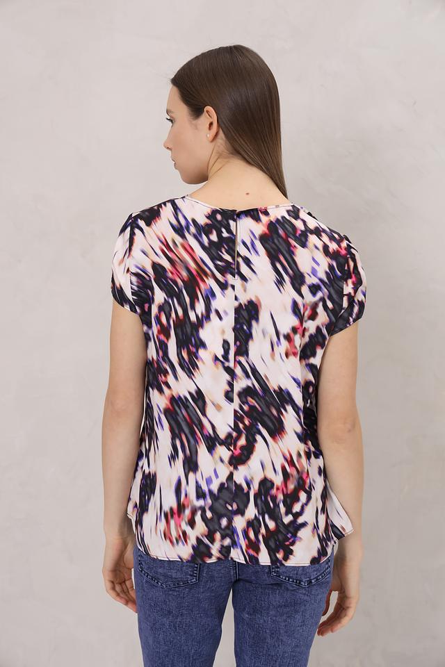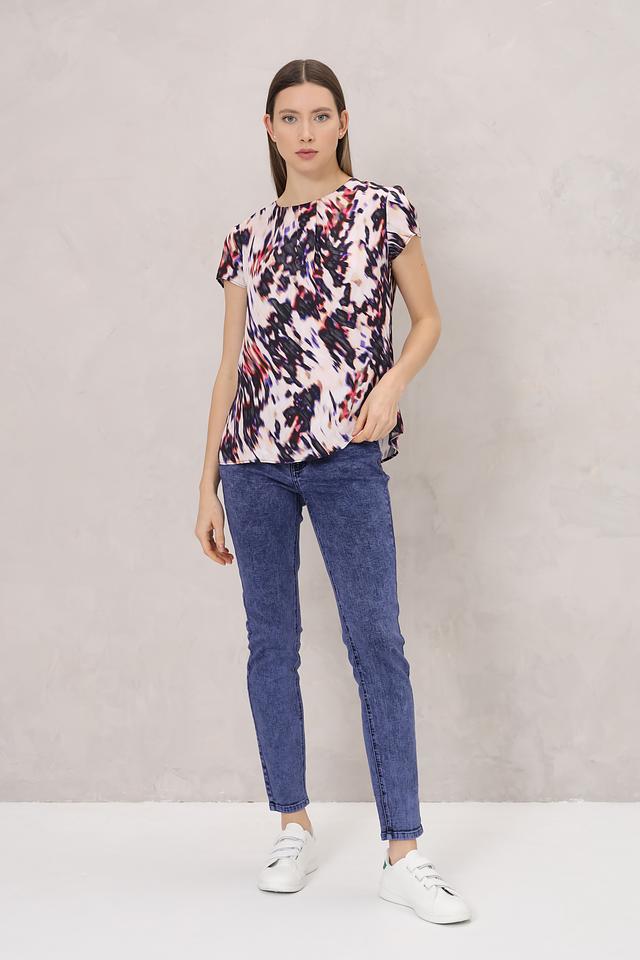 Особенностью этой модели является яркий и необычный абстрактный принт, сочетающий в себе оттенки розового, красного, синего и черного. Благодаря этому, блуза выглядит очень эффектно и привлекательно.