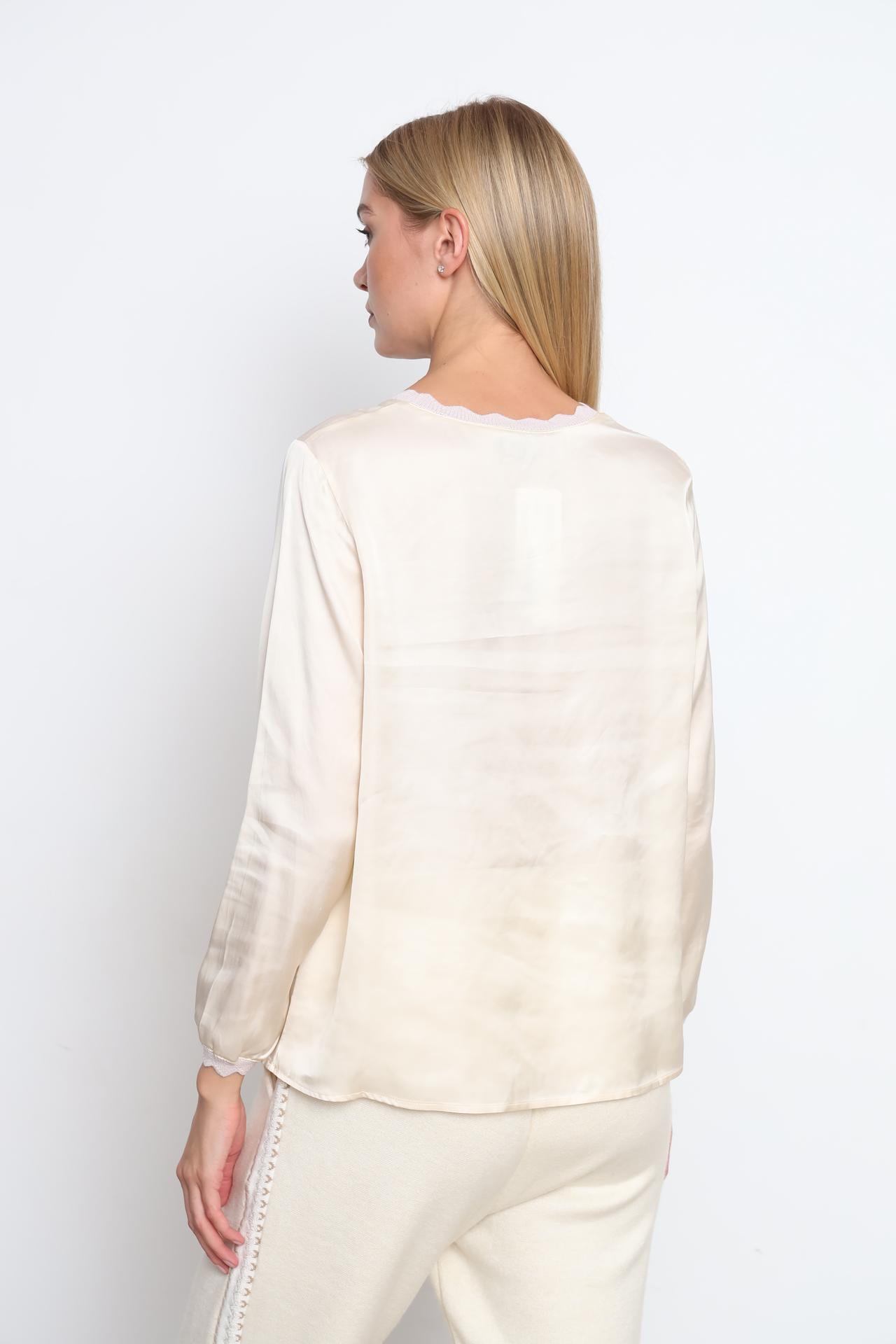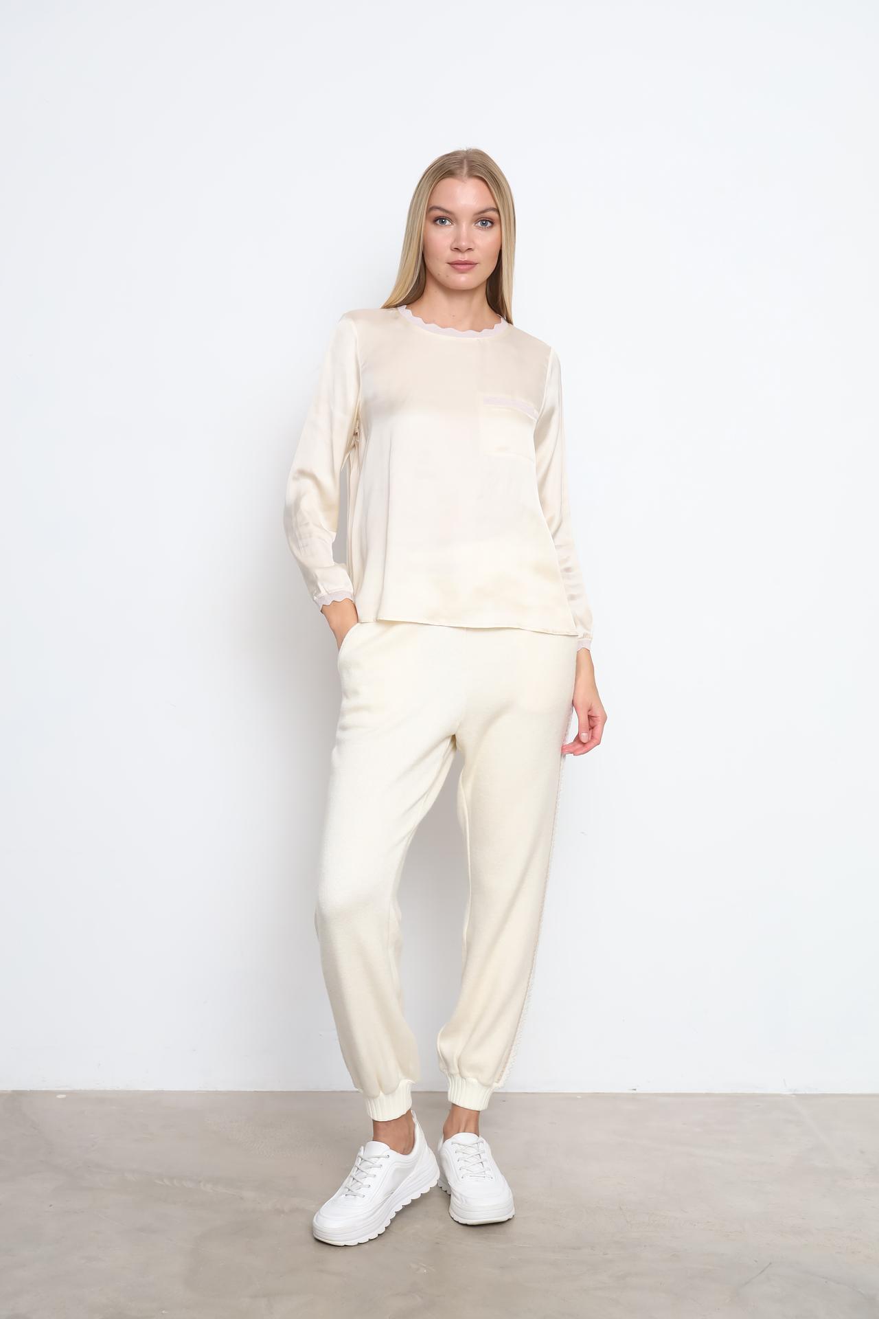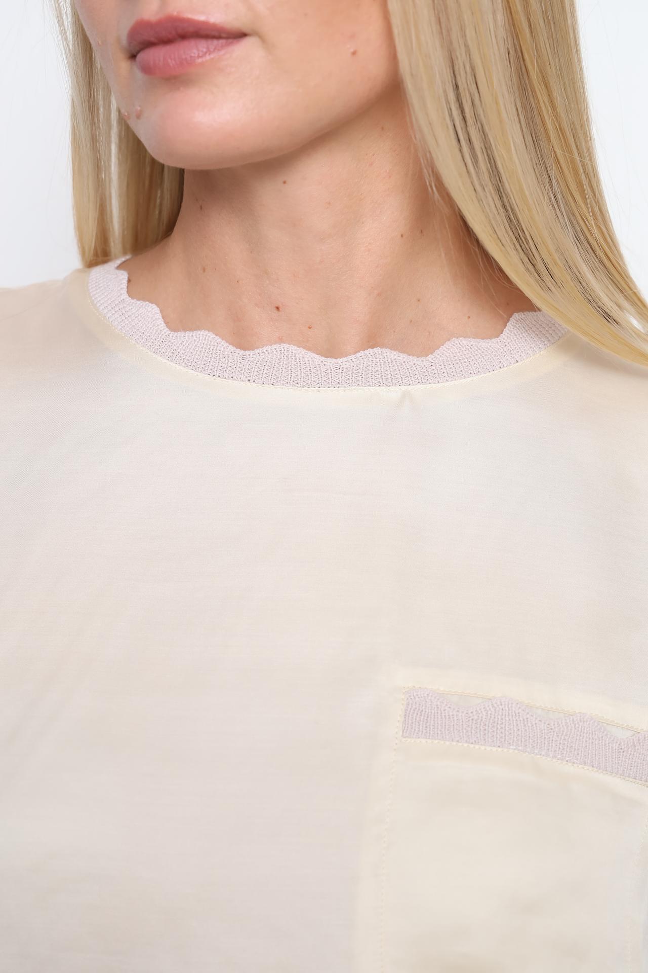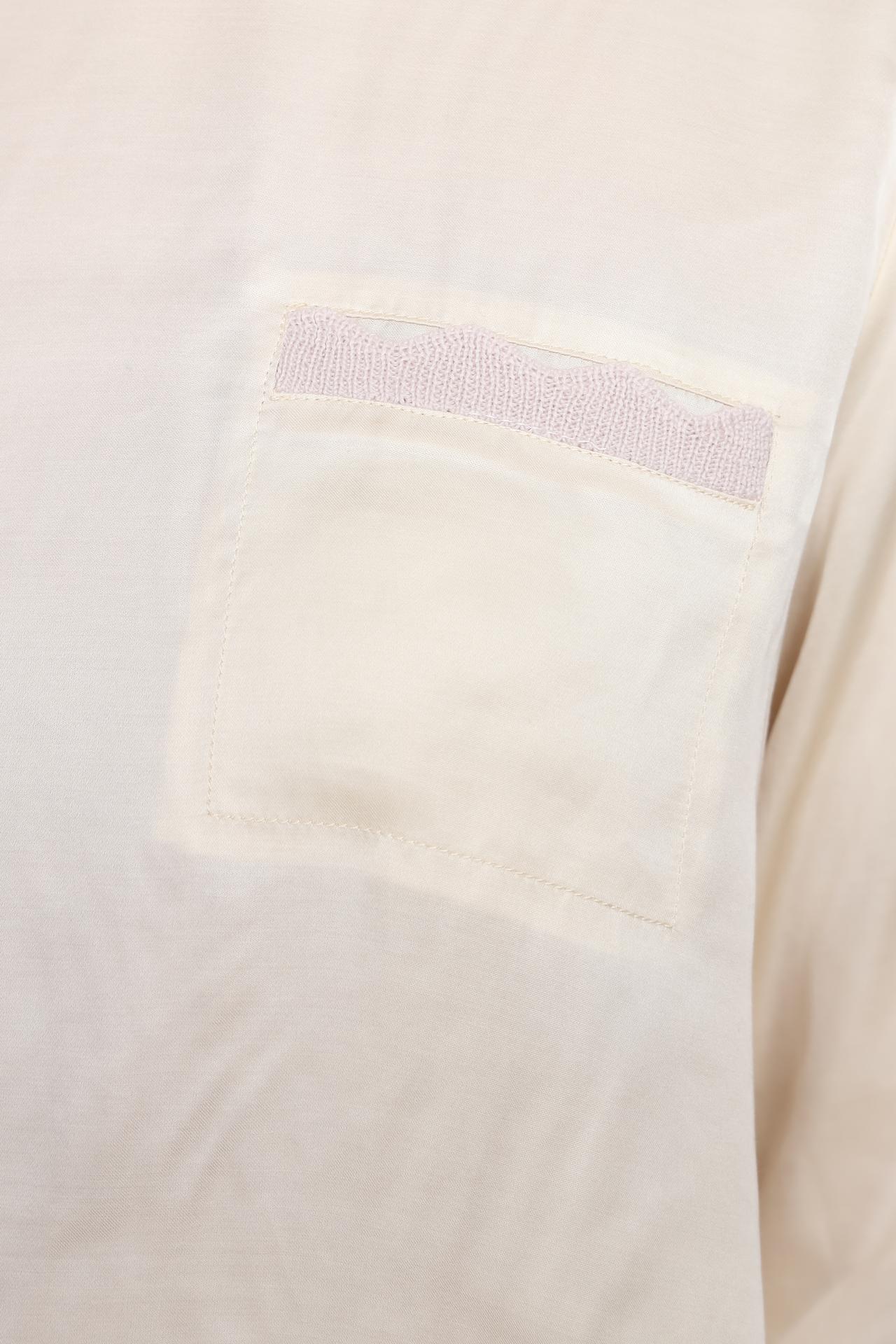 Классический крой с длинными рукавами и аккуратным нагрудным карманом дополнен оригинальной трикотажной отделкой. Воротник, манжеты и кант кармана украшены нежной волнистой вязкой контрастного оттенка, добавляя изюминку дизайну. Эта стильная блуза легко сочетается с брюками, юбками и джинсами, предлагая множество вариантов для вашего гардероба.