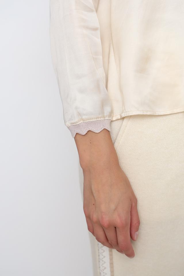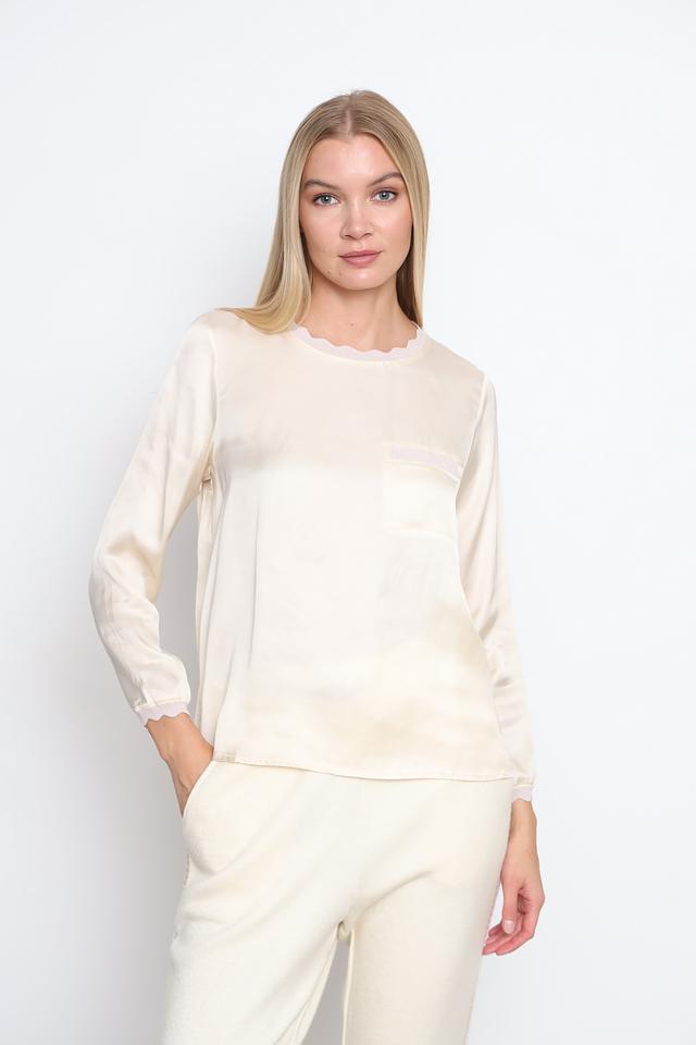 Модель дополнена небольшим накладным карманом на груди. Блуза выполнена из высококачественной ткани, сочетающей в себе вискозу, шерсть и полиакрил, что обеспечивает комфорт и приятные тактильные ощущения.