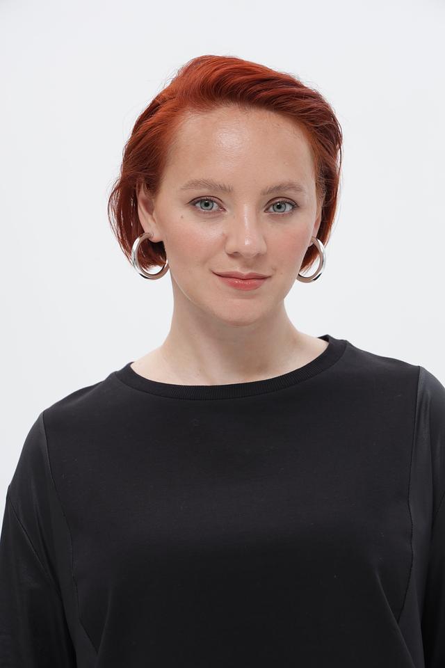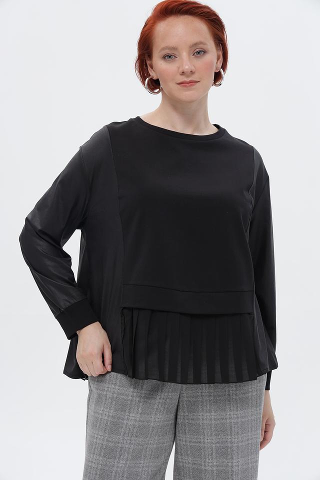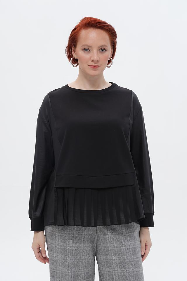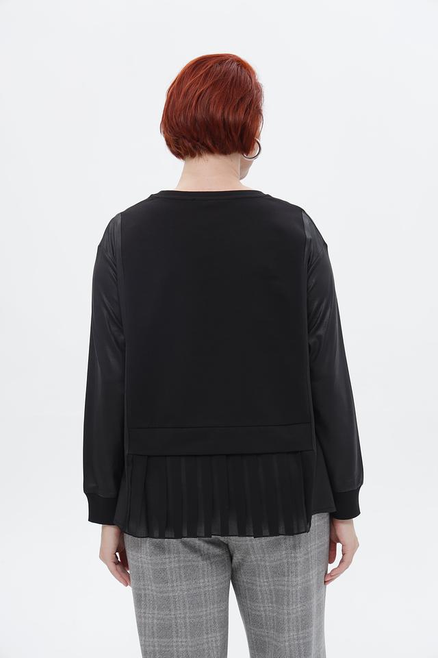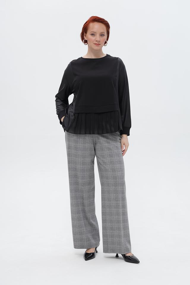 Особенностью данной блузки является асимметричный низ с декоративными оборками, придающими образу женственность и изысканность. Круглый вырез горловины подчеркивает линии шеи.