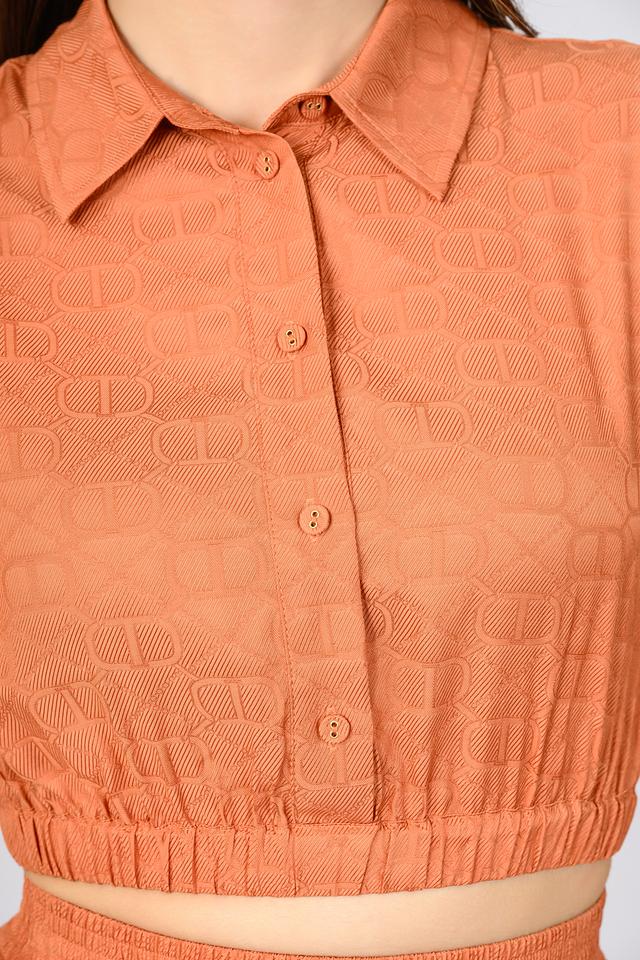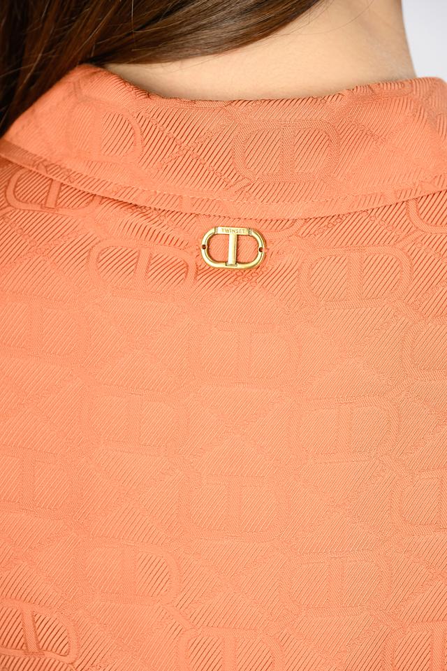 Оранжевая блуза Twin Set из 100% вискозы с укороченным кроем и оригинальным принтом в виде логотипа бренда. Модель с короткими рукавами и воротником-стойкой, застегивается на пуговицы. Состав: вискоза 100%