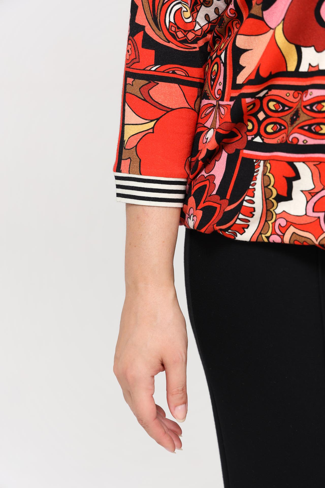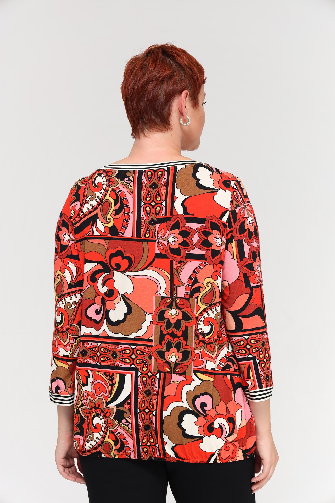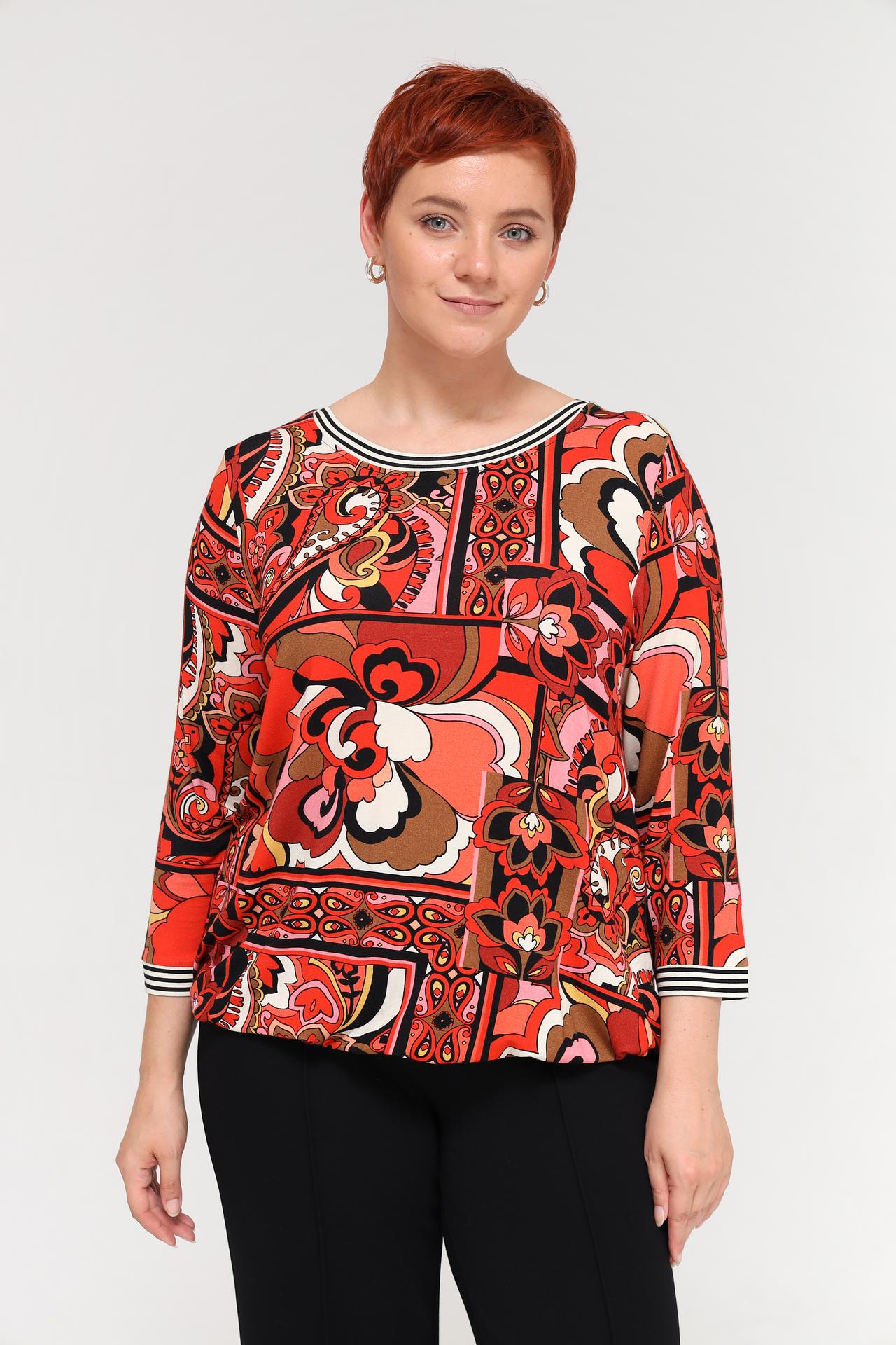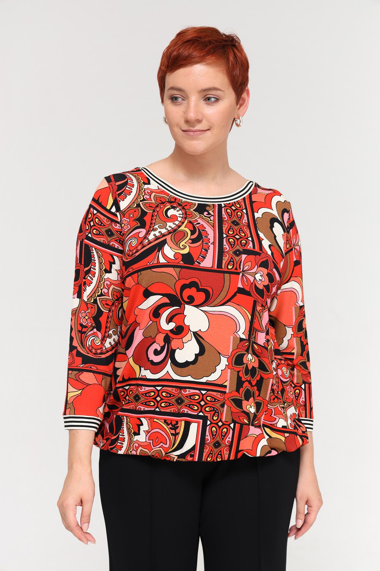 Блуза украшена ярким принтом в стиле ретро, который делает ее стильной и привлекательной. Рукава ¾ и круглый вырез горловины добавляют изделию элегантности. Блузка Via Appia идеально подойдет для создания повседневных и праздничных образов. Она станет прекрасным выбором для работы, прогулок или встреч с друзьями.