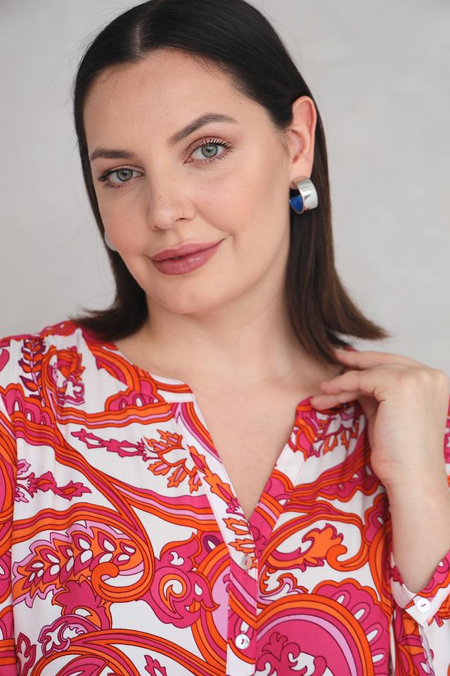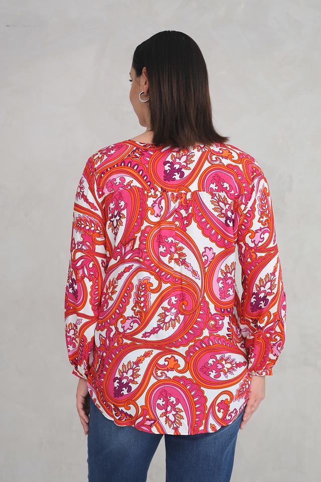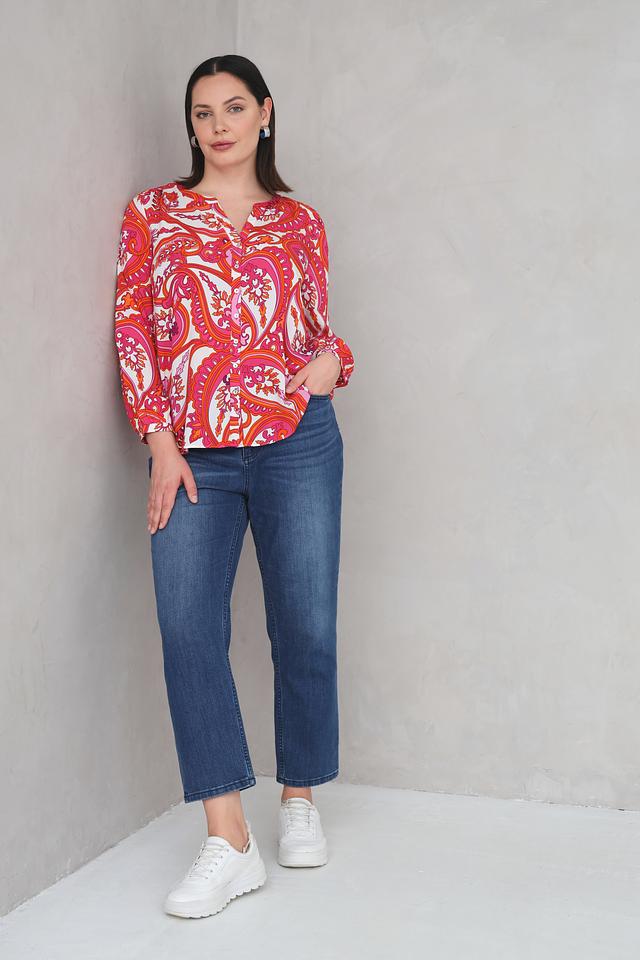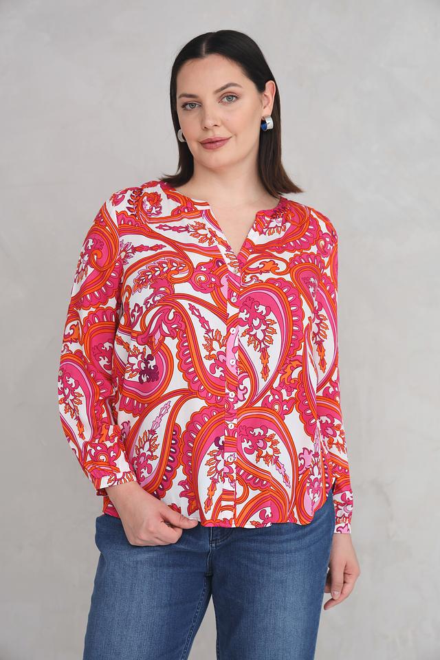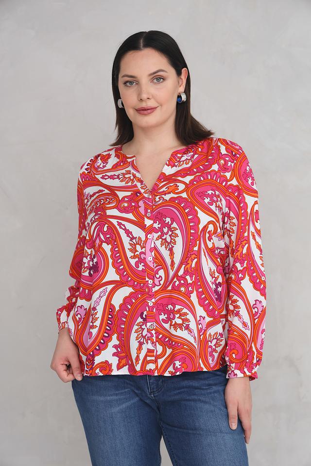 Блуза имеет V-образный вырез и длинные рукава, что делает ее универсальной для различных случаев. Особенностью модели является эффектный принт пейсли в оранжево-розовой гамме, который придает ей неповторимый вид.