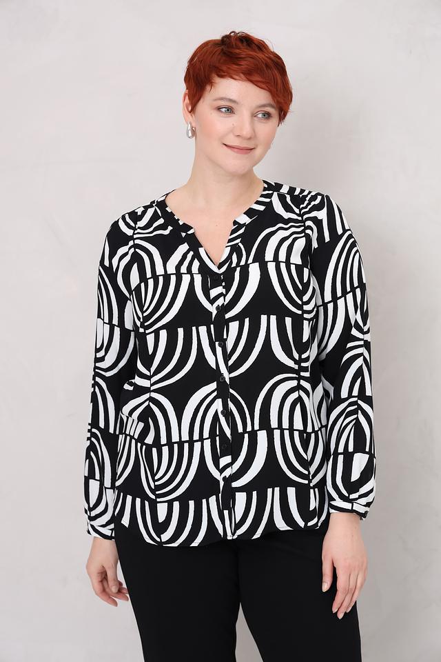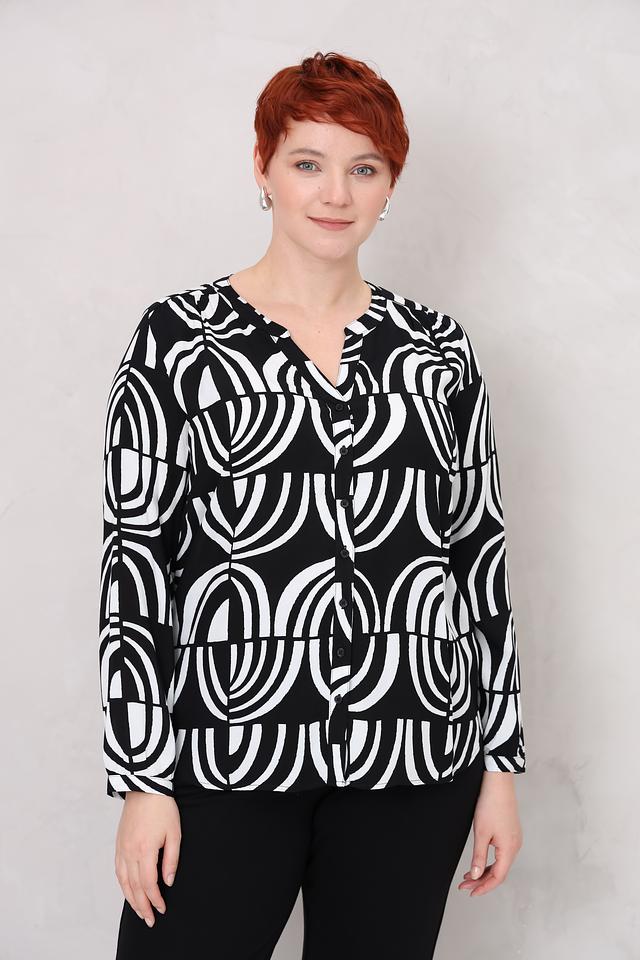 Блуза имеет свободный крой и длинные рукава. V-образный вырез горловины дополнен небольшой планкой с пуговицами. Главная особенность модели – эффектный черно-белый принт с геометрическим рисунком, который придает ей современный и стильный вид.