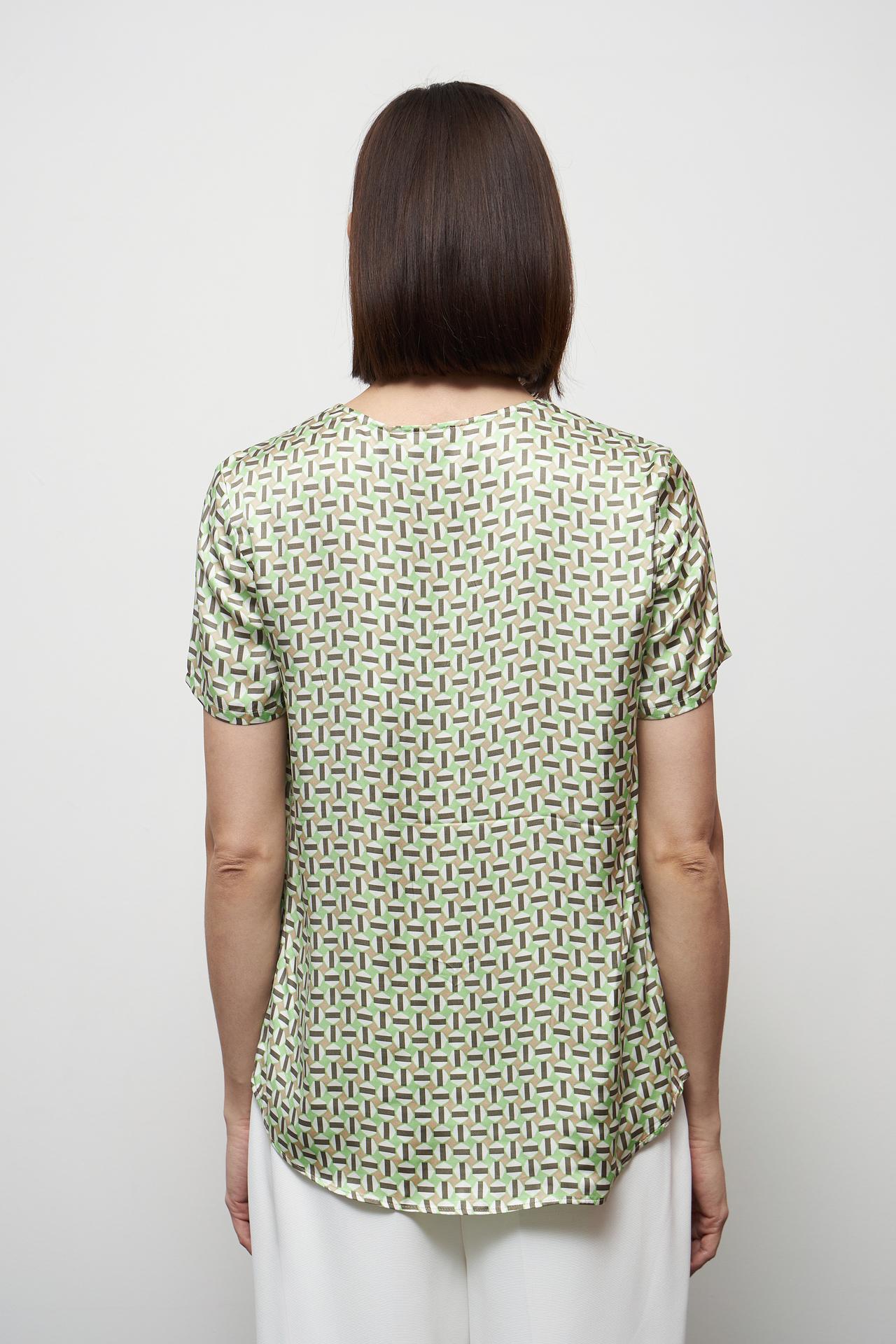 Мягкая, струящаяся ткань приятна к телу и обеспечивает свободу движений. Геометрический принт добавляет блузке неповторимый шарм и делает её акцентной деталью вашего гардероба. Блузка легко сочетается с различными элементами одежды – от классических брюк до юбок и джинсов.