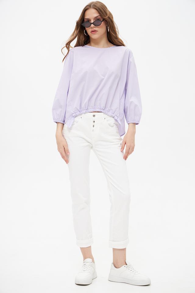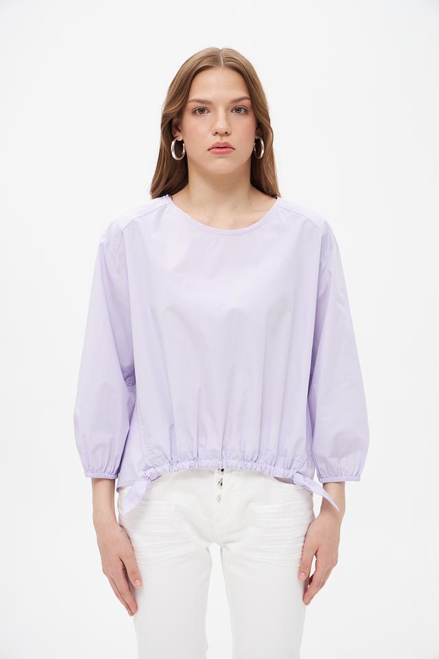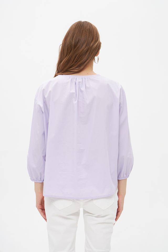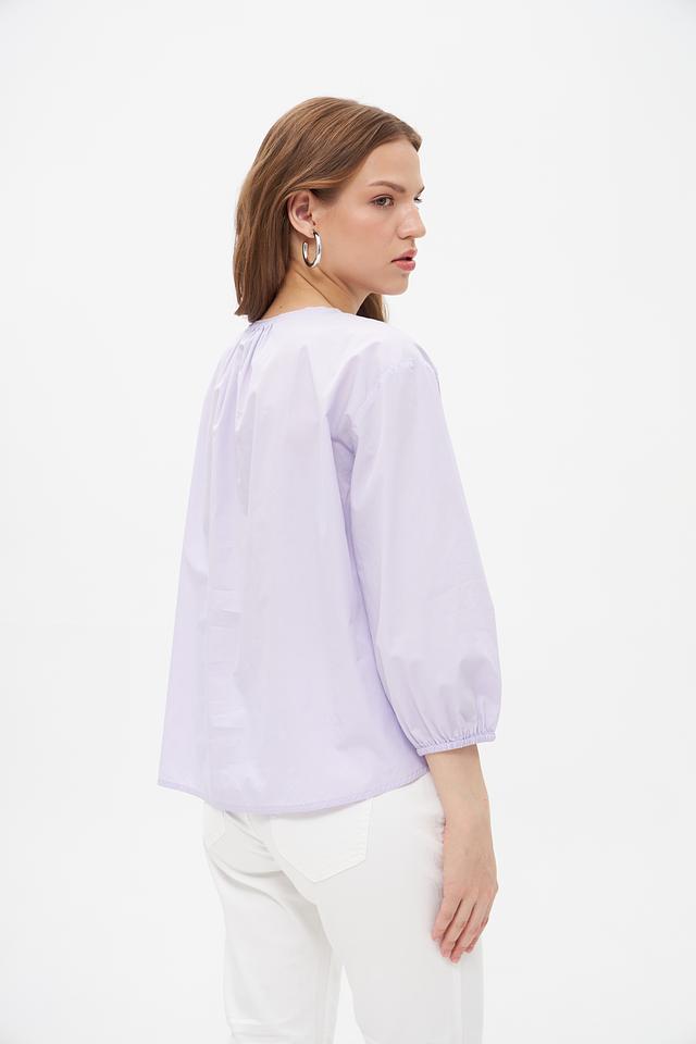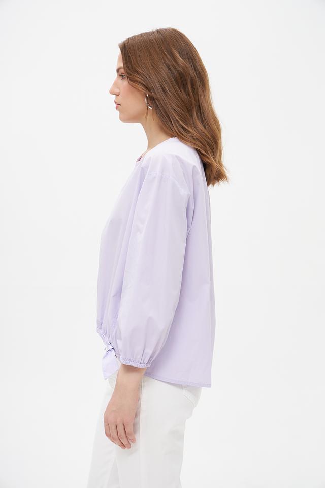 Блуза имеет лавандовый оттенок и свободный крой, который не сковывает движений. Рукава-фонарики добавляют образу романтичности и лёгкости. Сборка по низу блузы создает эффект воздушности и подчеркивает талию.