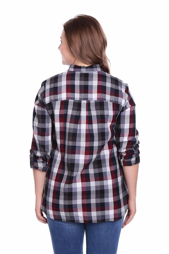 Стильная женская блузка от бренда QS, изготовленная из 100% хлопка. Модель представлена в универсальной расцветке – бордово-серой клетке. Прямой крой обеспечивает комфорт и свободу движений.