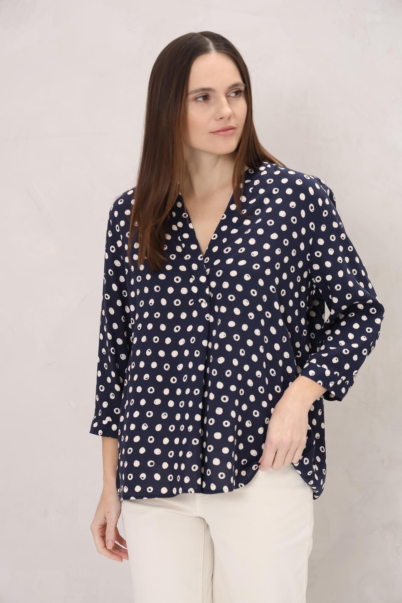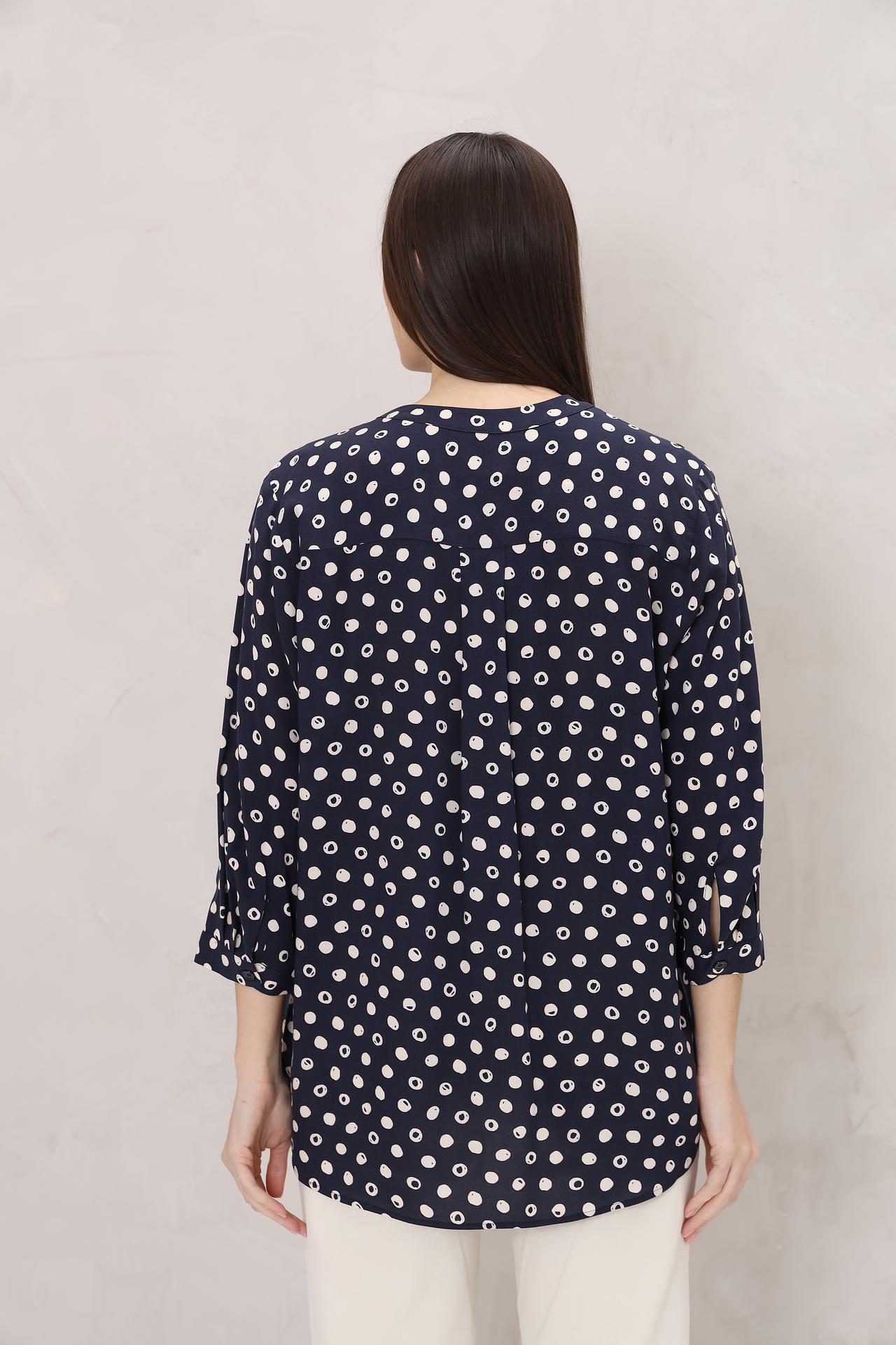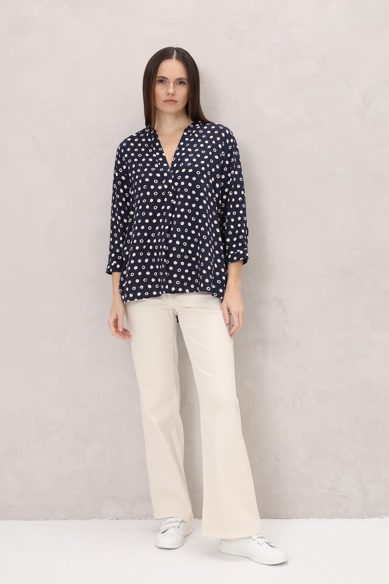 - Стильный принт: Нежный горошек на тёмно-синем фоне делает блузку уникальной и привлекательной.