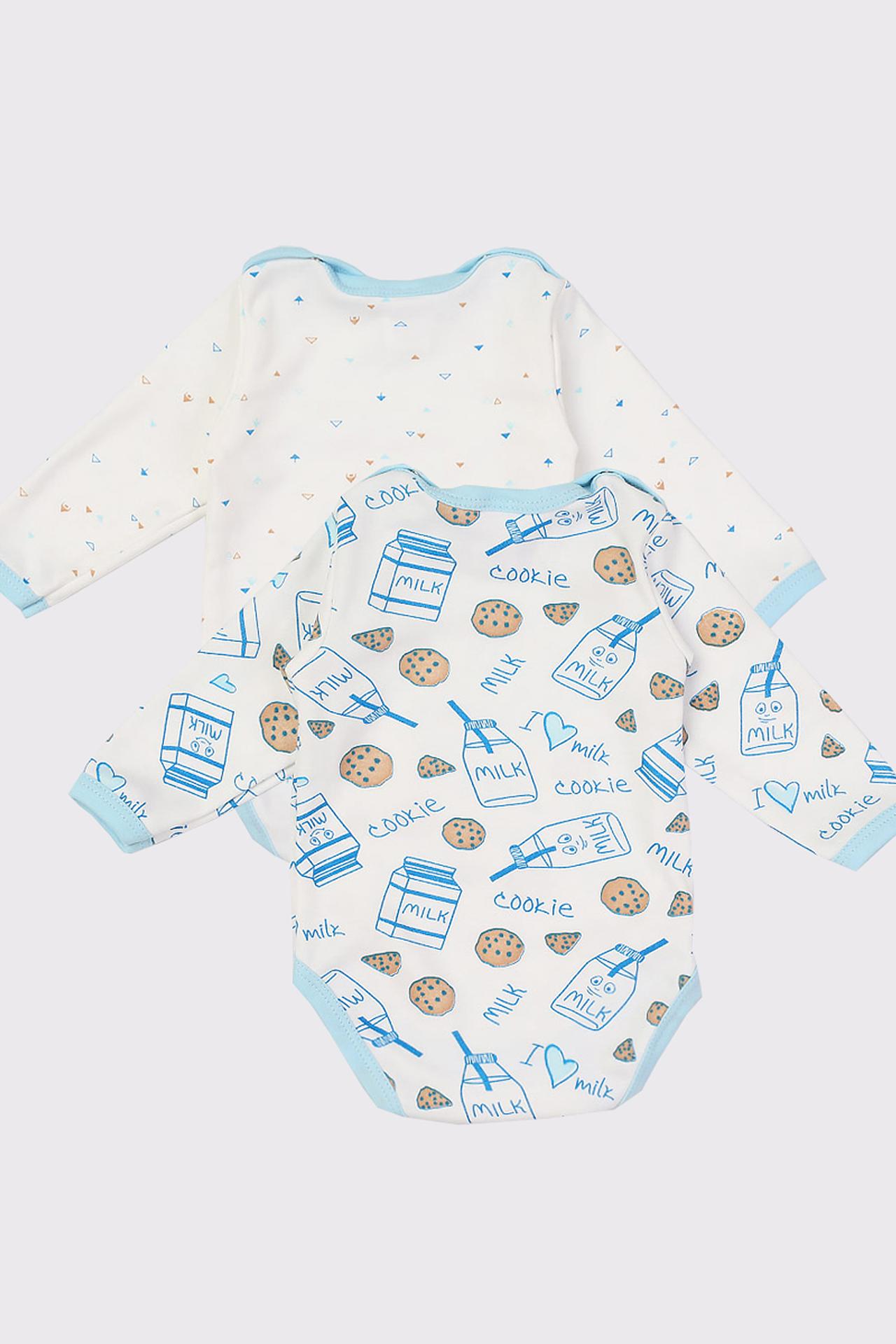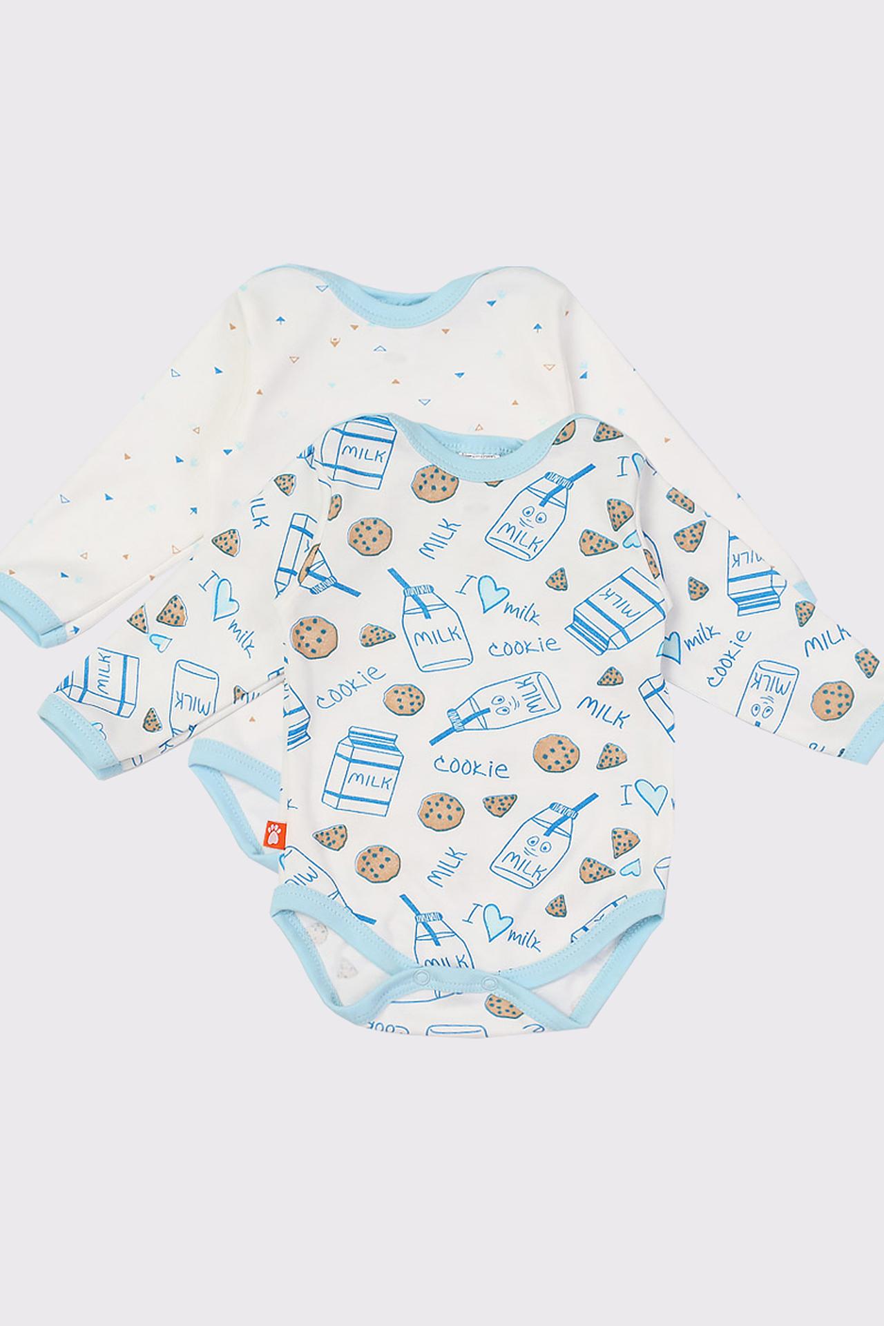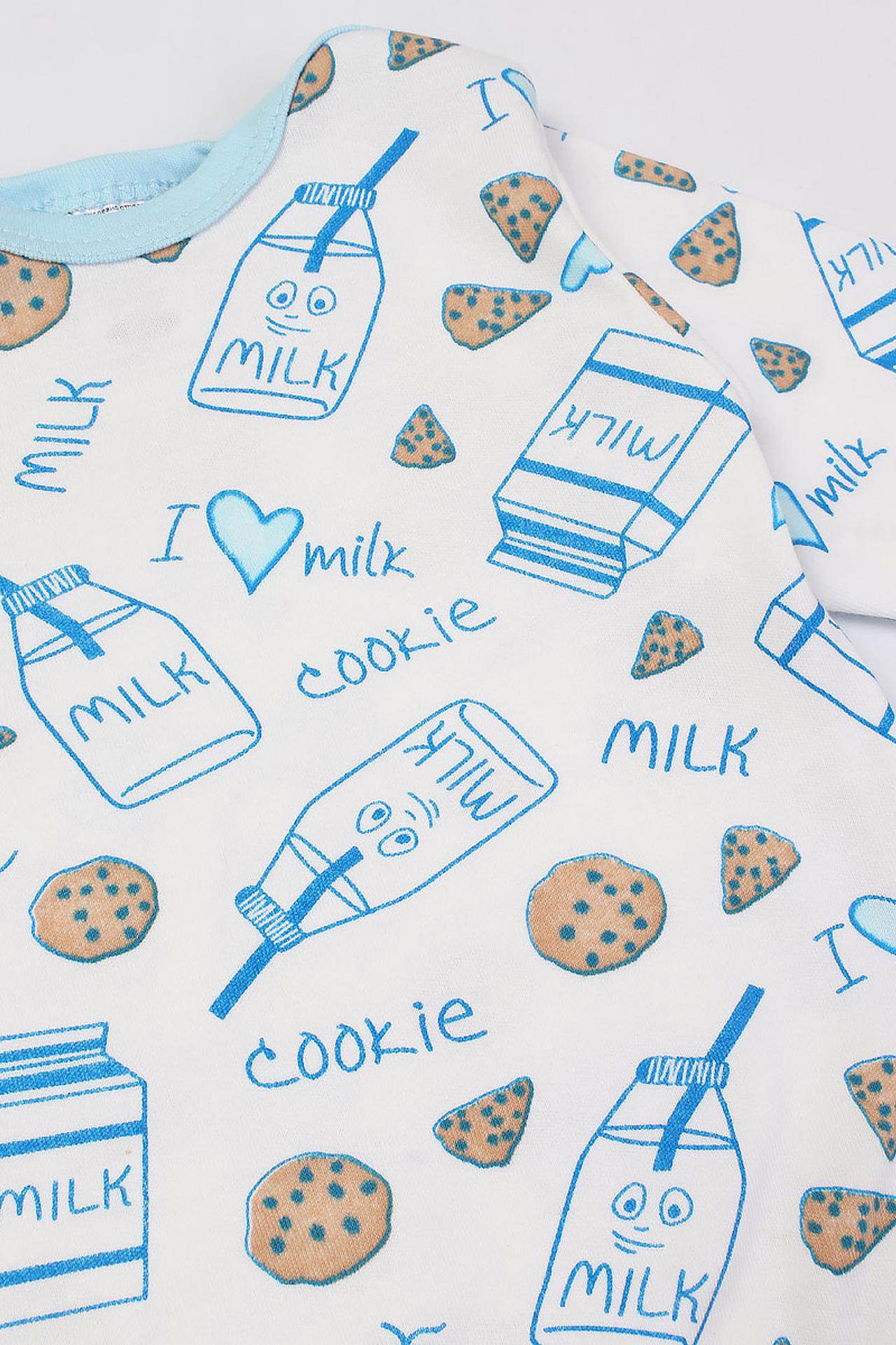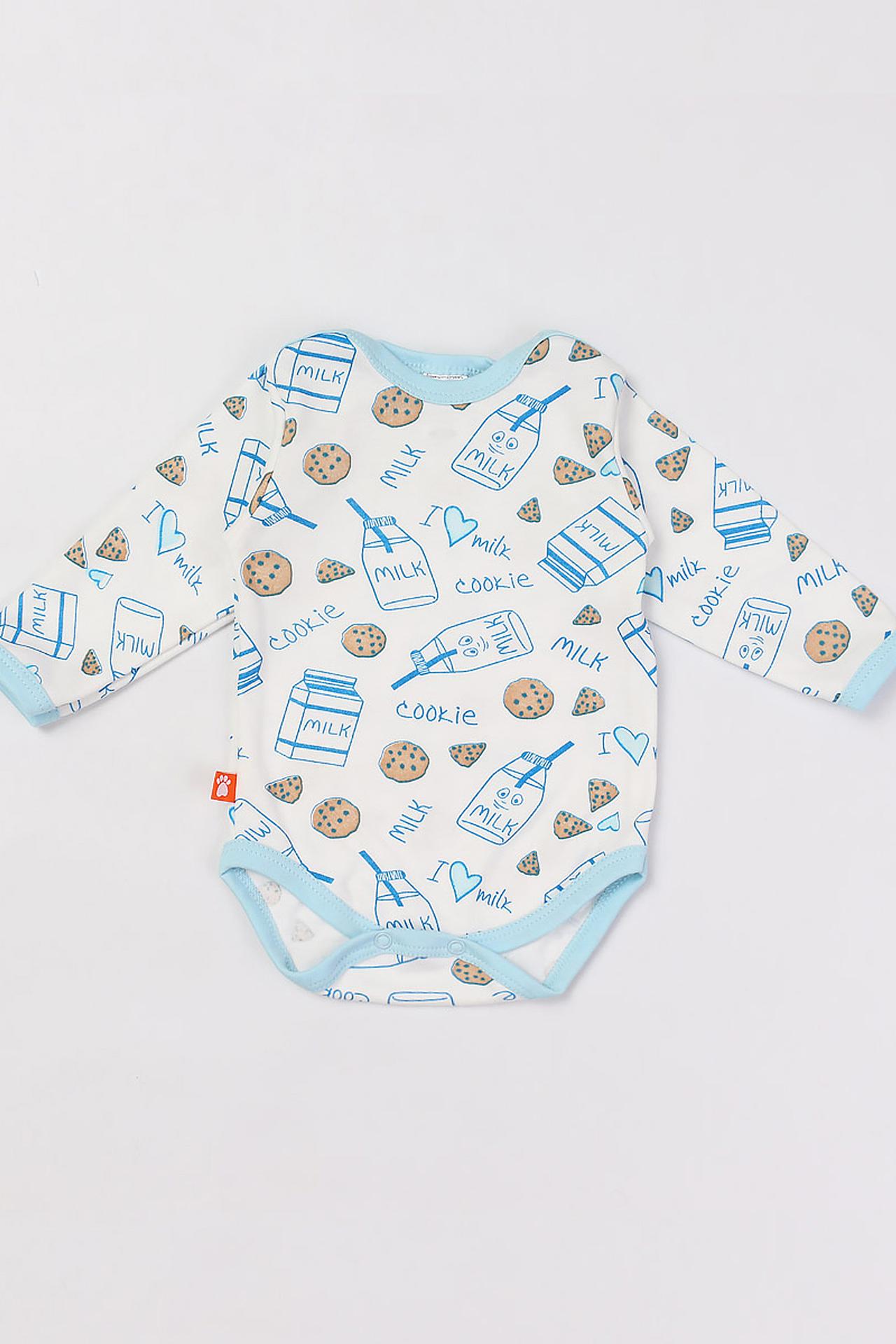 Боди украшен милым принтом с тематикой "молоко и печенье" и отделкой голубого цвета, придавая ему неповторимый вид. Боди легко надевается и снимается благодаря удобным застежкам-кнопкам. Идеально подходит для детей с рождения. Отличный вариант в качестве подарка для новорожденного.