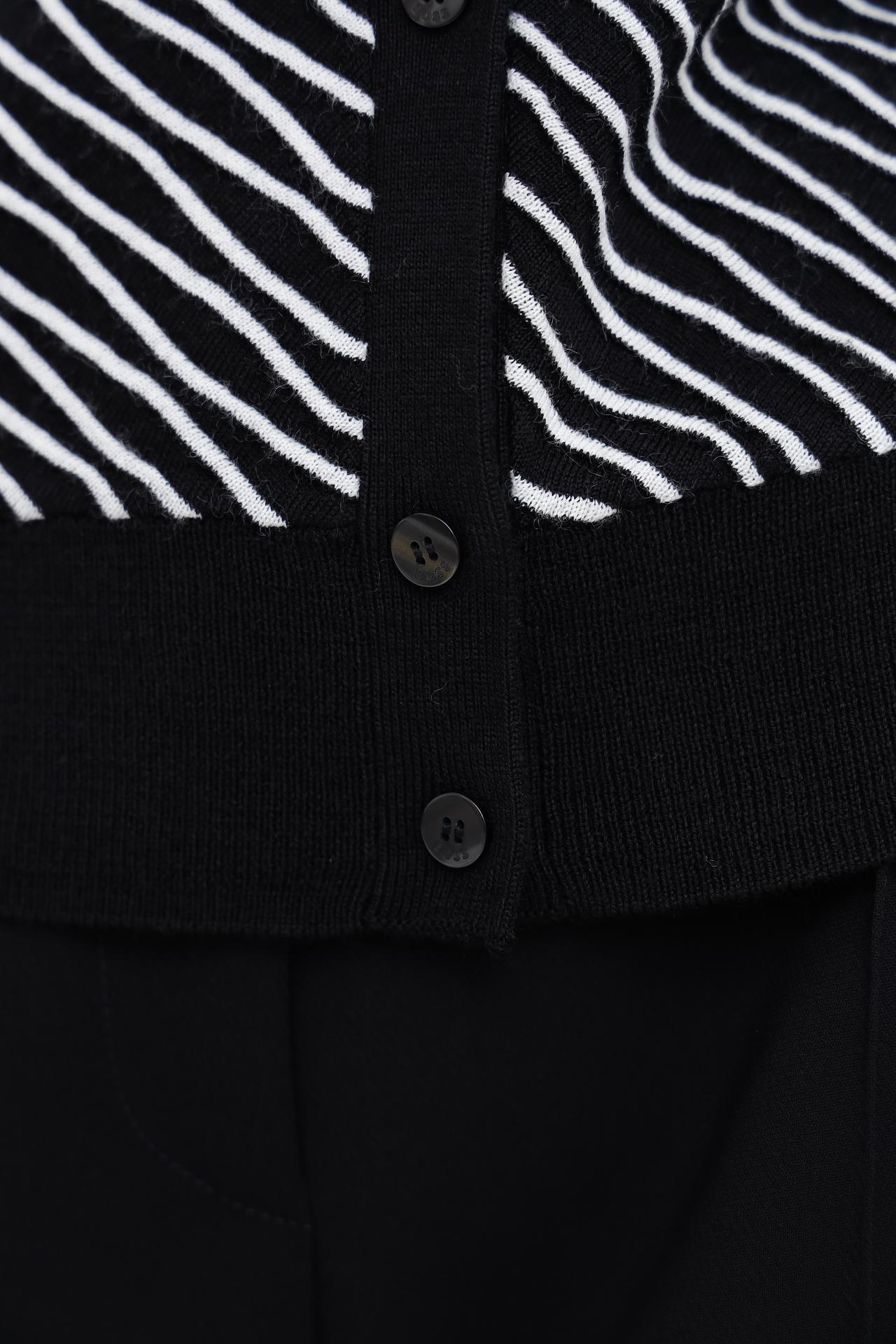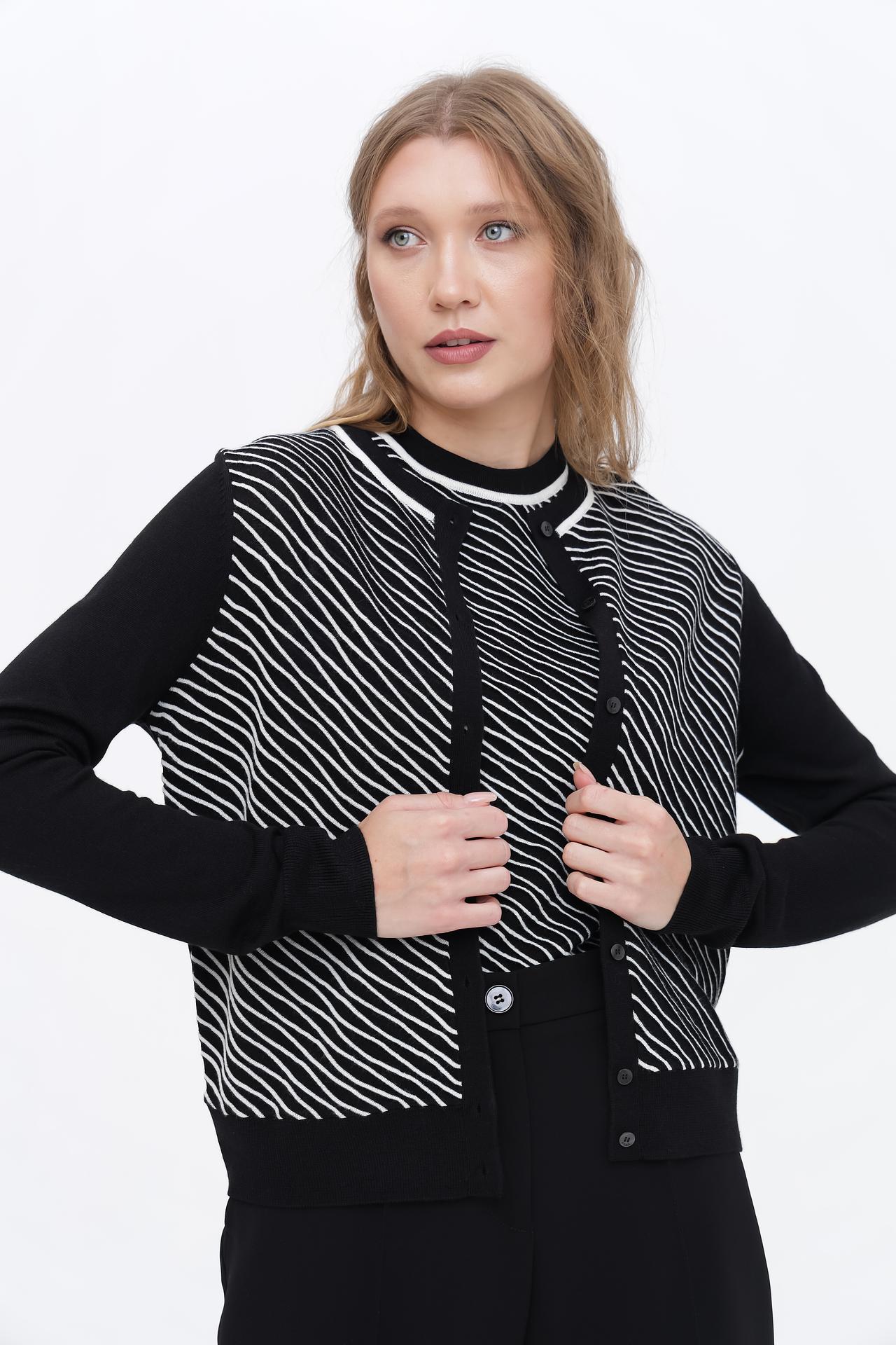 - Дизайн: Классический крой жакета с застежкой на пуговицы и V-образным вырезом горловины. Оригинальный принт в виде диагональных полос на передней части изделия добавляет изысканности.