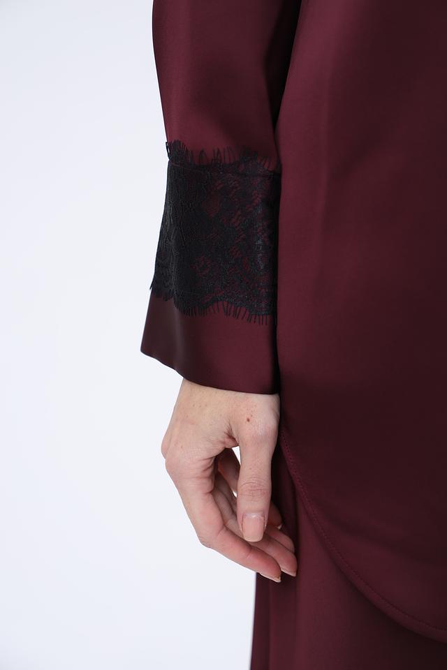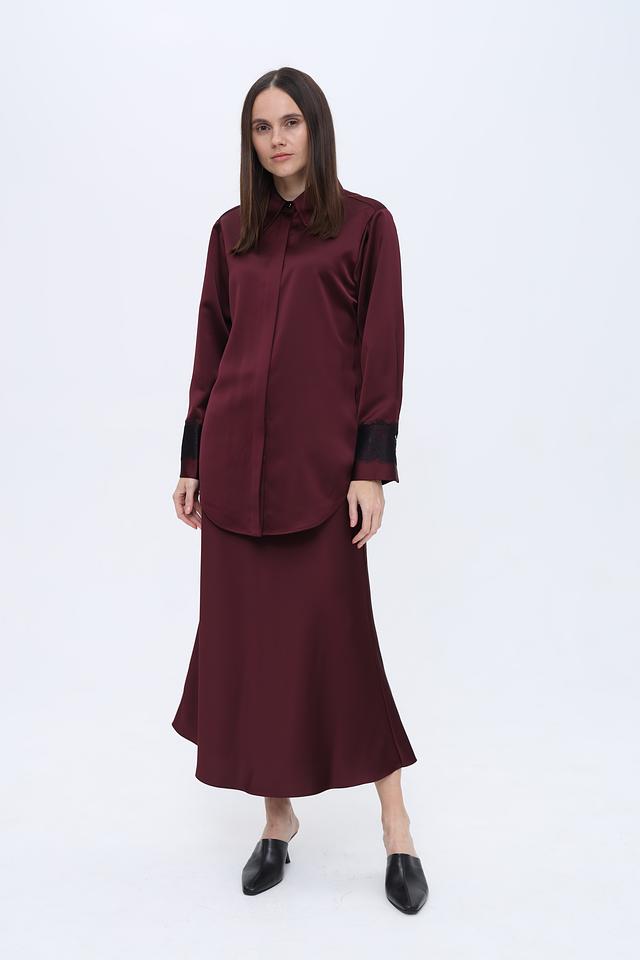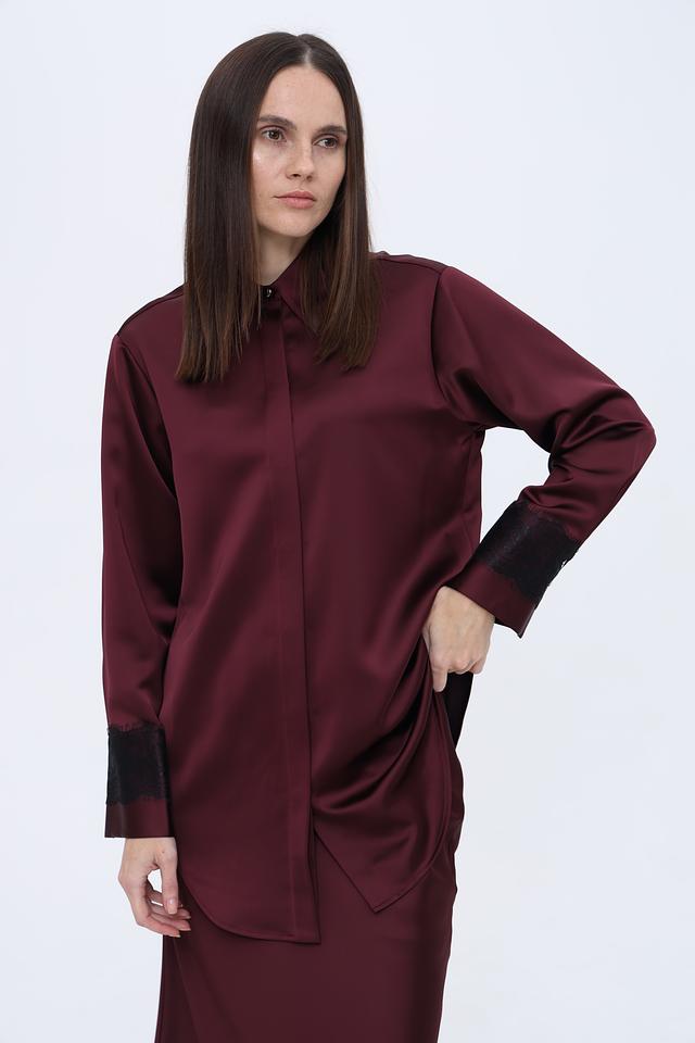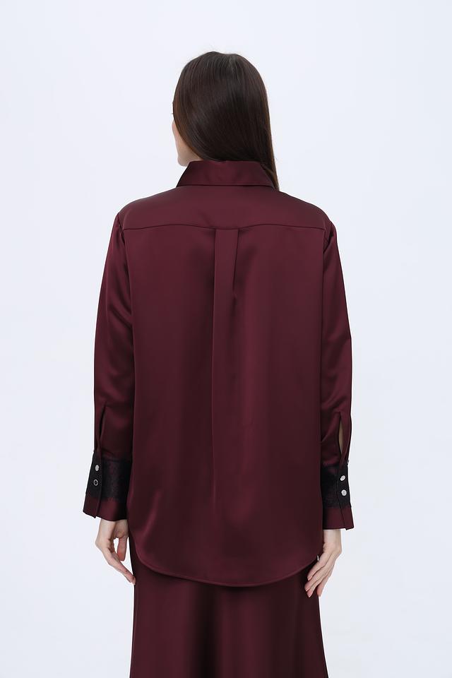 Рубашка имеет классический крой с длинными рукавами и отложным воротником. Особенностью модели являются декоративные вставки из черного кружева на манжетах, которые придают ей изысканность и женственность.