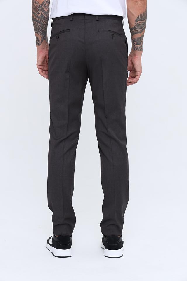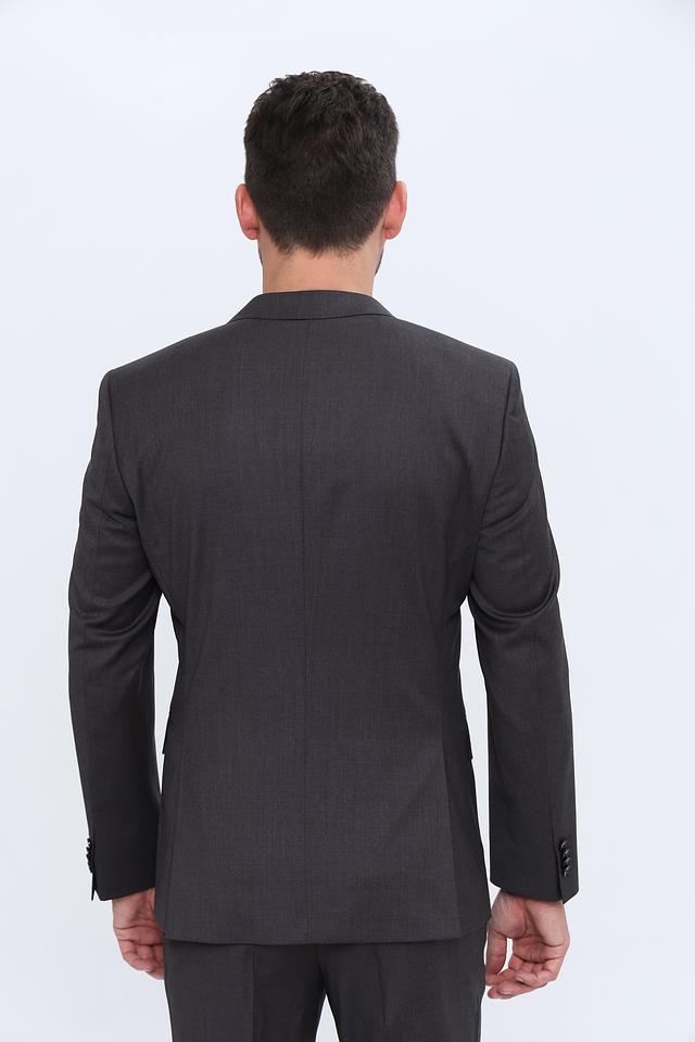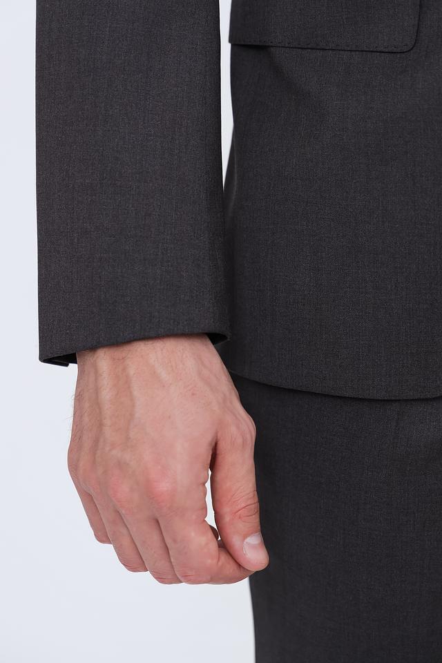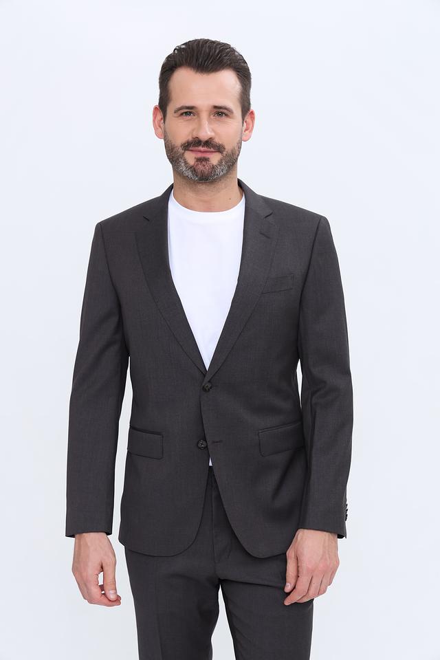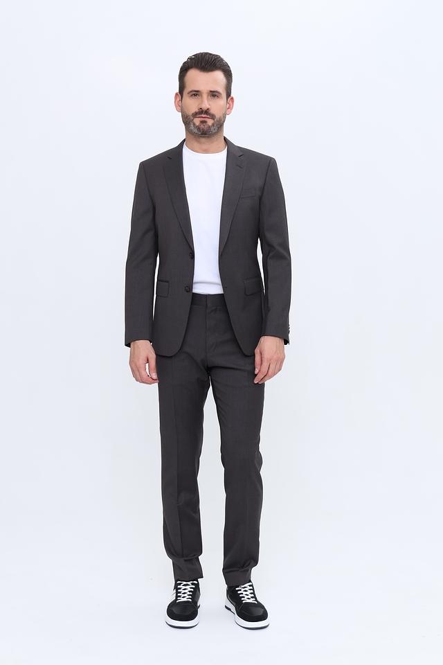 Пиджак имеет однобортную застёжку на две пуговицы, стандартные лацканы, два боковых кармана с клапанами и внутренний карман. Брюки классического кроя, зауженные к низу, с молнией и пуговицей. Костюм выполнен из высококачественной шерсти с добавлением эластана, что обеспечивает комфорт и хорошую посадку по фигуре.