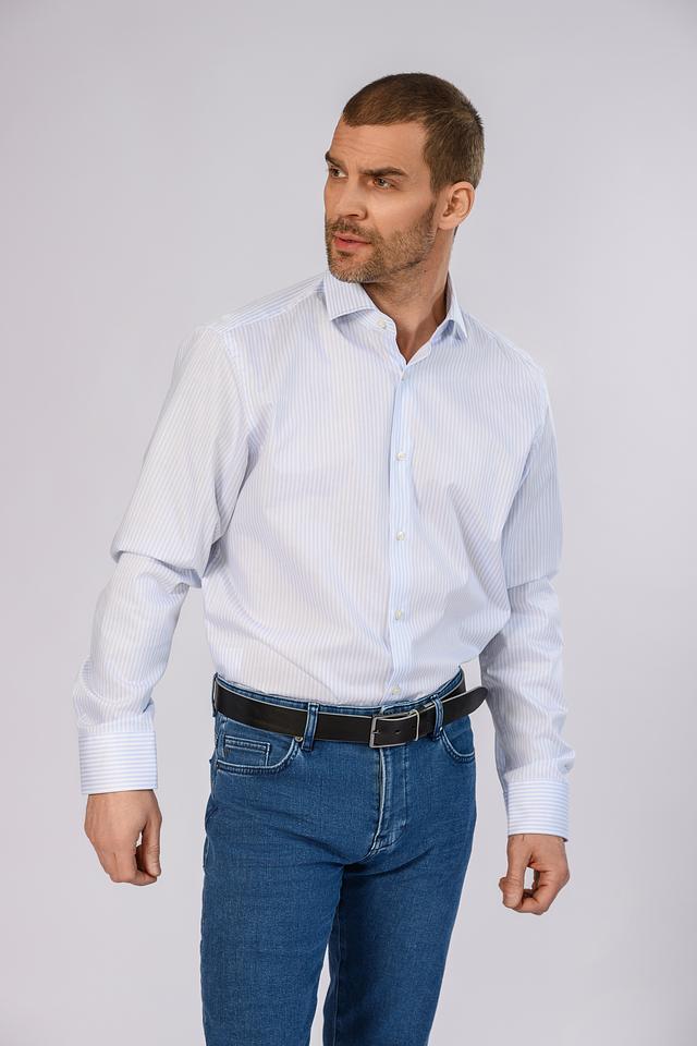 Мужская рубашка Boss Black голубого цвета с классическим кроем и вертикальной полоской. Изготовлена из 100% хлопка, обеспечивающего комфорт и воздухопроницаемость. Идеальный выбор для создания стильного и элегантного образа. Состав: хлопок 100%