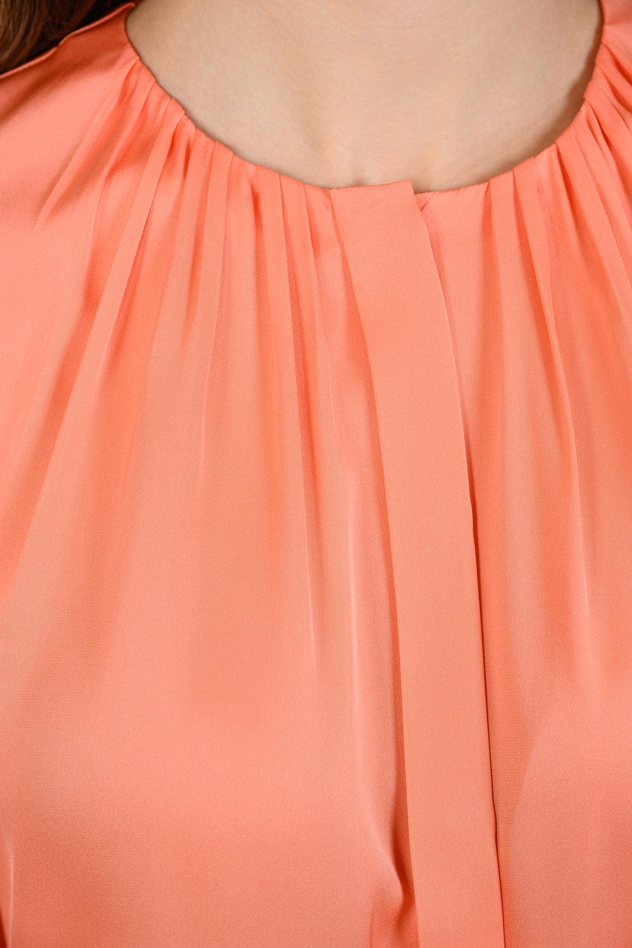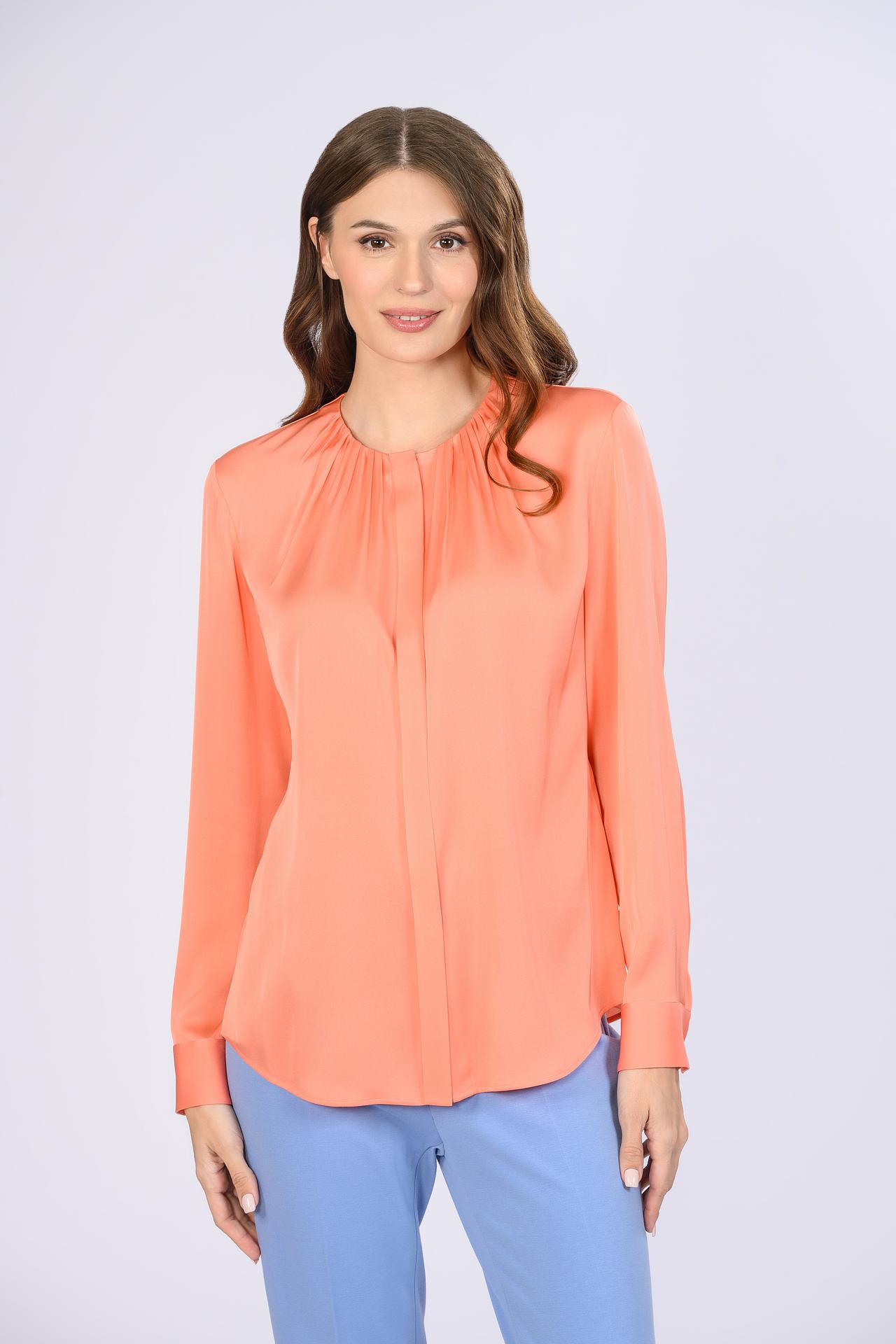 - Дизайн: Элегантный крой и коралловый цвет делают блузу выразительной и запоминающейся.