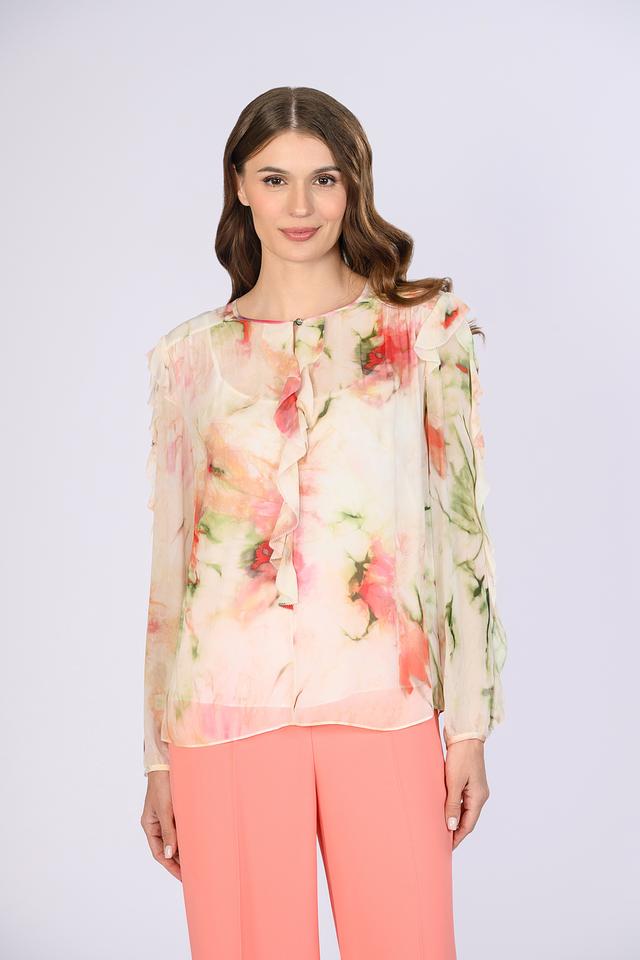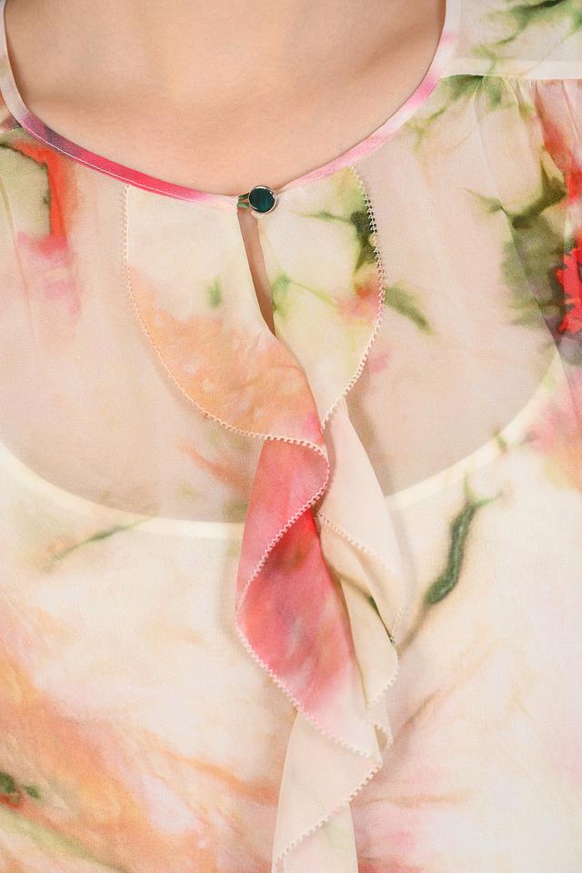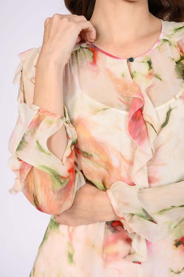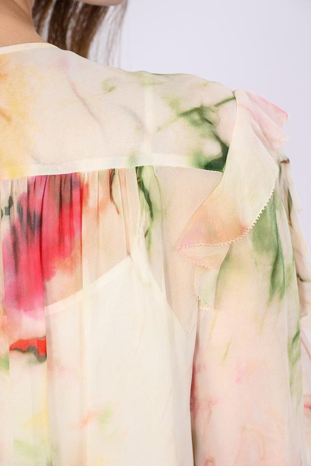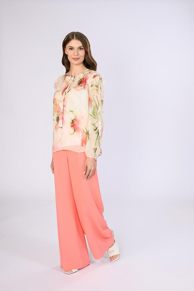Блуза имеет лёгкий, струящийся силуэт и украшена ярким цветочным принтом, выполненным в нежных оттенках розового, зелёного и жёлтого. Воротник оформлен небольшим вырезом и завязками, которые добавляют образу романтичности.