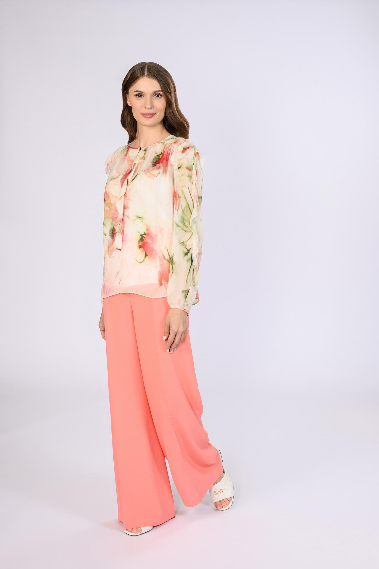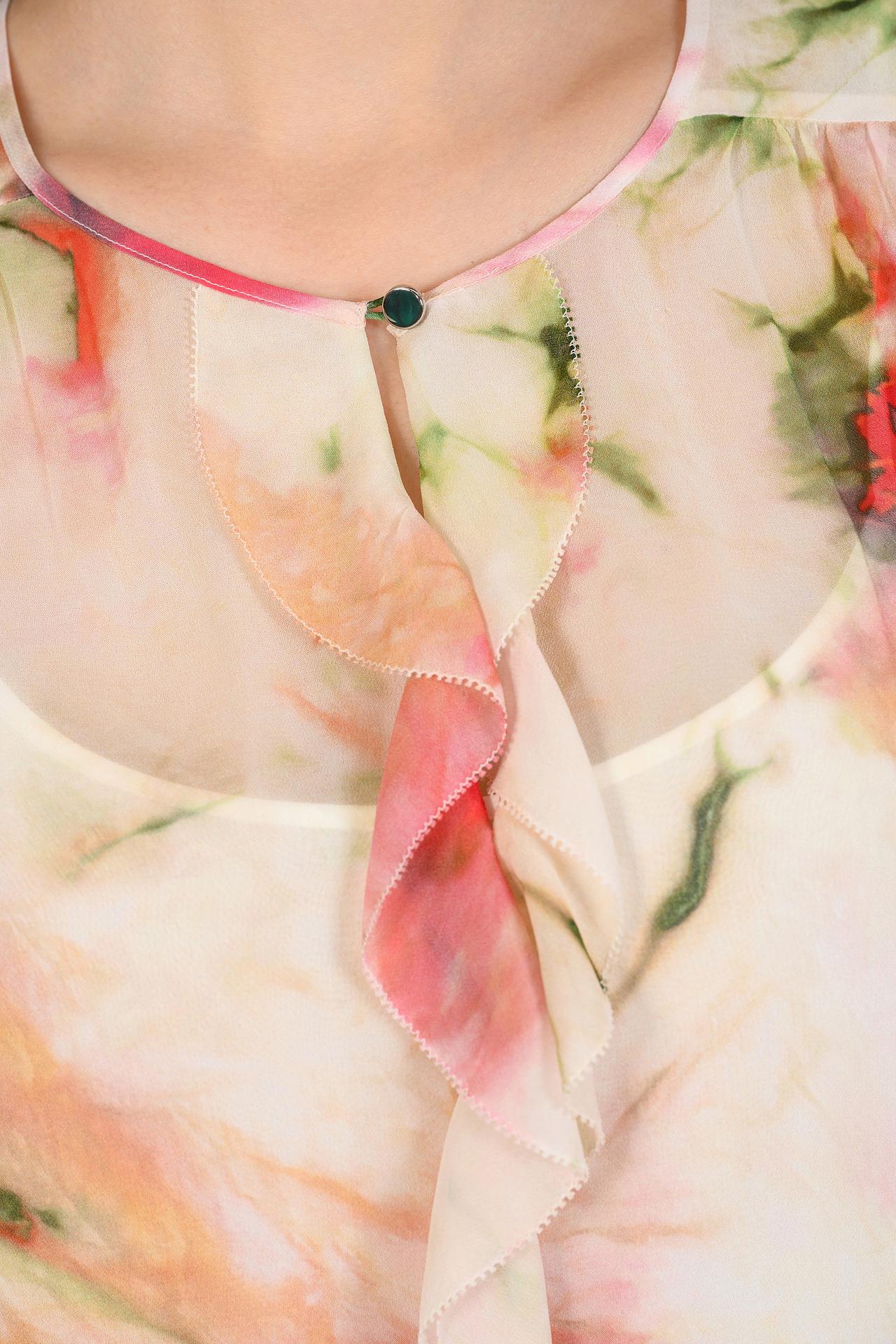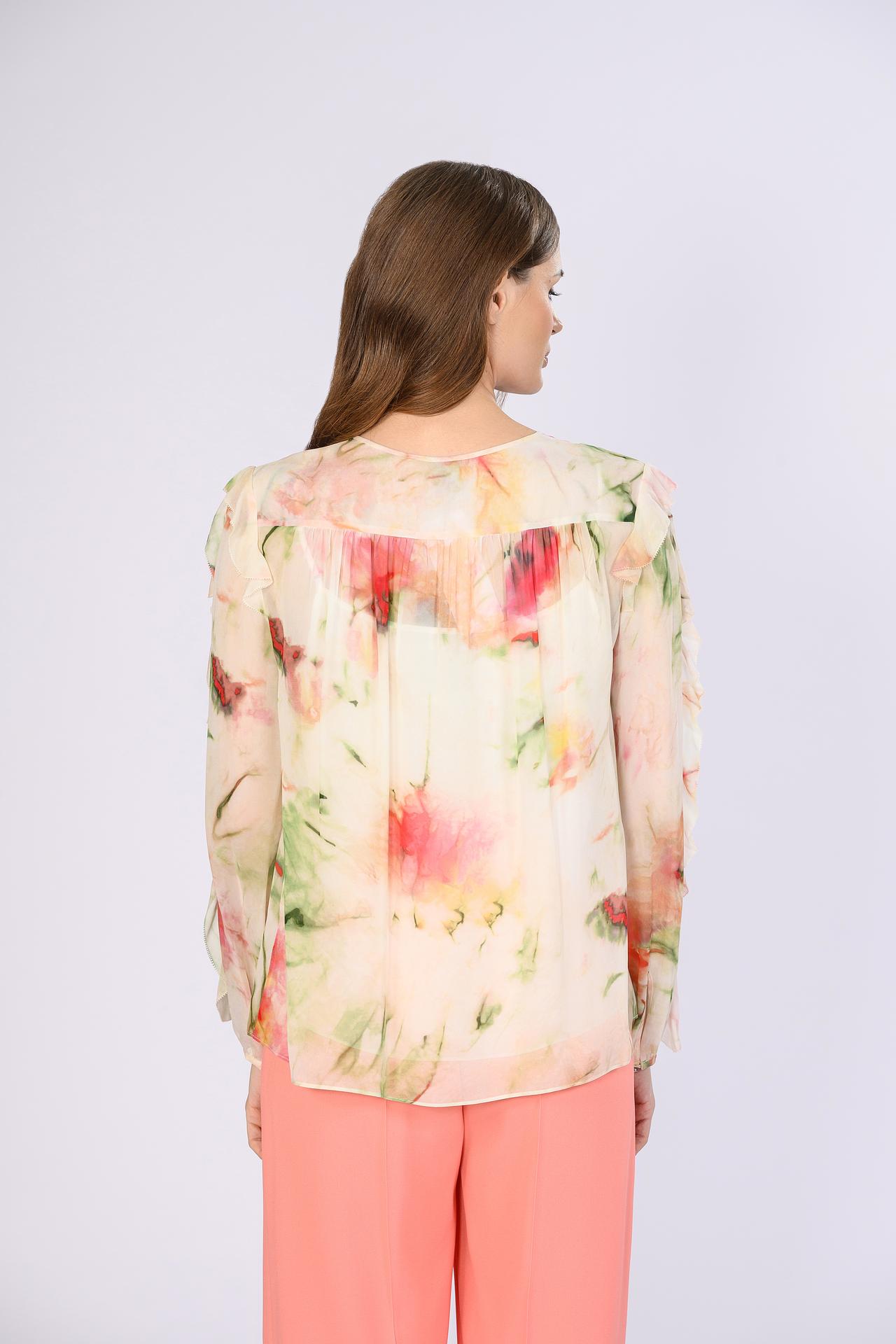 Модель украшена нежным разноцветным цветочным принтом, который придает изделию свежий и романтичный вид. Дизайн дополняют изящные рюши на планке и плечах, добавляющие объема и динамики. Круглый вырез горловины и длинные рукава с манжетами делают эту блузку универсальной как для повседневного, так и для более торжественного гардероба.