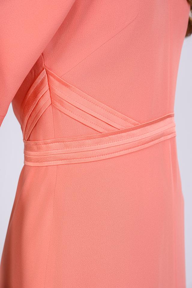 Платье Boss Black персикового цвета – элегантная модель длиной миди с V-образным вырезом и короткими рукавами. Платье выполнено из качественного ацетата и вискозы, имеет декоративную сборку на талии, подчеркивающую фигуру. Состав: ацетат 72%, вискоза 28%