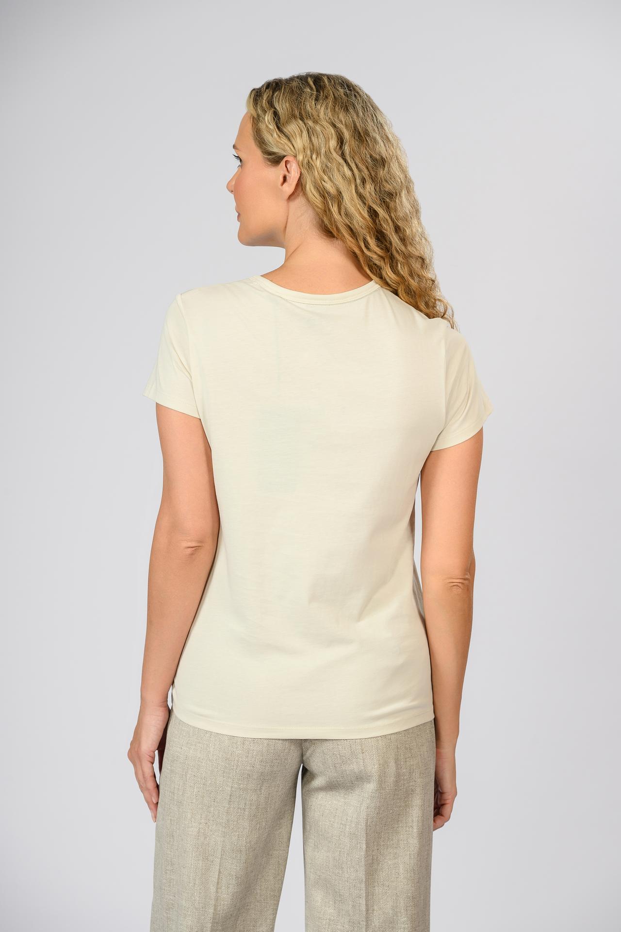 - Изысканный дизайн: Футболка выполнена в элегантном бежевом цвете и дополнена ярким, стильным цветочным принтом на груди, придающим изделию особую изюминку и выразительность.