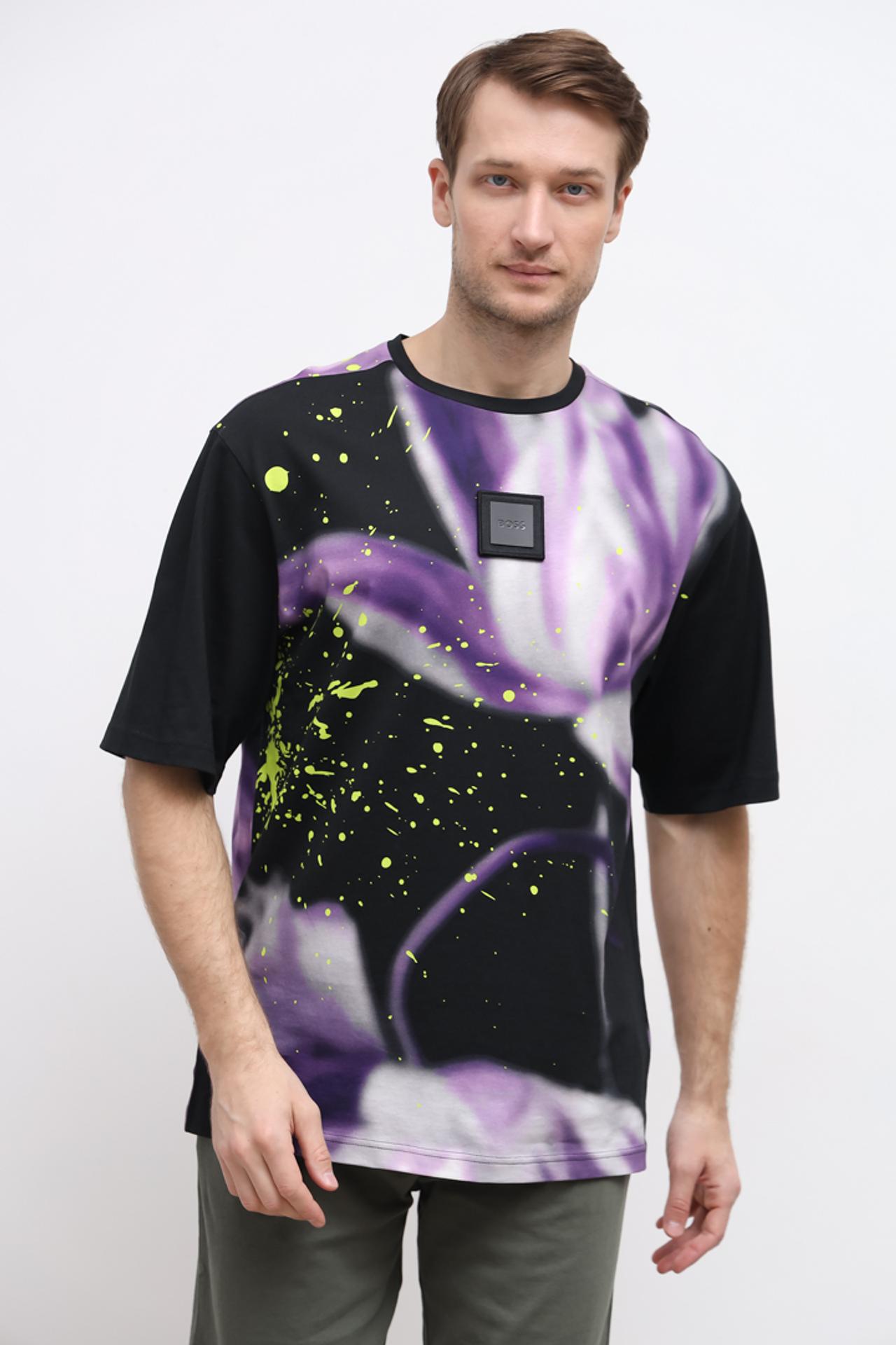 Футболка Boss Green – это стильное сочетание современного дизайна и комфорта. Модель выполнена в черном цвете и украшена эффектным абстрактным принтом с фиолетовыми и лиловыми цветочными мотивами, дополненным яркими желто-зелеными брызгами. На груди расположен фирменный логотип Boss в виде черной квадратной вставки.