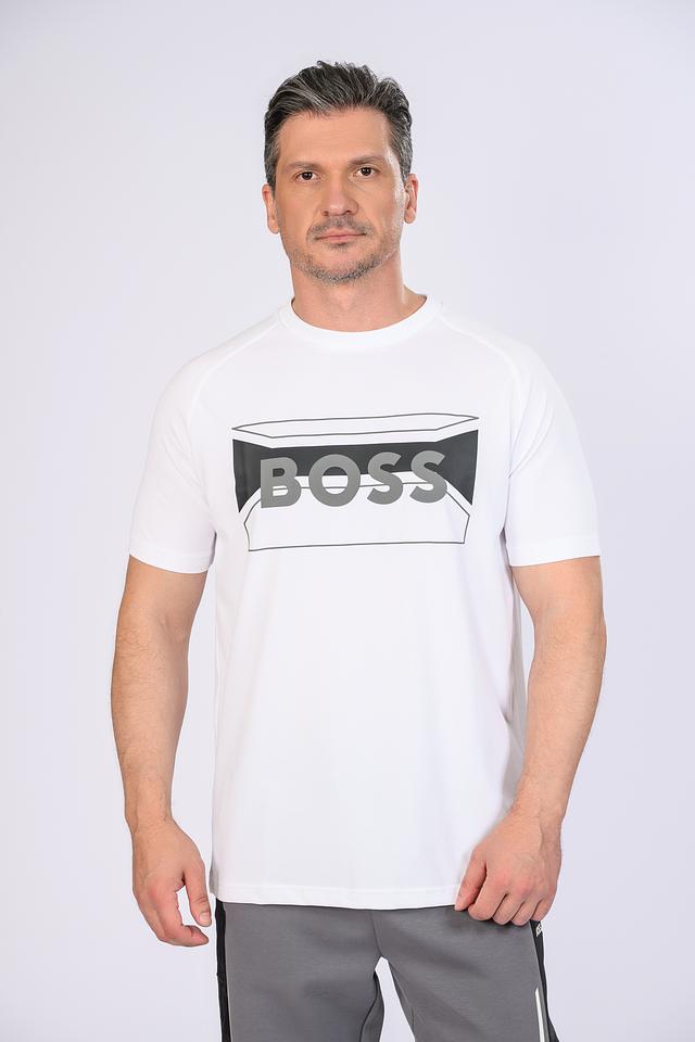 Белая футболка Boss Green с оригинальным графическим принтом логотипа бренда. Изготовлена из комфортного сочетания хлопка, полиэстера и эластана, обеспечивающего удобную посадку и свободу движений. Состав: хлопок 56%, полиэстер 39%, эластан 5%