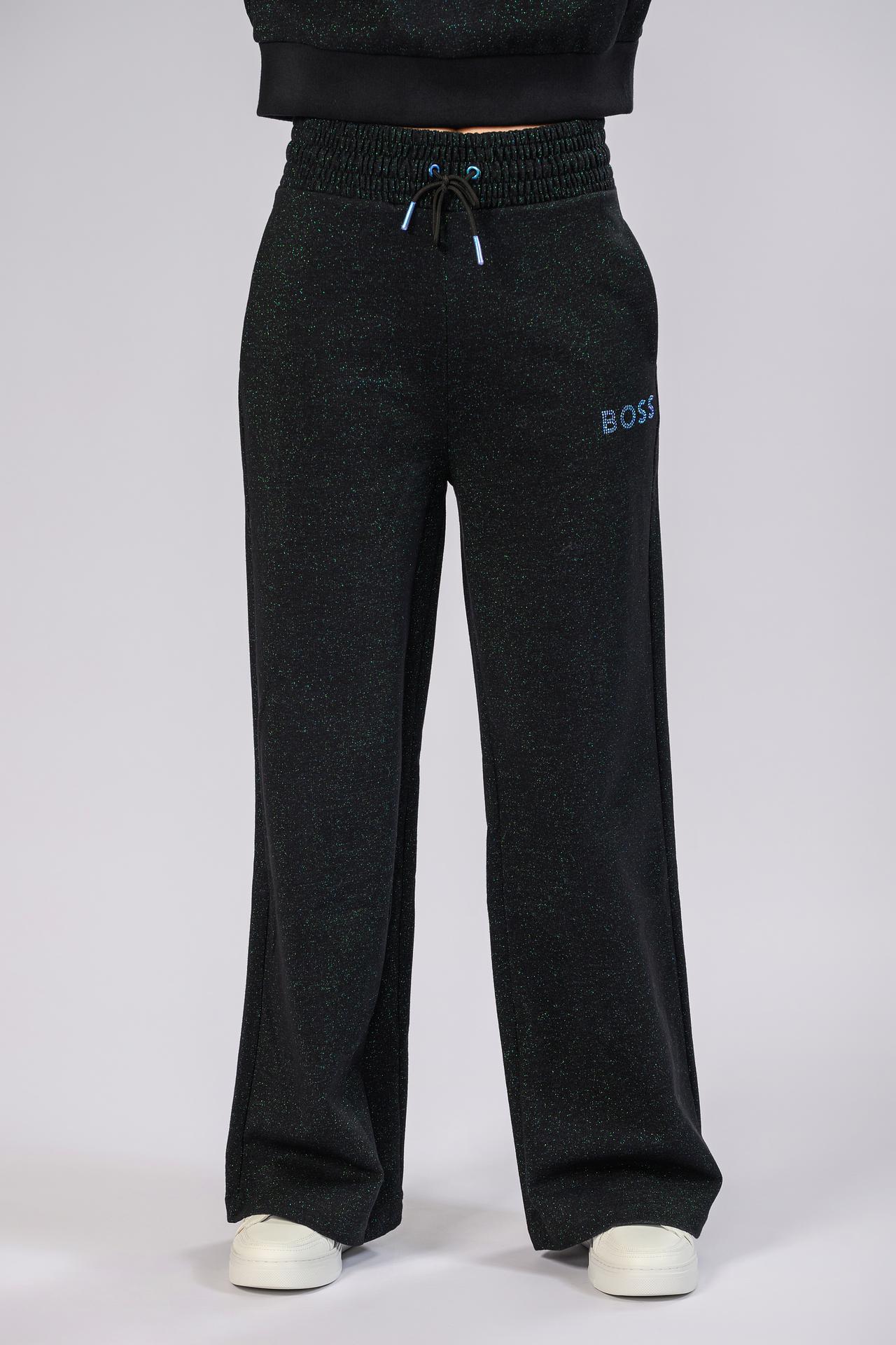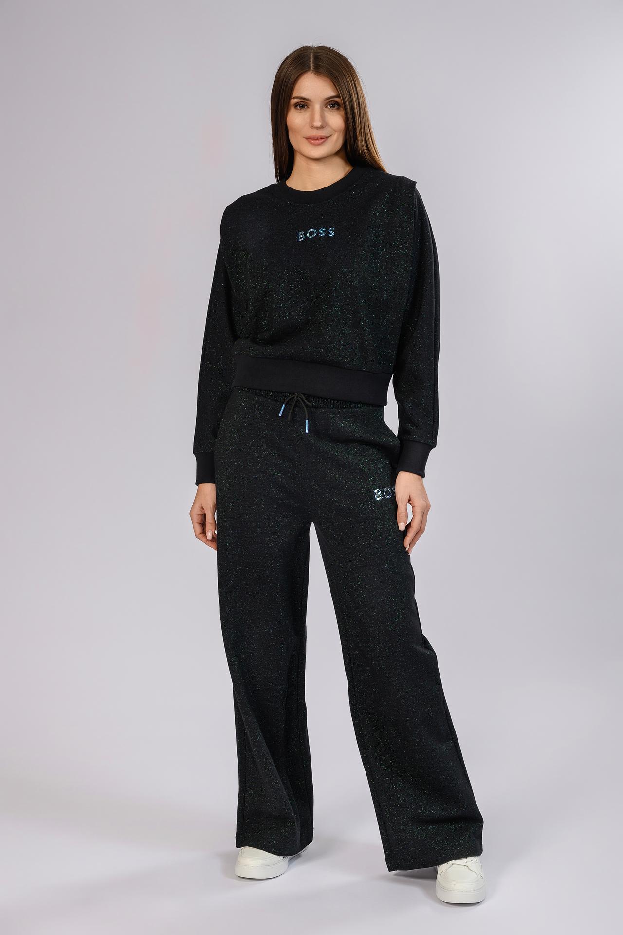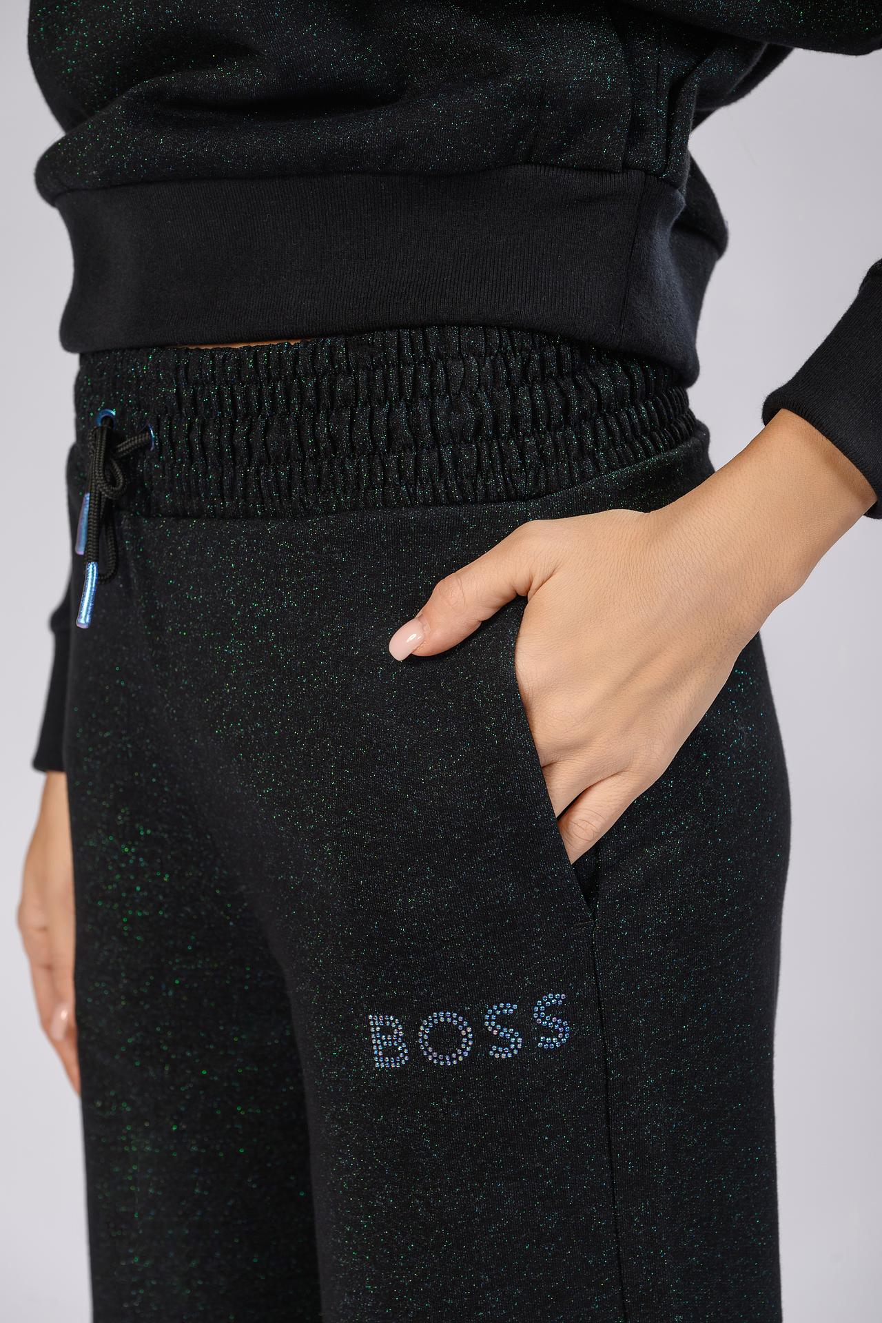 - Детали: Мерцающие вкрапления по всей ткани и логотип BOSS, выложенный стразами. Эти элементы делают брюки особенно эффектными и модными.