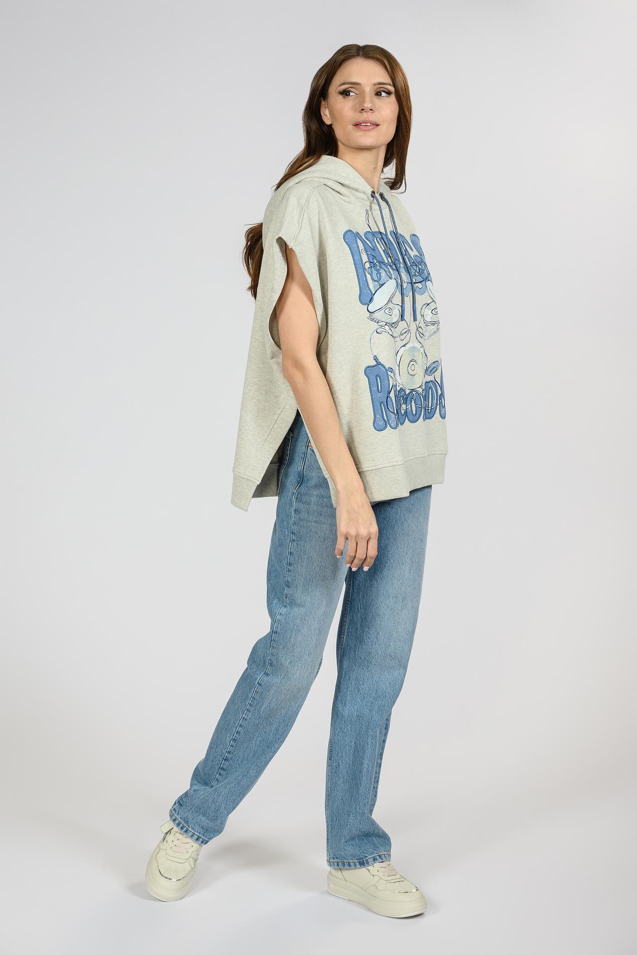 Особенностью модели является оригинальный принт с надписью "INDIGO RECORDS", выполненный в винтажном стиле, и удобный капюшон. Рукава отсутствуют, что придает футболке современный и трендовый вид. Боковые разрезы и свободный крой гарантируют максимальный комфорт при движении.