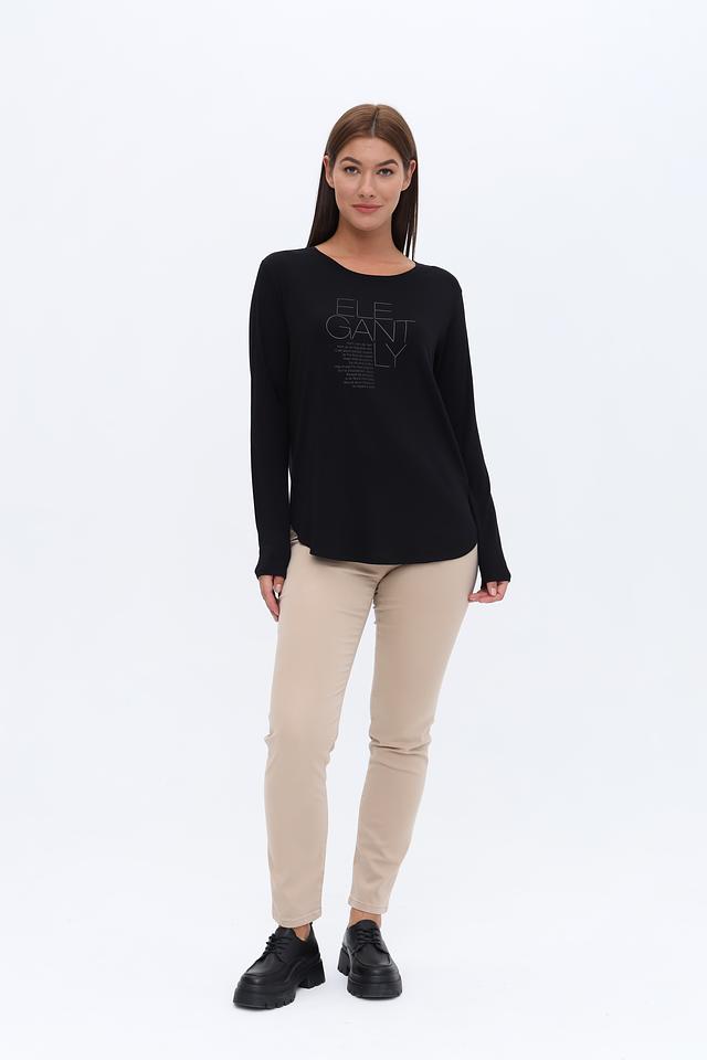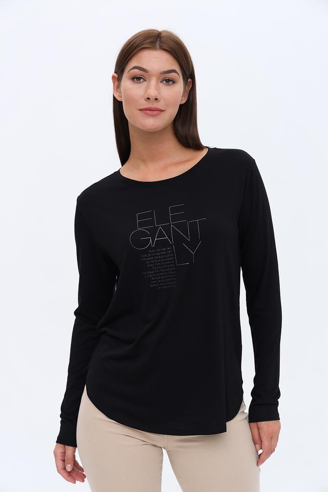 Лонгслив имеет прямой крой и удобную посадку по фигуре. На лицевой стороне расположен эффектный принт с надписью "ELEGANTLY", выполненный в контрастных тонах. Длинные рукава обеспечивают дополнительное тепло в прохладную погоду.