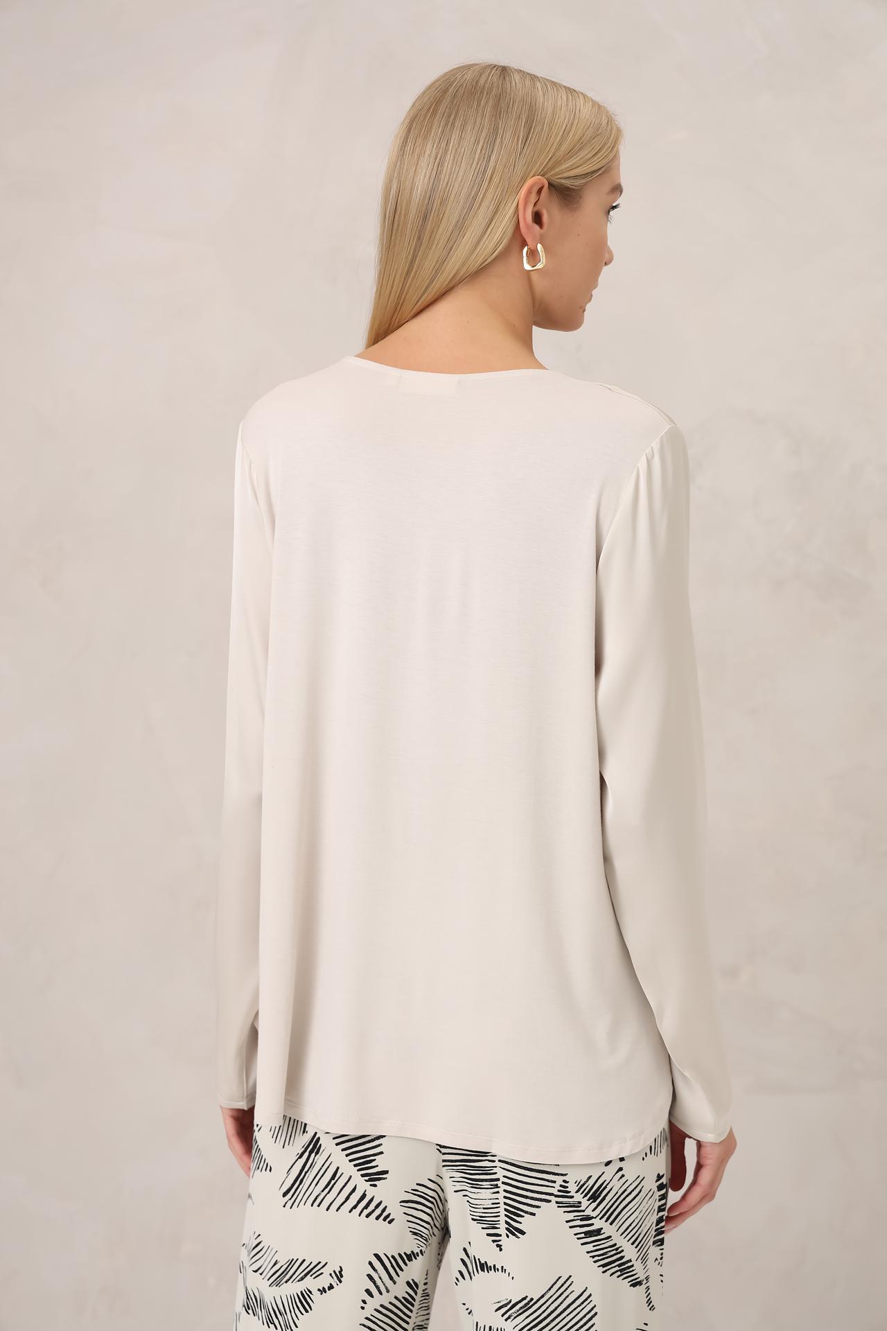 Модель имеет аккуратный V-образный вырез, который деликатно подчеркивает линию шеи, добавляя образу изящества. Свободный крой обеспечивает легкость и непринужденность, не сковывая движений и подходя для различных типов фигуры, создавая расслабленный силуэт.