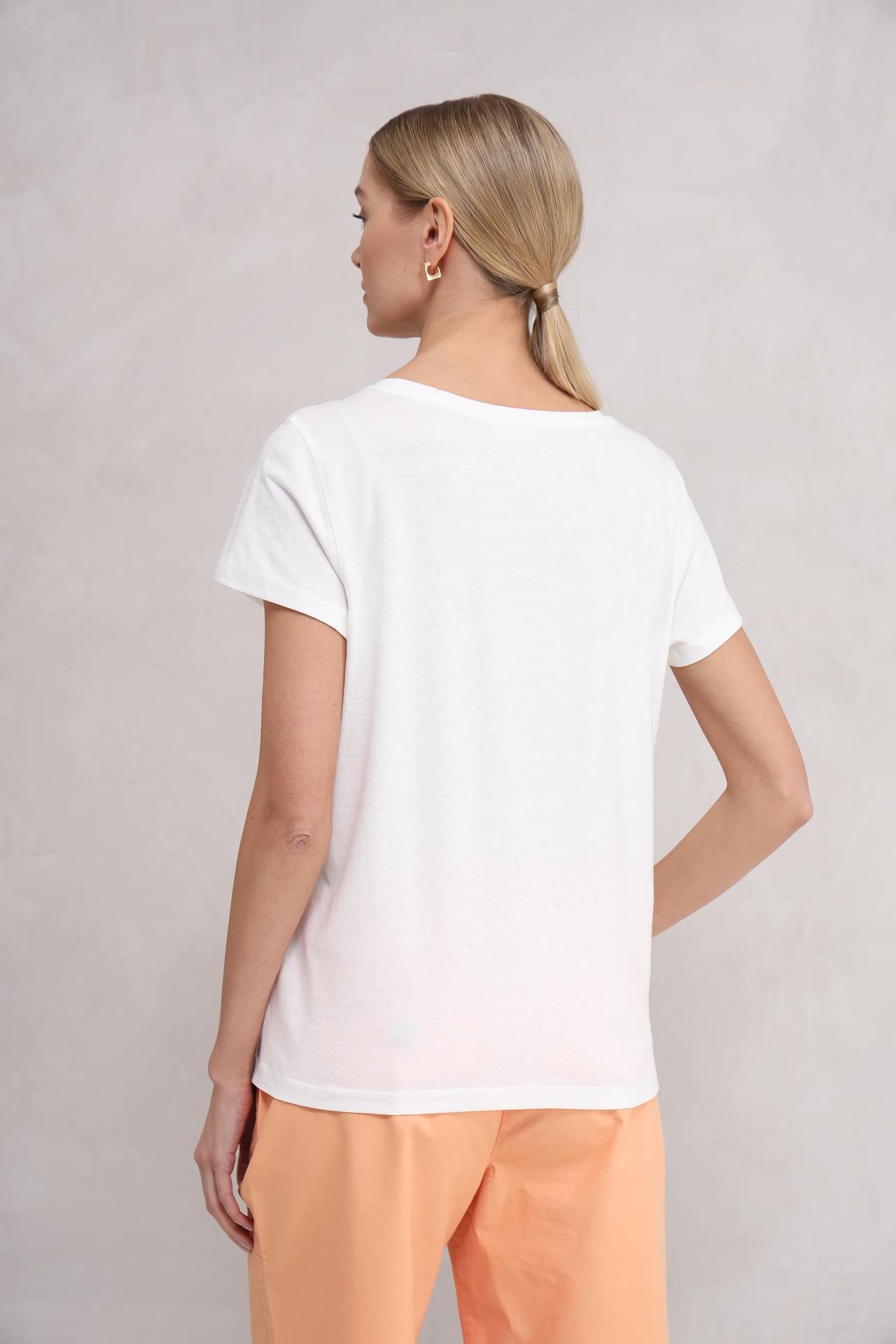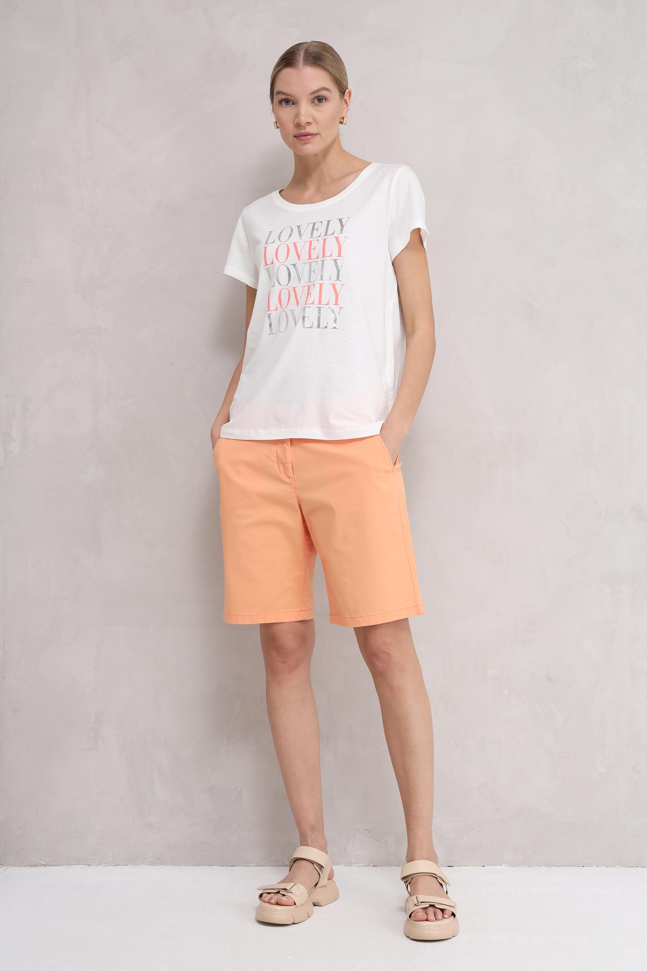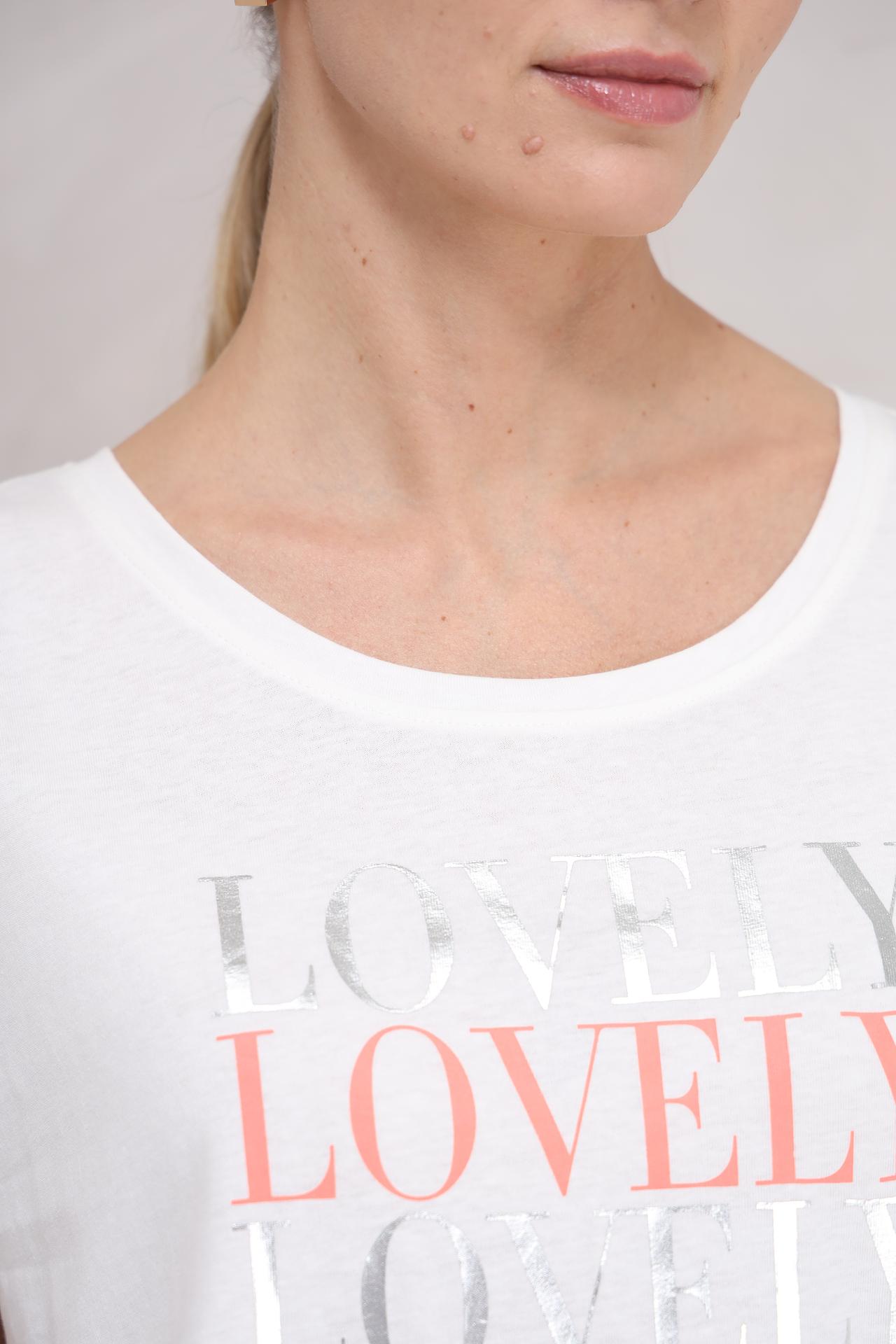 Принт на футболке выполнен в современном стиле и украшен серебристыми и коралловыми надписями. Футболка отлично подойдет для повседневной носки и станет незаменимой вещью в вашем гардеробе.