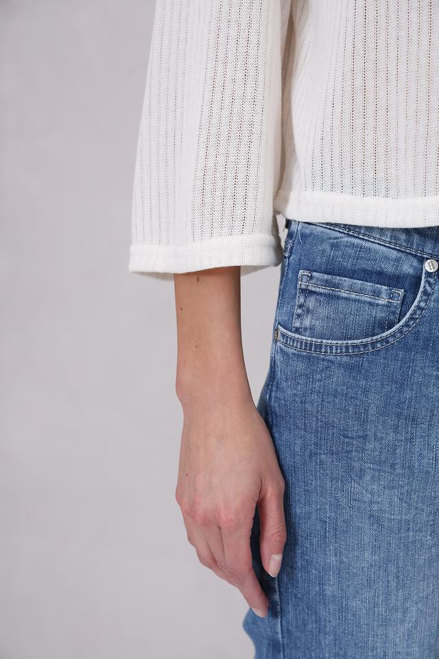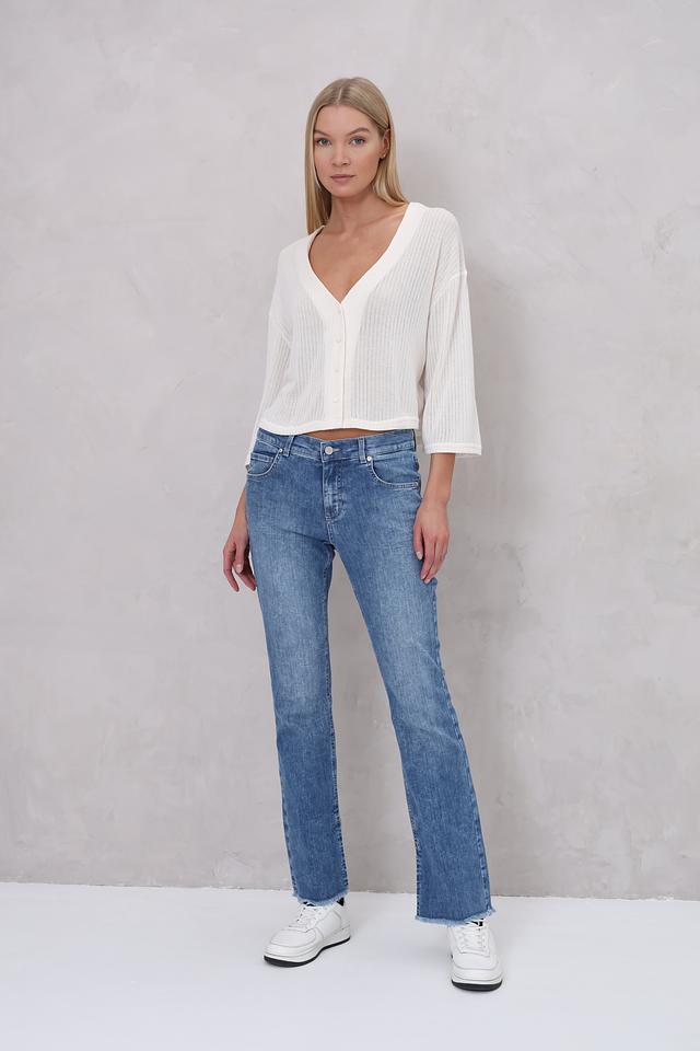 Жакет имеет укороченный крой и V-образный вырез, что визуально вытягивает силуэт. Рукава 3/4 придают образу лёгкость и непринуждённость. Застёжка выполнена на ряд пуговиц в тон изделию.