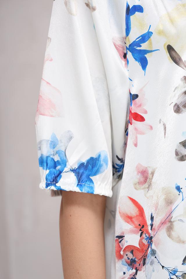 Модель имеет V-образный вырез, короткие рукава и свободный крой, обеспечивающий комфорт в носке. Юбка платья собрана, что создает красивую драпировку и подчеркивает женственность силуэта.