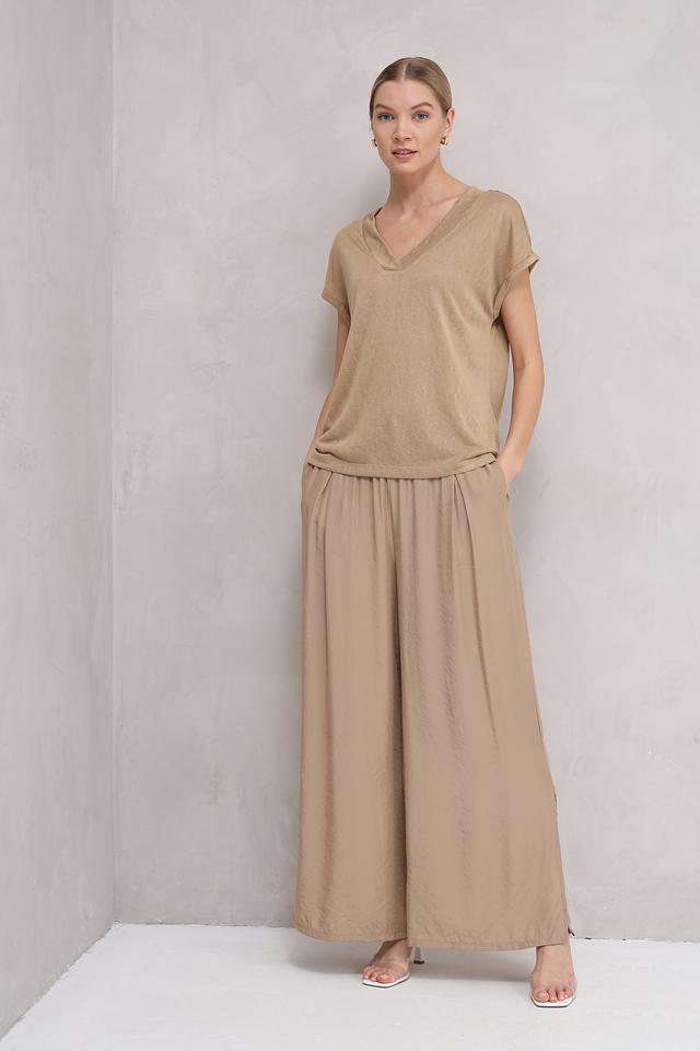 Топ имеет классический V-образный вырез, который визуально удлиняет шею и подчеркивает линию декольте. Короткие рукава делают его идеальным выбором для теплой погоды. Свободный крой обеспечивает комфорт и свободу движений.