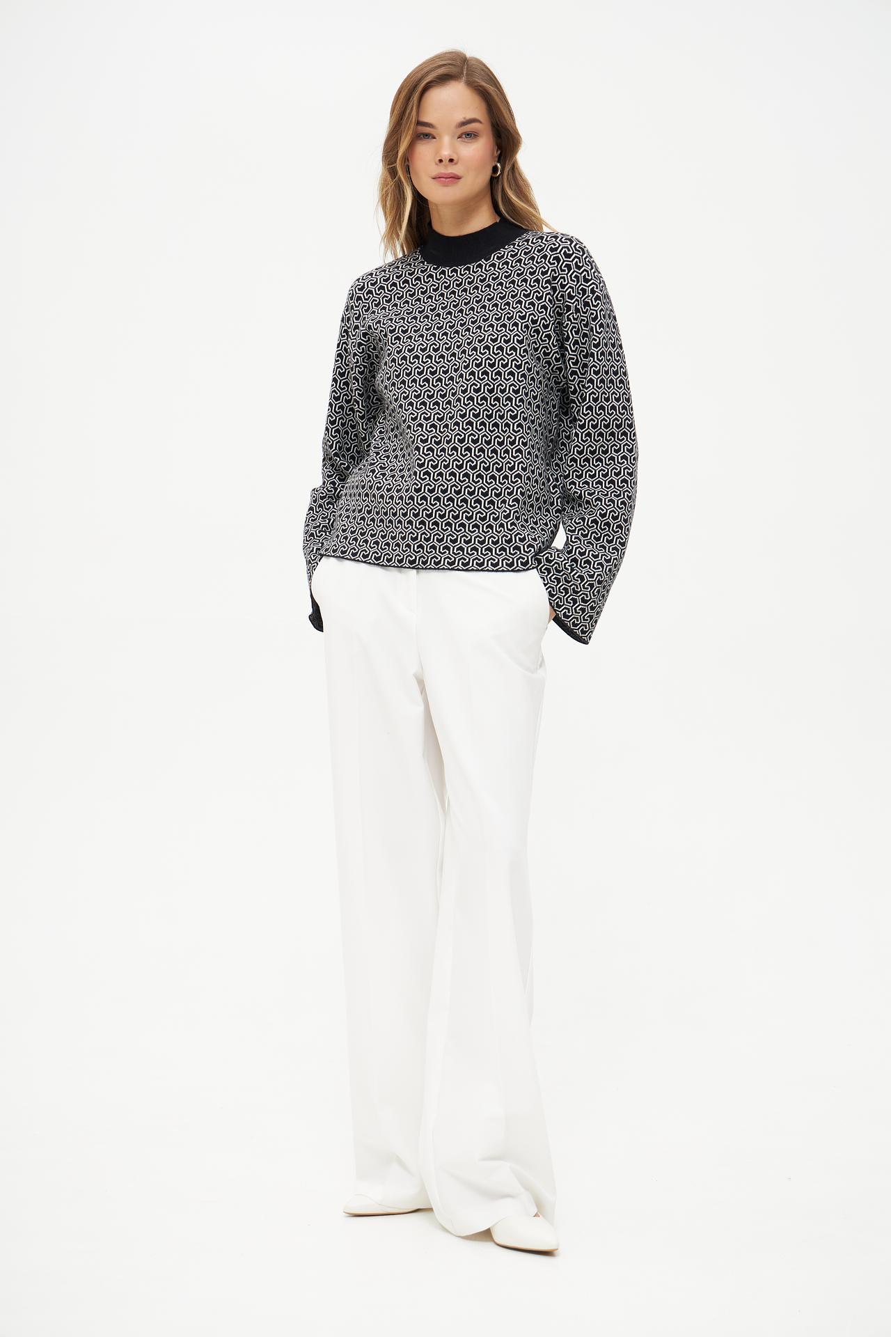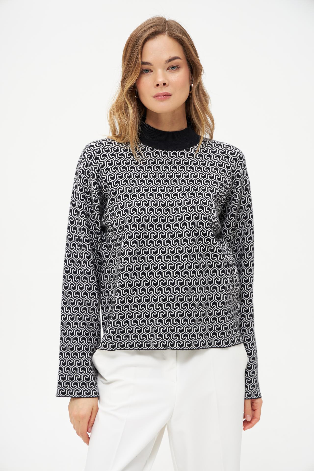- Дизайн: Пуловер украшен оригинальным черно-белым геометрическим принтом, который придает ему современный и стильный вид. Классический крой и высокий воротник-гольф делают эту модель универсальной.