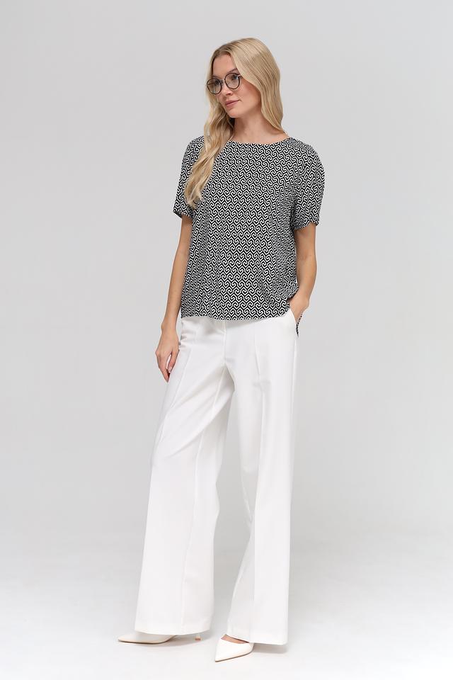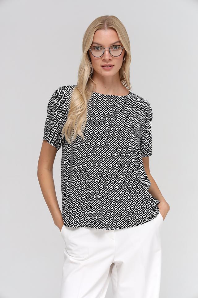 Блуза имеет прямой крой, короткие рукава и круглый вырез горловины. Она прекрасно сочетается с брюками, юбками и джинсами, позволяя создавать разнообразные комплекты для работы, отдыха или особых случаев.