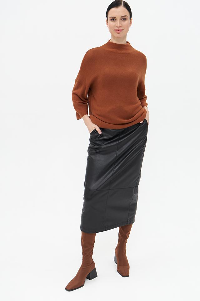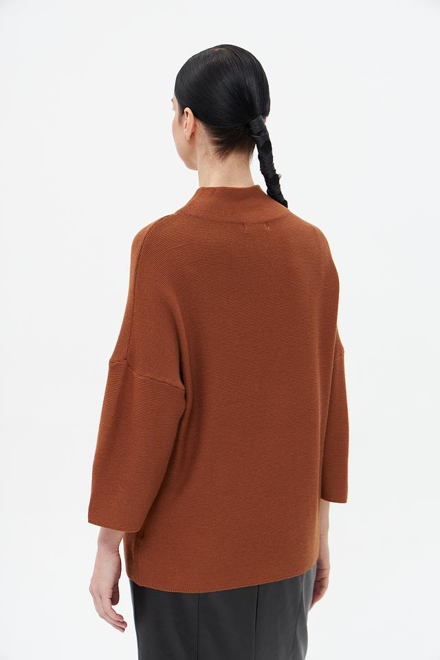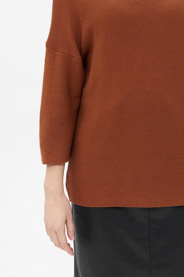 Пуловер имеет прямой крой, воротник-стойку и рукав три четверти, что придает ему современный и элегантный вид. Кофейный цвет изделия легко сочетается с различными элементами одежды, позволяя создавать разнообразные образы.