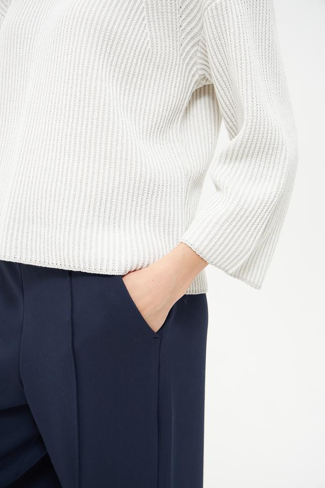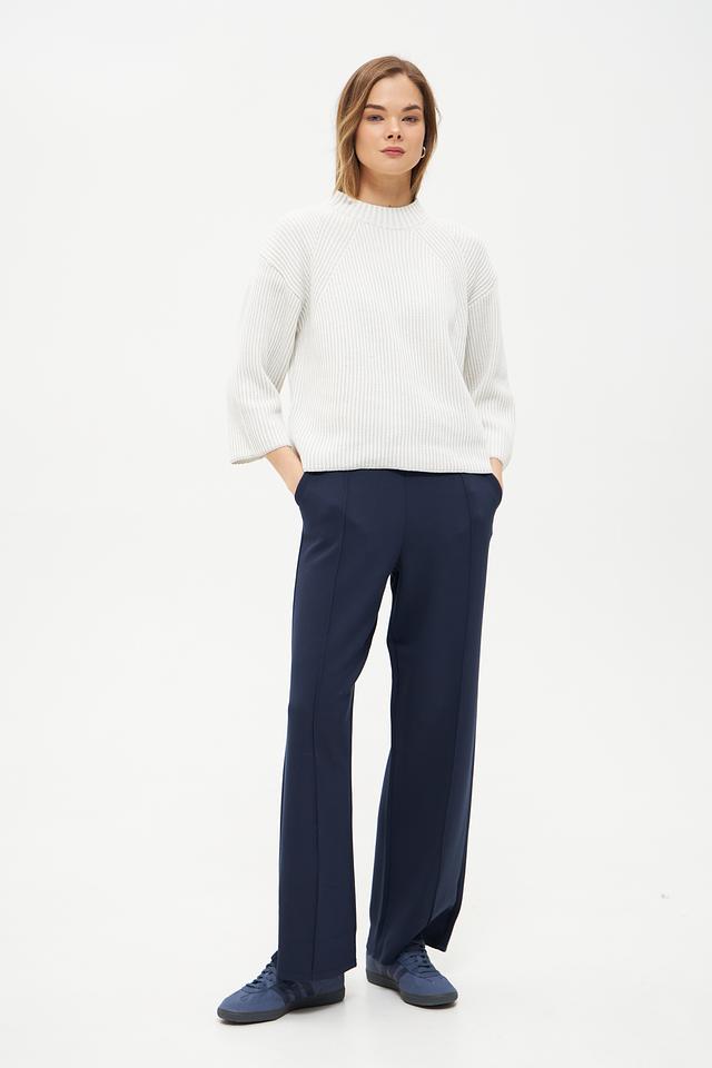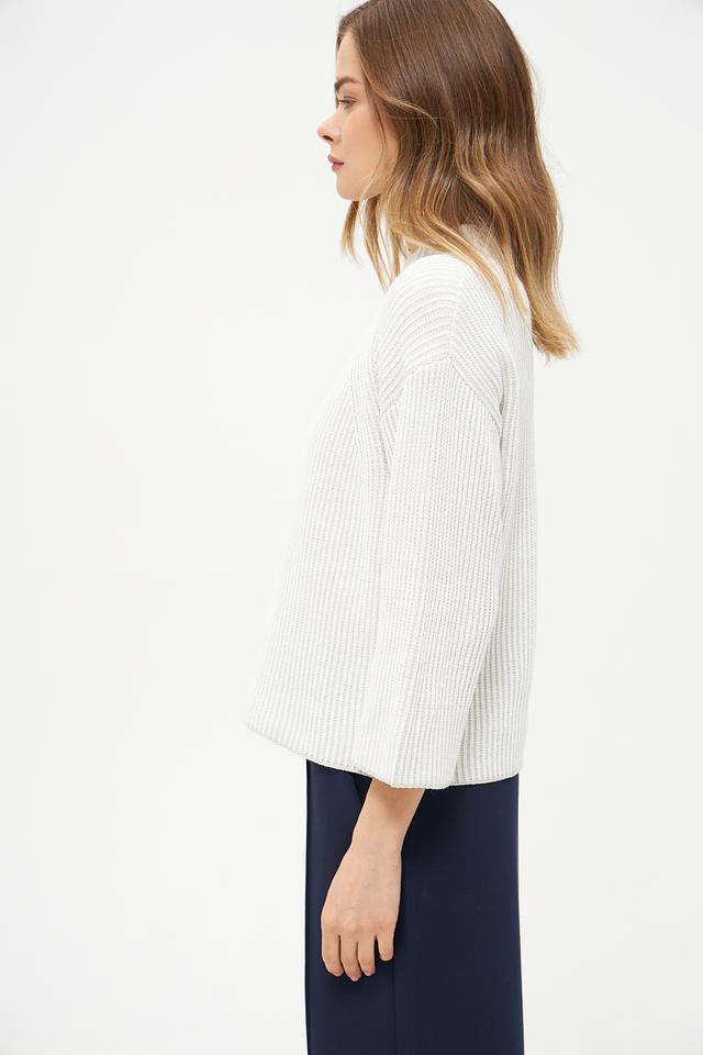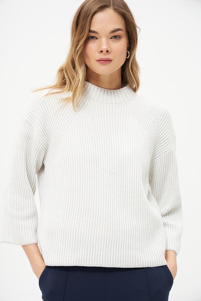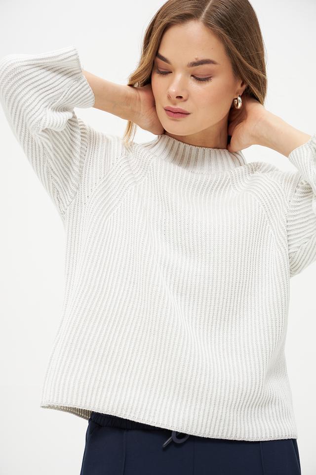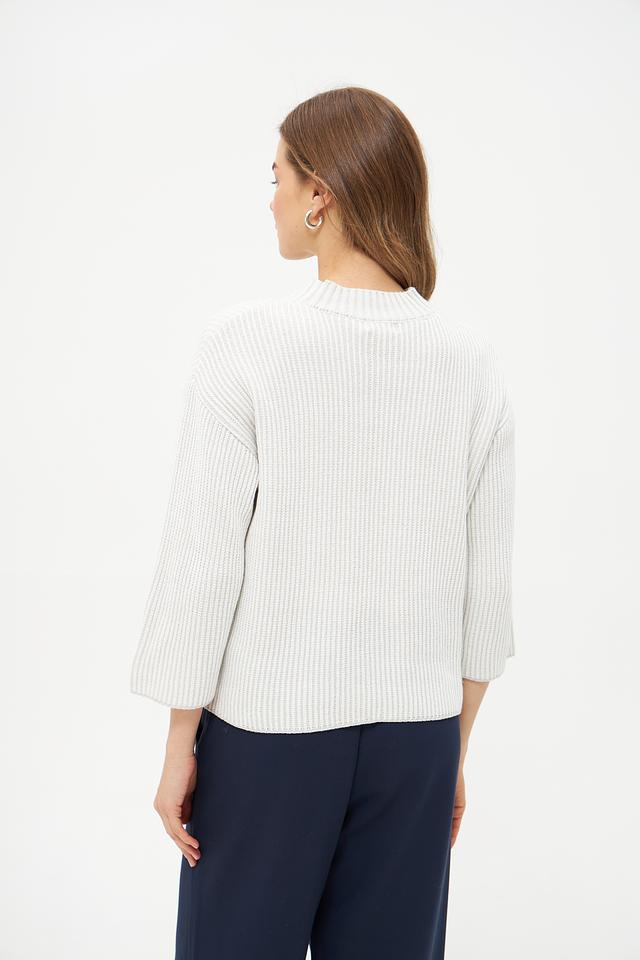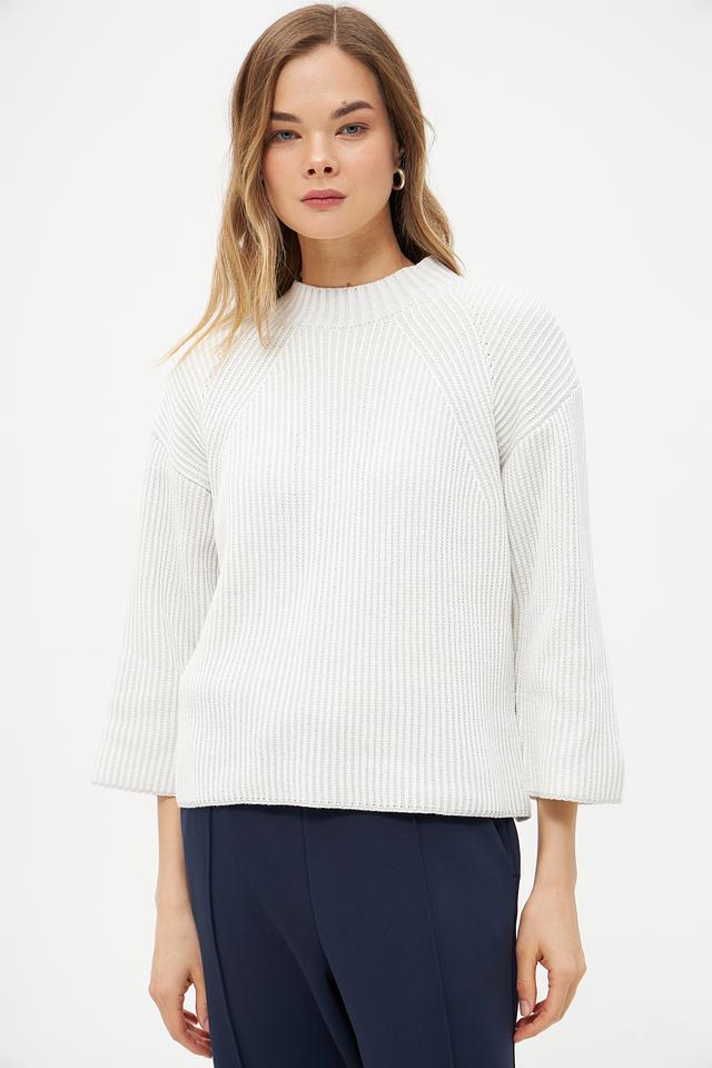 Пуловер имеет молочный цвет и украшен рельефным узором в виде кос, придающим ему изысканность и оригинальность. Вырез горловины классической формы, а рукава – три четверти, что делает его подходящим для любого времени года.